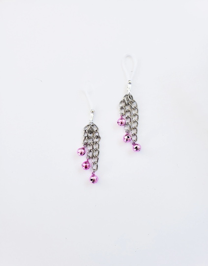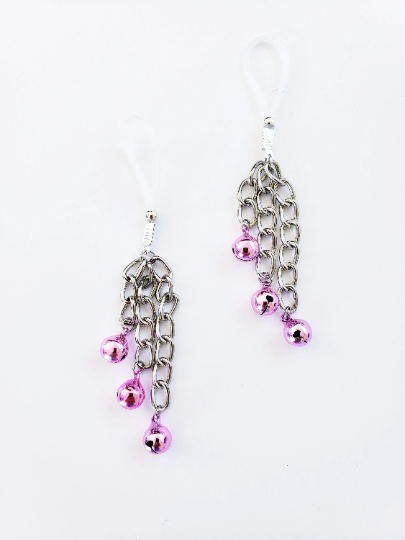 Chain and Bell Nipple Dangles on Non Piercing Nipple Nooses (as shown) or choose to feel the sting with one of our five types of nipple clamps. Adjustable, Tweezer, Alligator, C Clamps, or Clover Clamps.