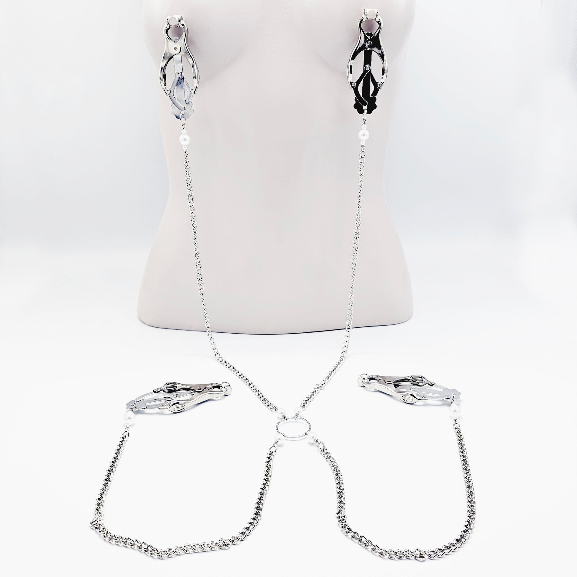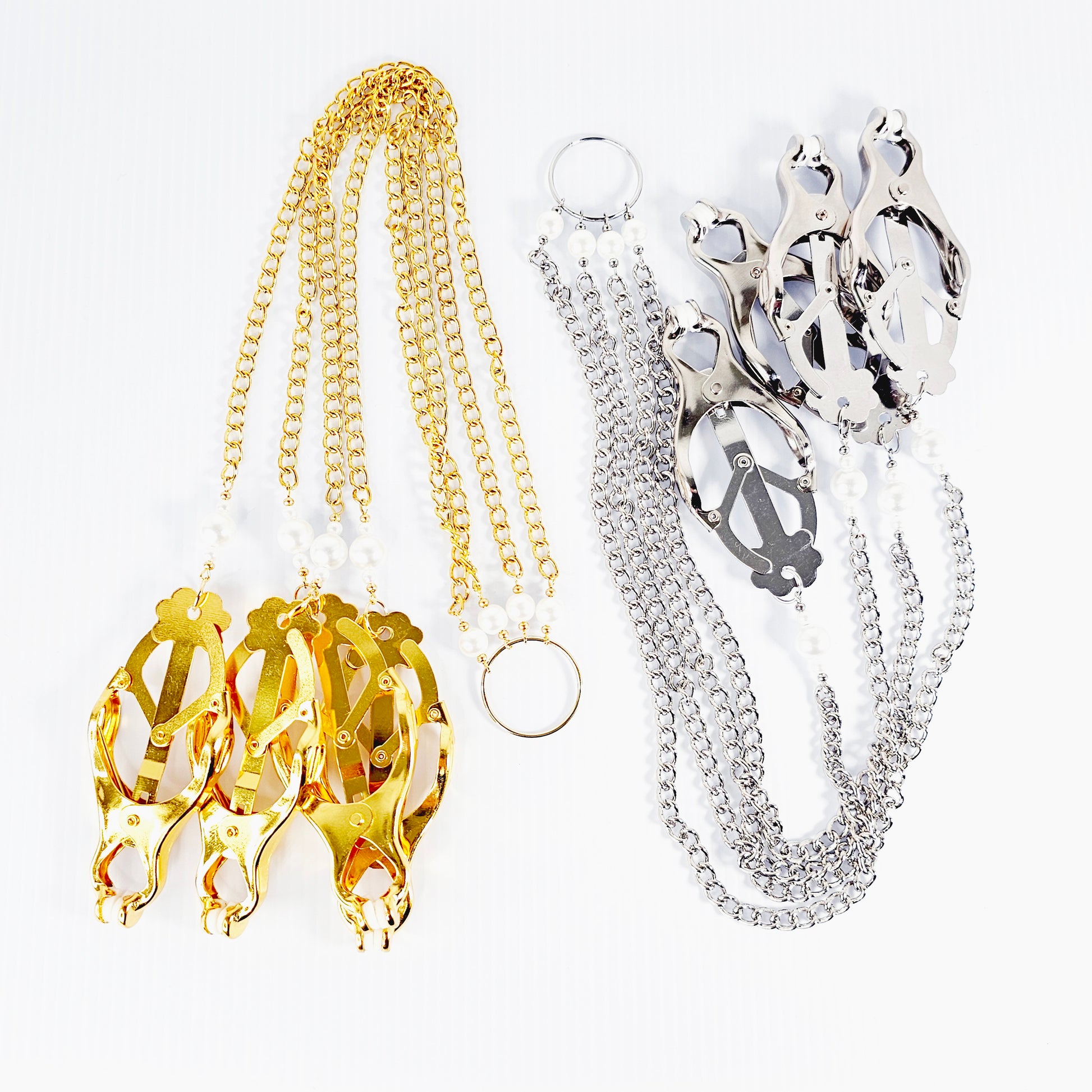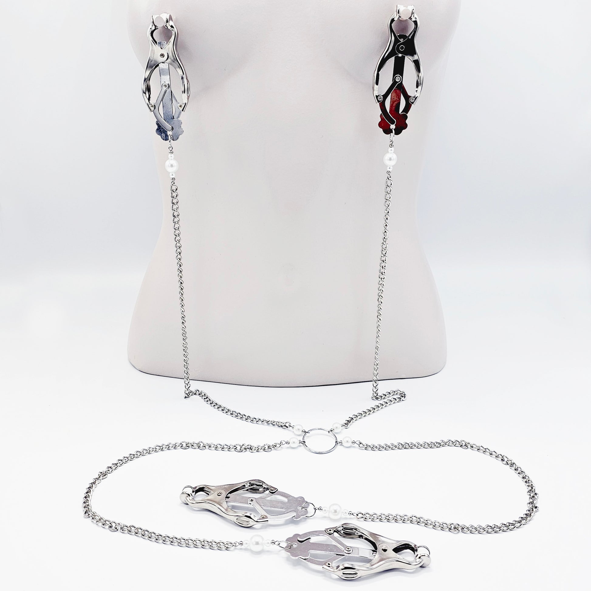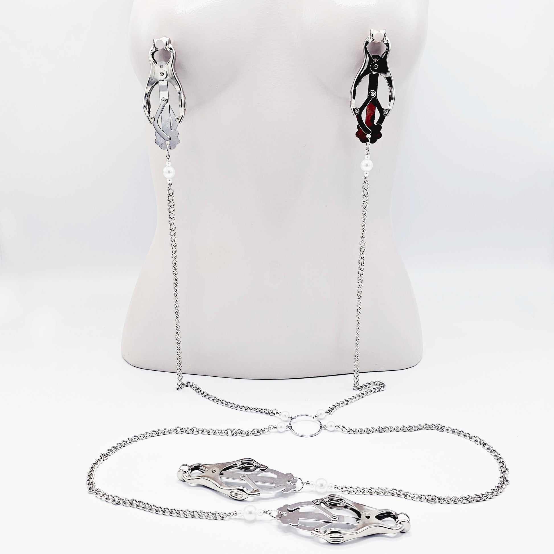 Chain Attached Nipple and Labia Clover Clamps with Pearls. Choose Gold or Silver. BDSM, Japanese Clover Clamps