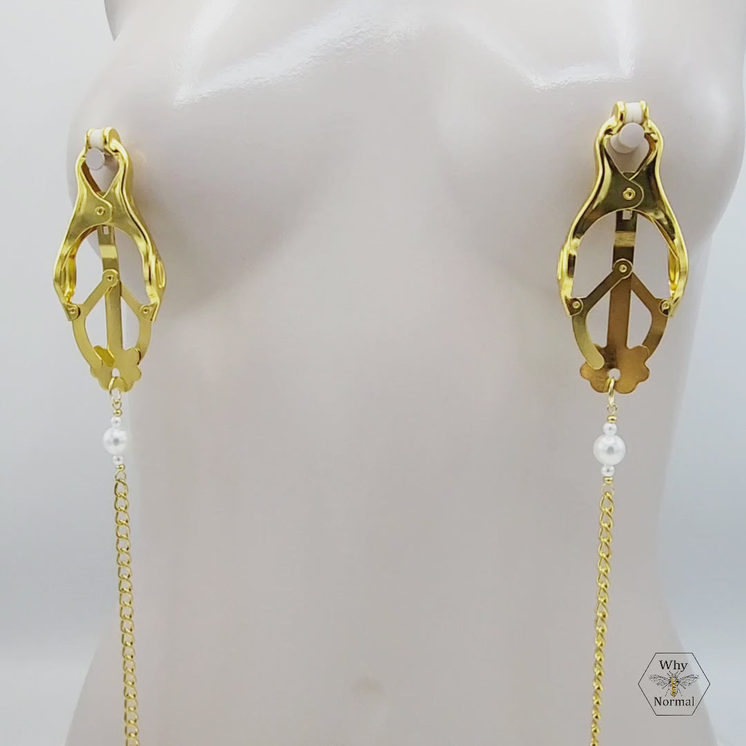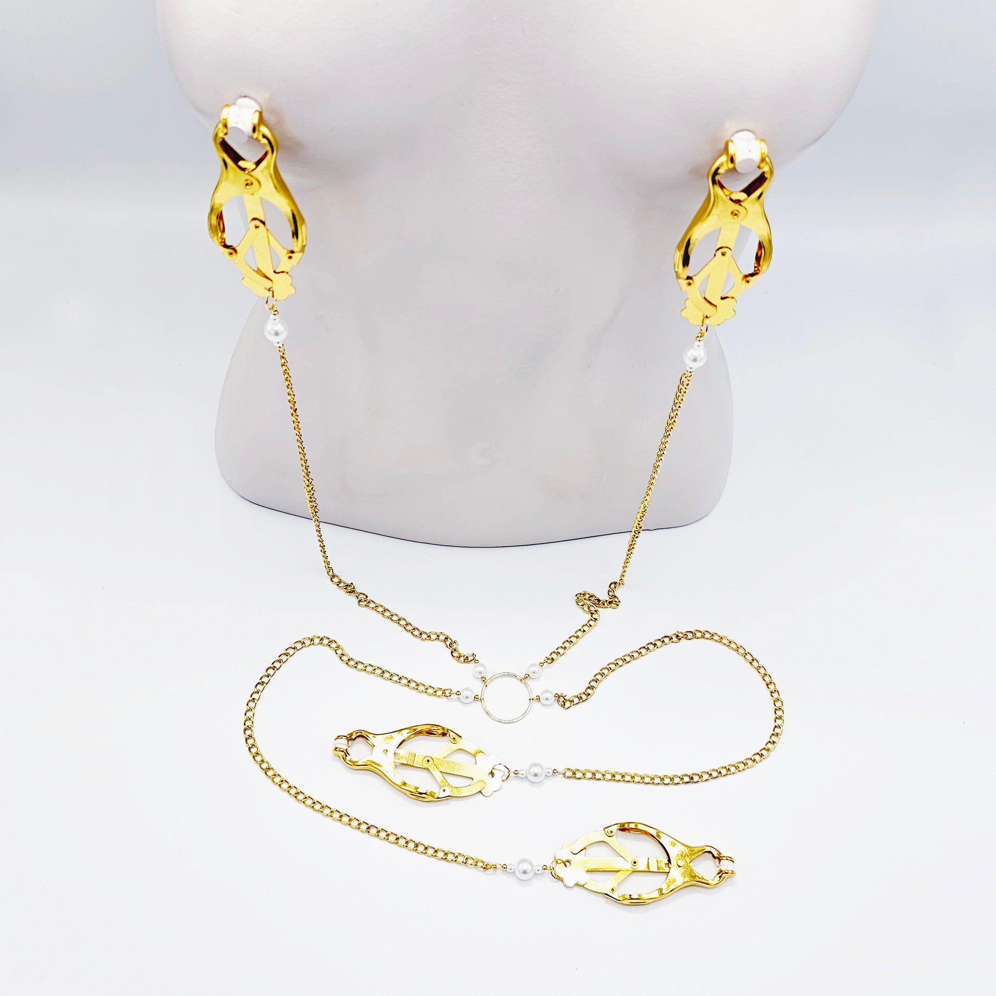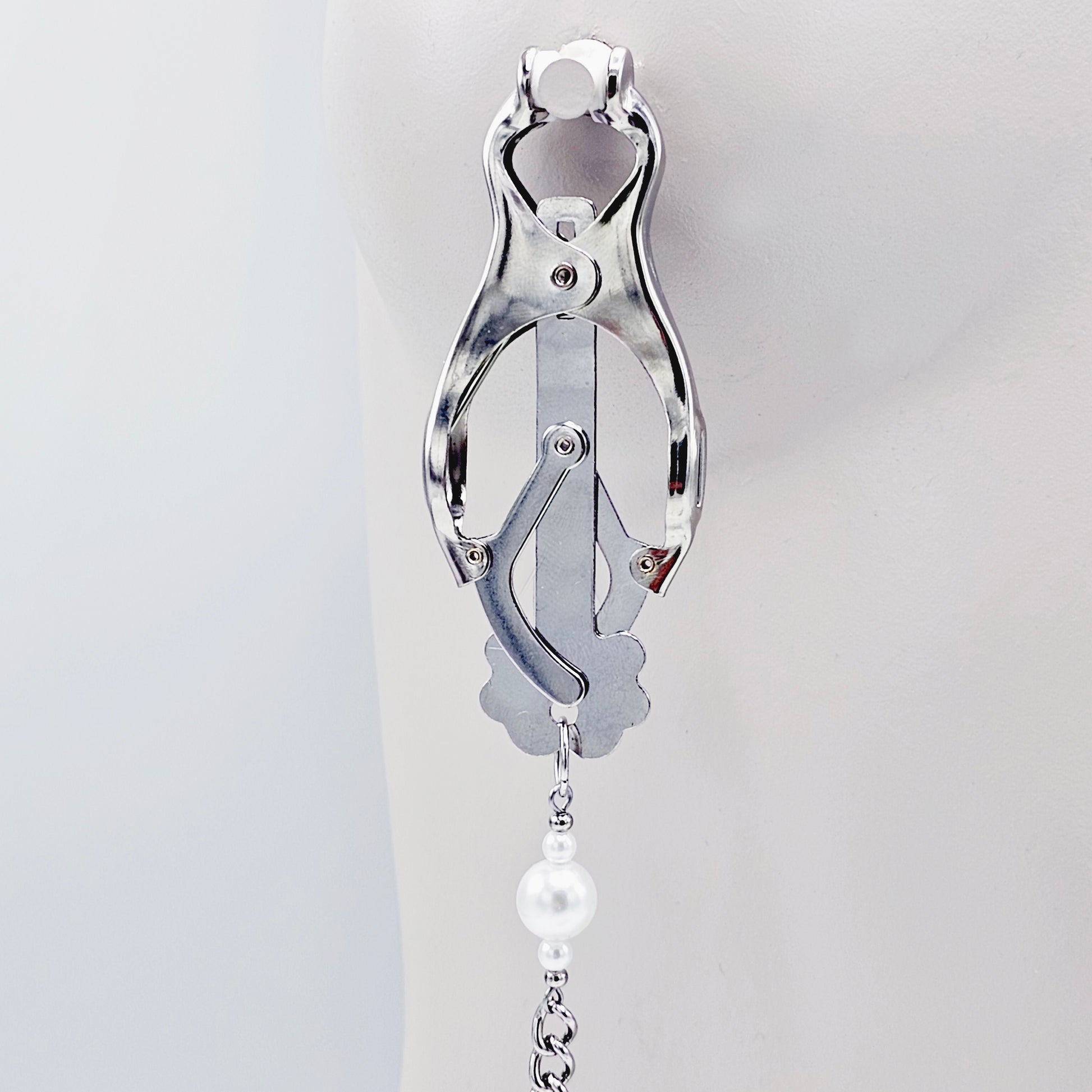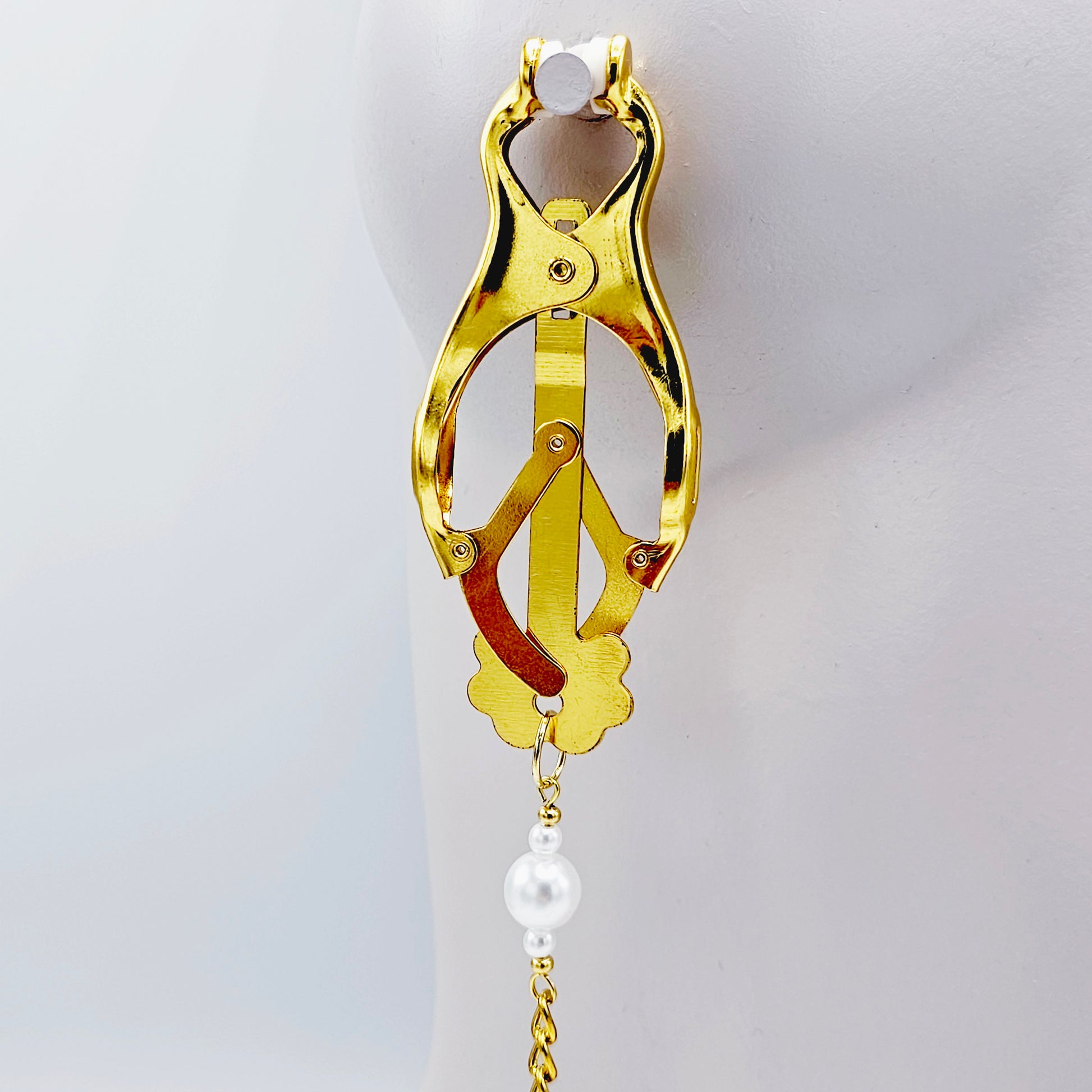 Chain Attached Nipple and Labia Clover Clamps with Pearls. Choose Gold or Silver. BDSM, Japanese Clover Clamps