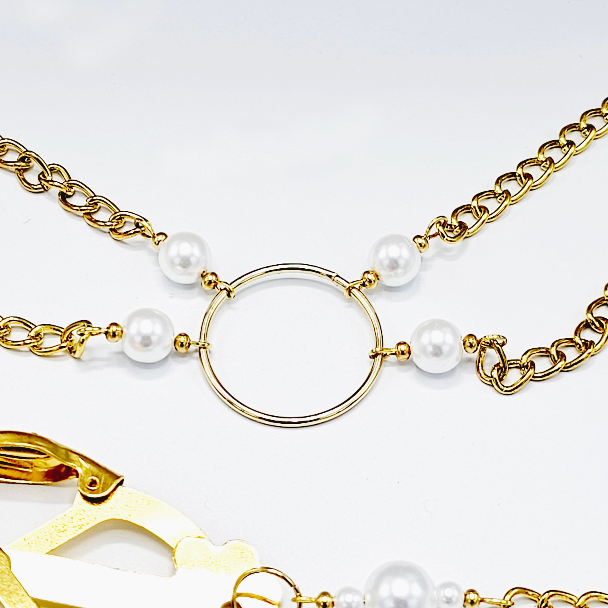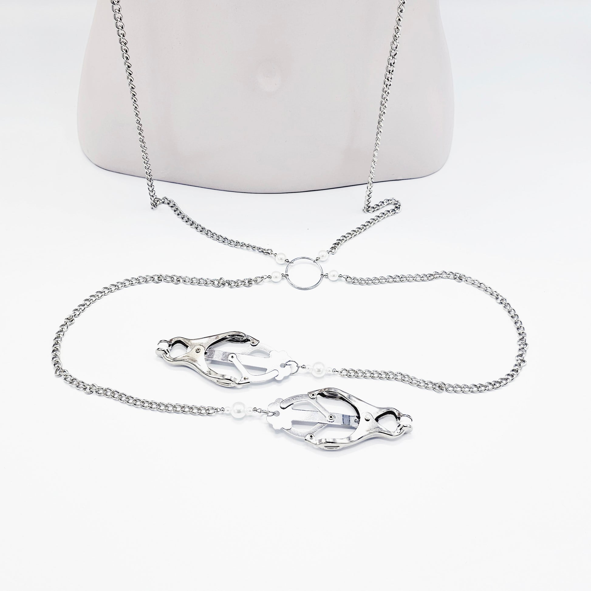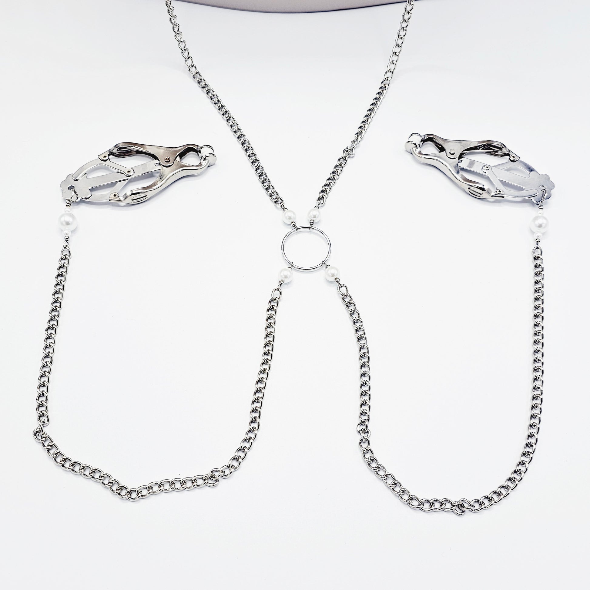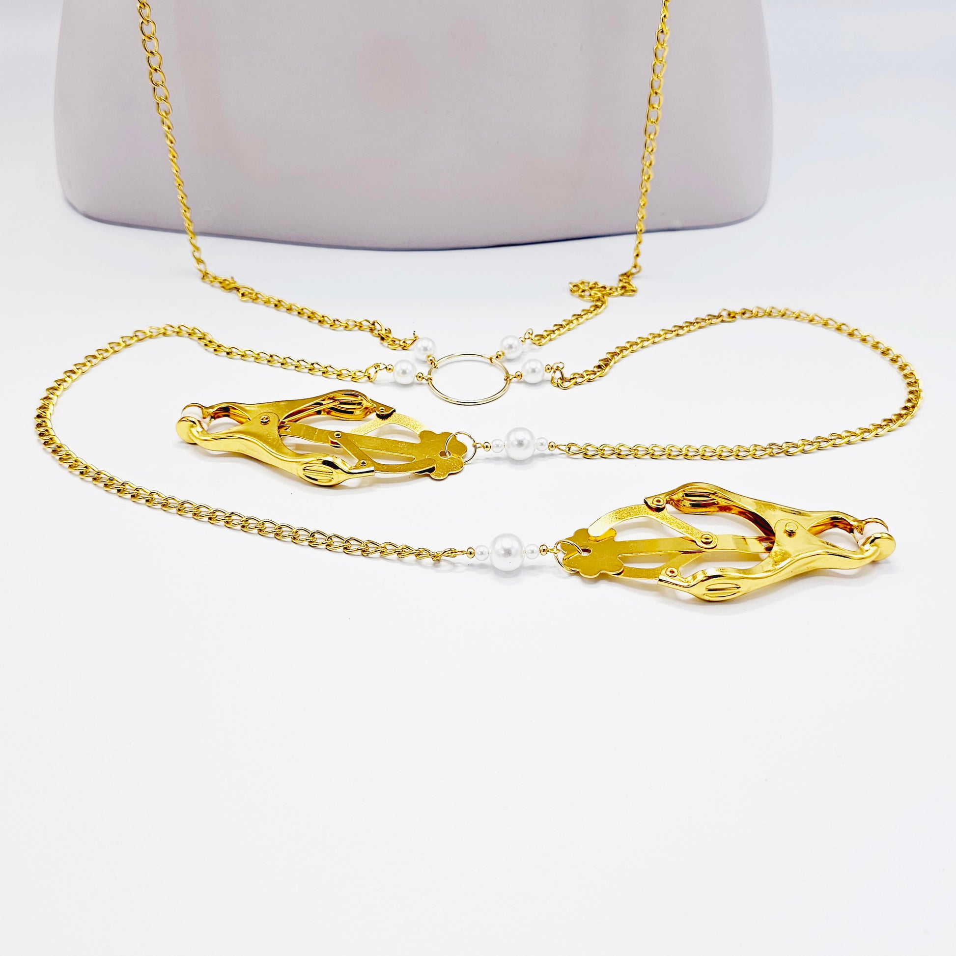Chain Attached Nipple and Labia Clover Clamps with Pearls. Choose Gold or Silver. BDSM, Japanese Clover Clamps