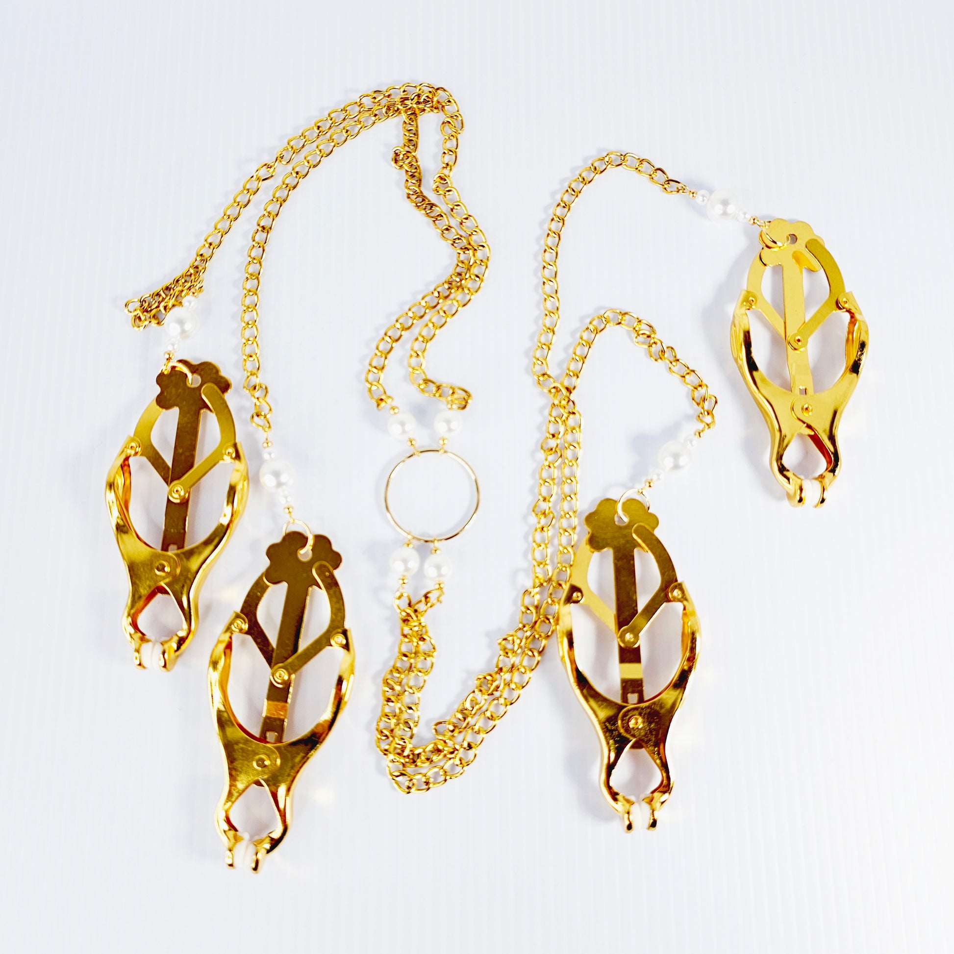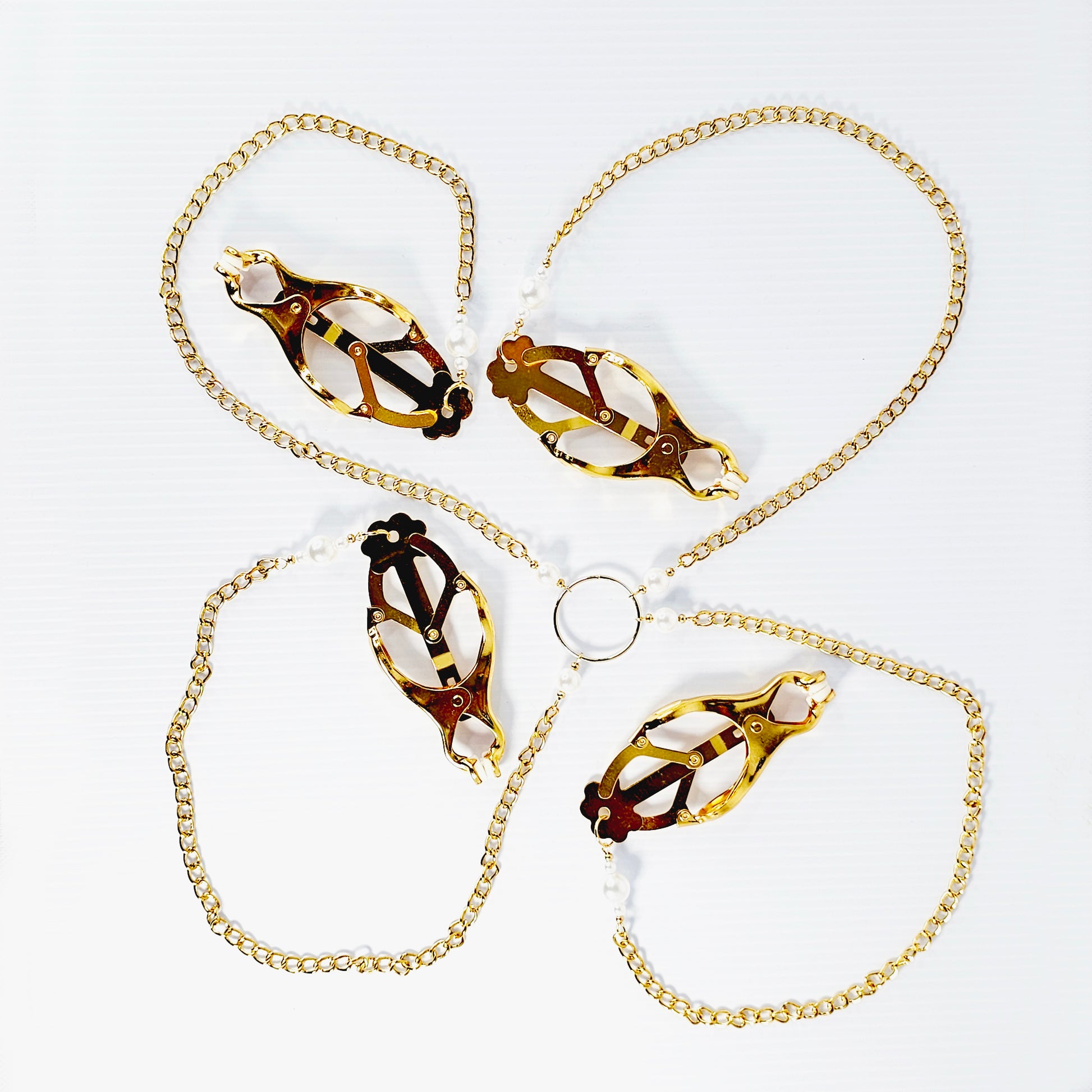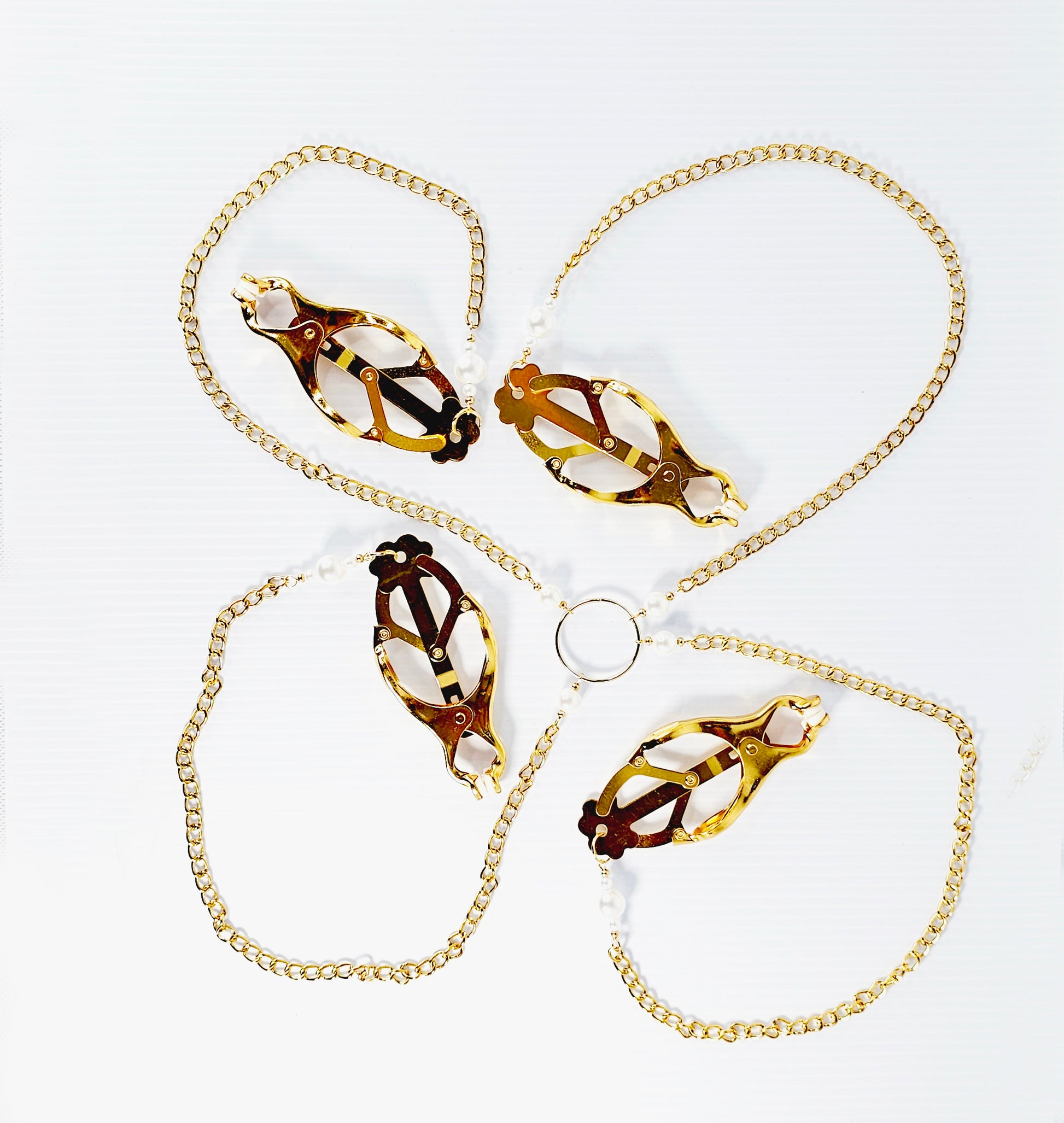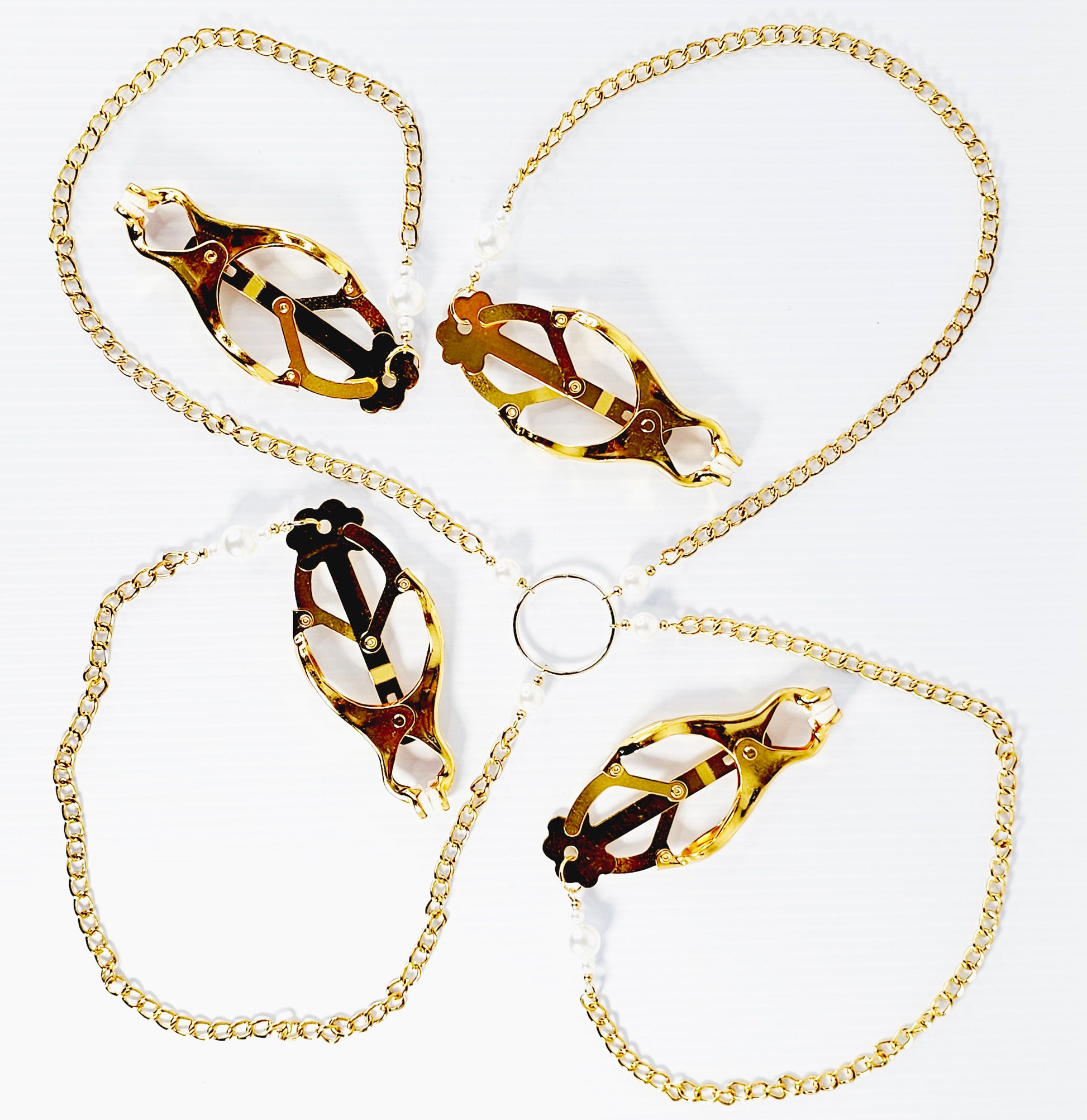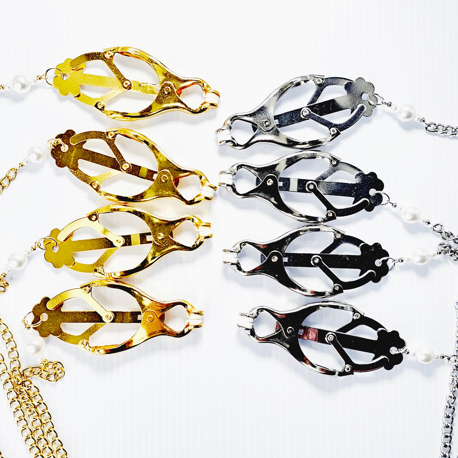 Dare to take your BDSM playtime to the next level with Japanese Clover Nipple and Labia Clamps. Your choice of Gold or Silver. Increase sensation with the attached chains for optional tugging. Add a sense of opulence to your tantalizing moments with white pearls adorning the fierce clover clamps.