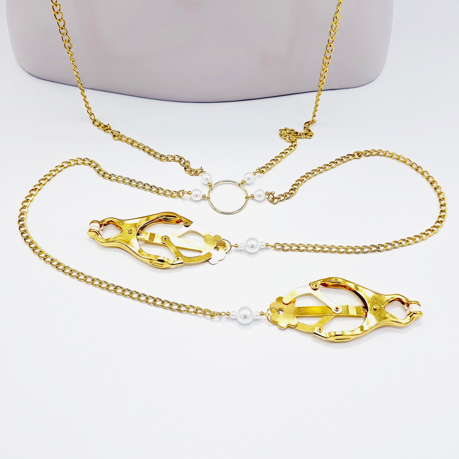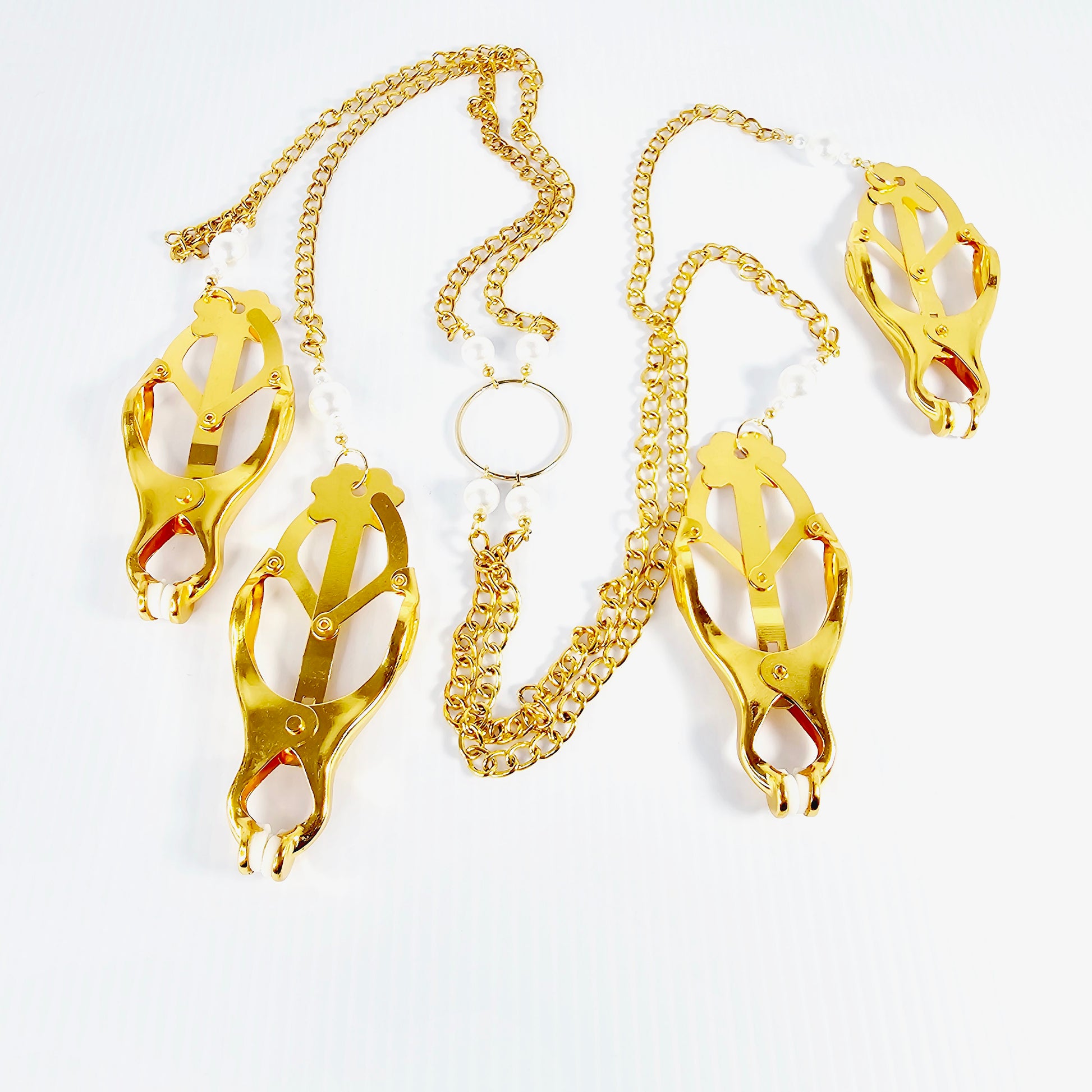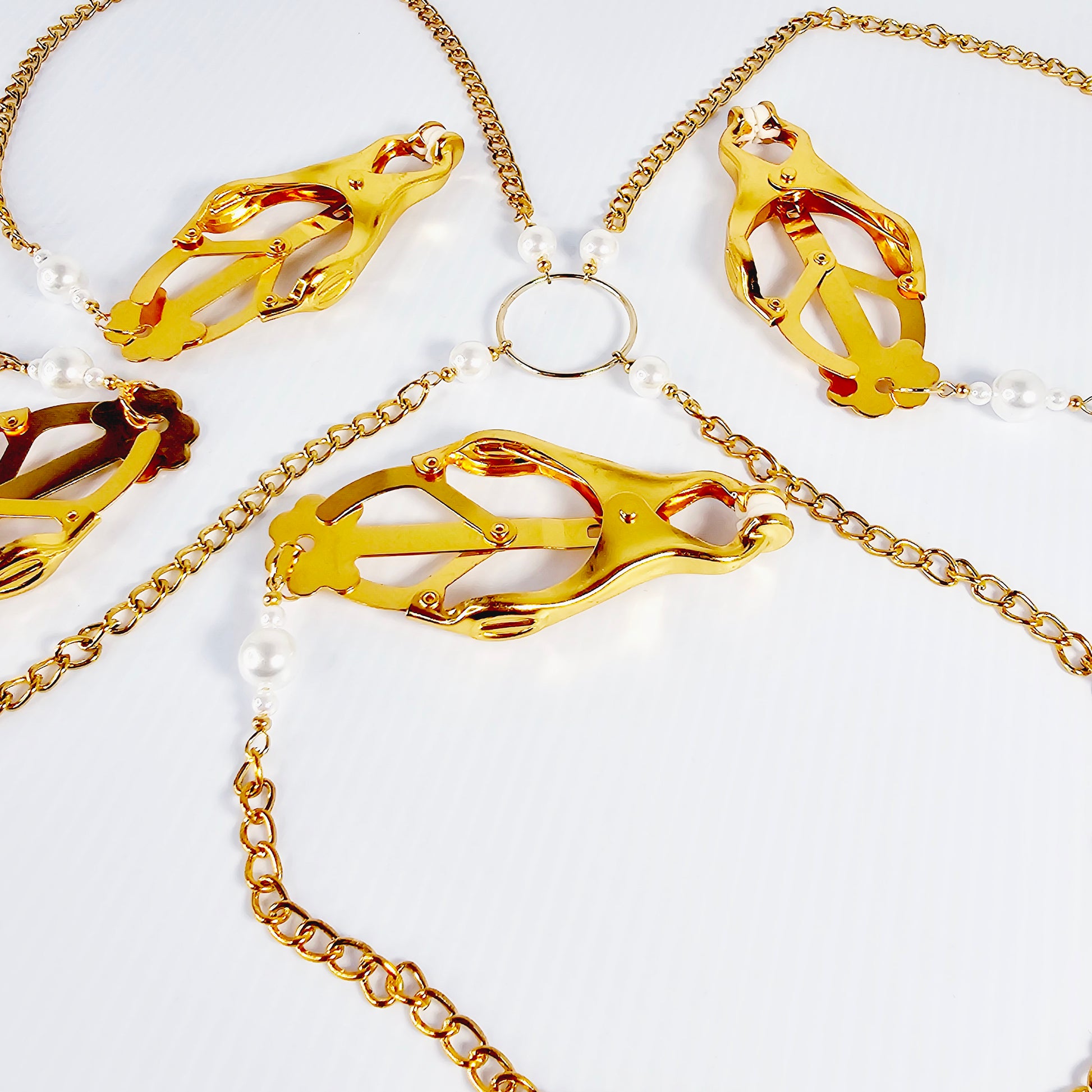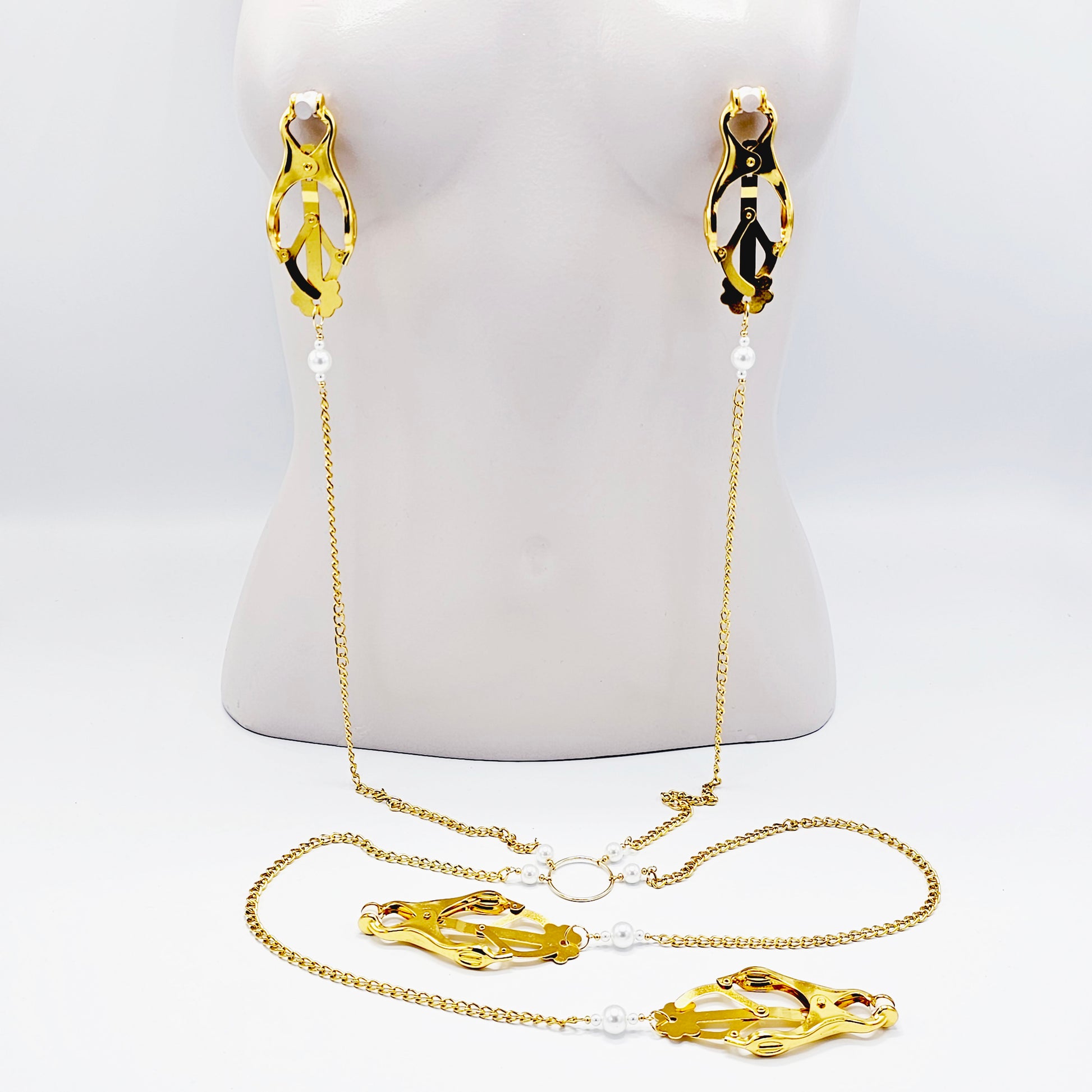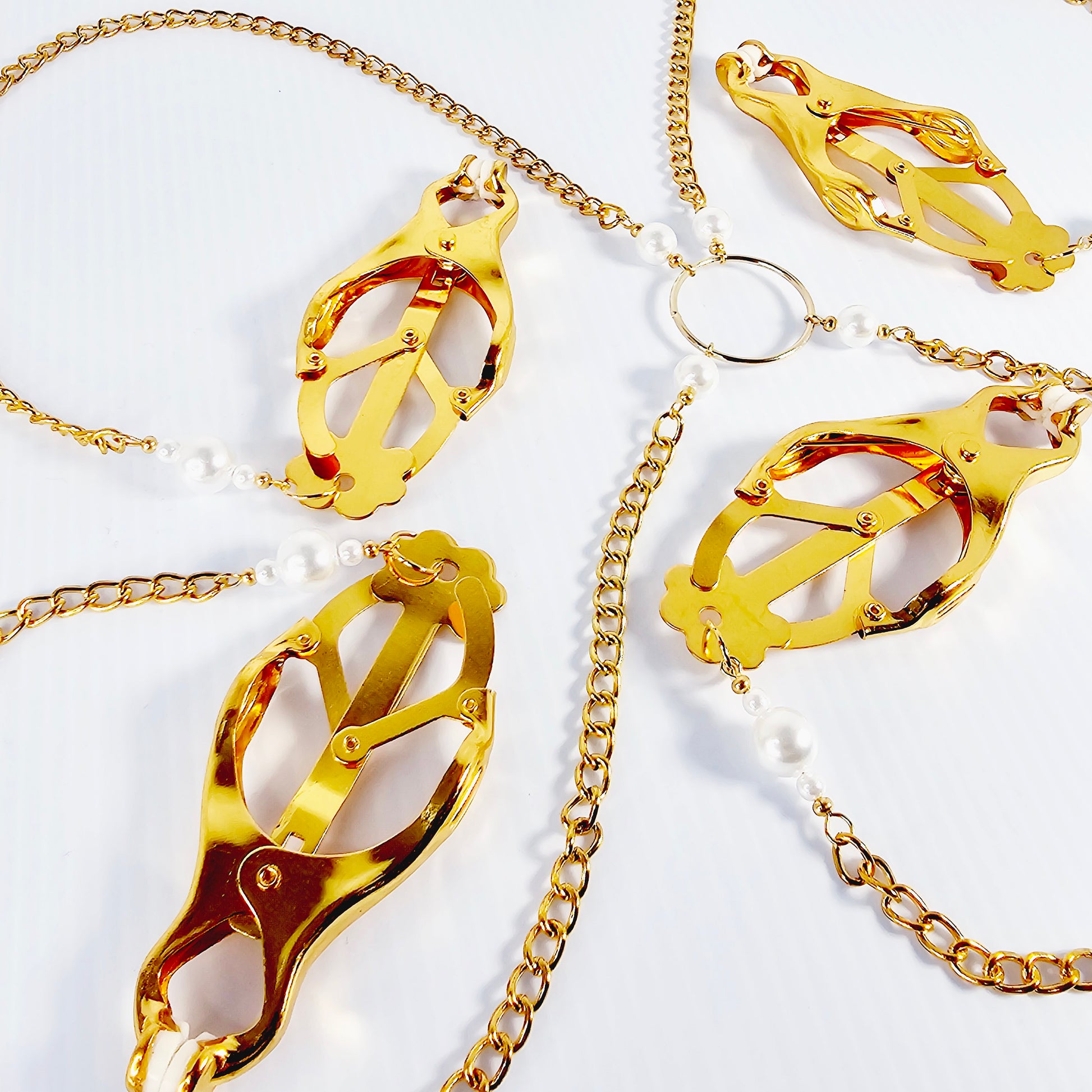 Dare to take your BDSM playtime to the next level with Japanese Clover Nipple and Labia Clamps. Your choice of Gold or Silver. Increase sensation with the attached chains for optional tugging. Add a sense of opulence to your tantalizing moments with white pearls adorning the fierce clover clamps.