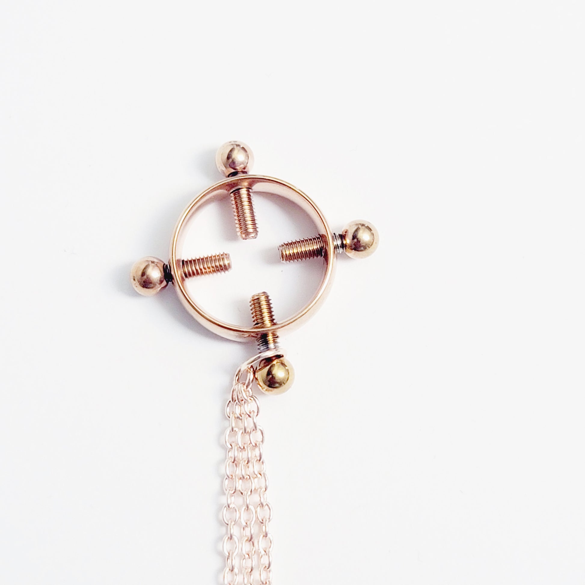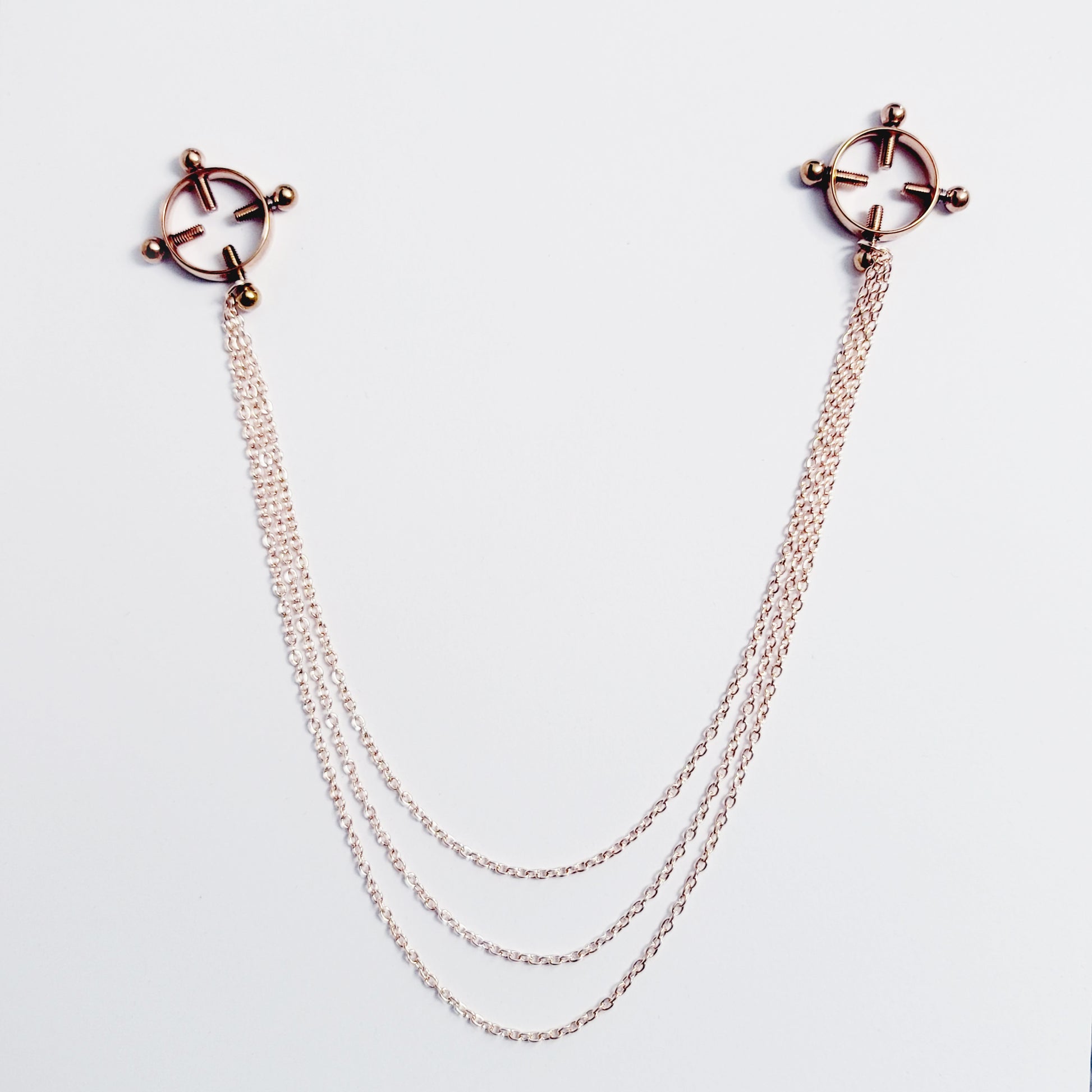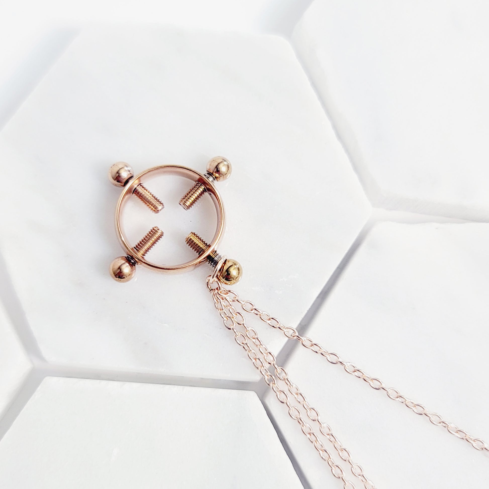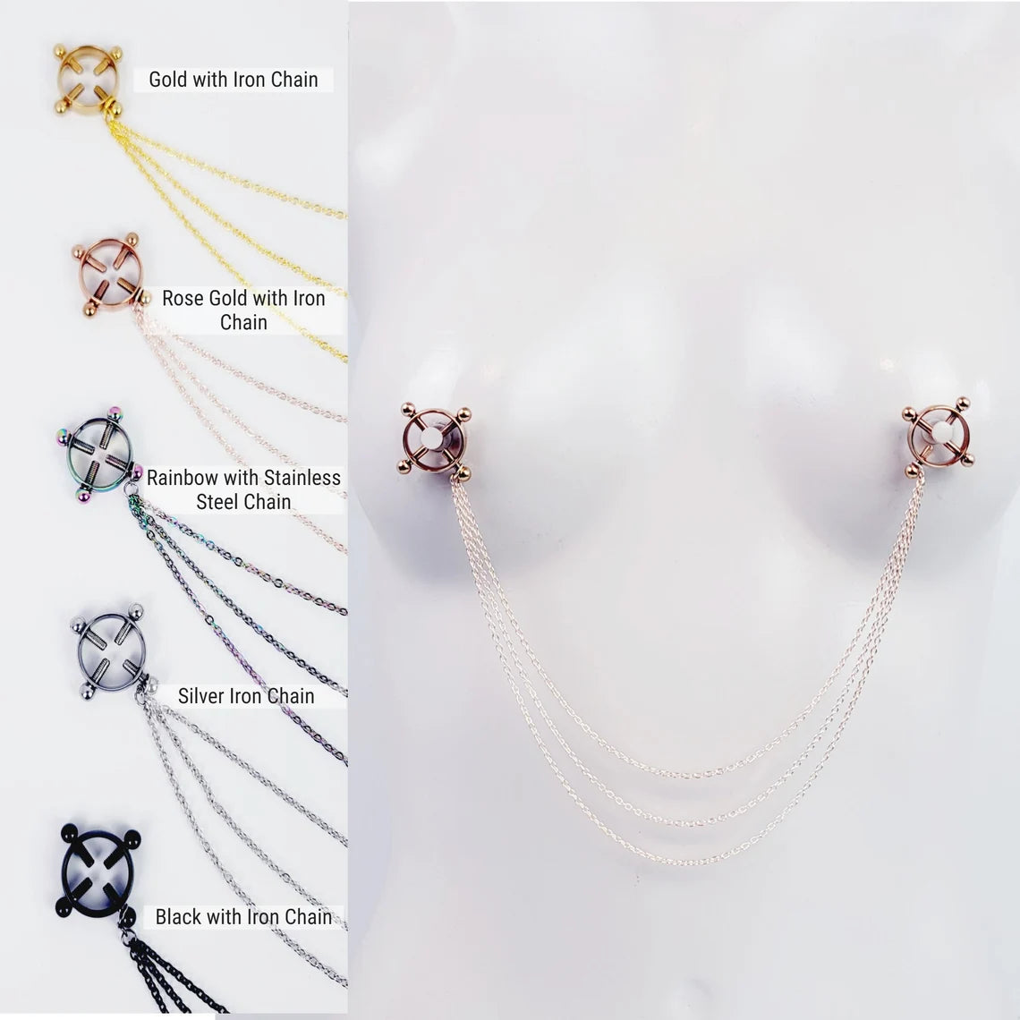 Circle Nipple Clamps, Gold, Rose Gold, Rainbow, Silver, or Black, Triple Chain Attached. Nipple Shield Adjustable Screw Clamps. Non Piercing Nipple Chains, Sex Toys for Women.