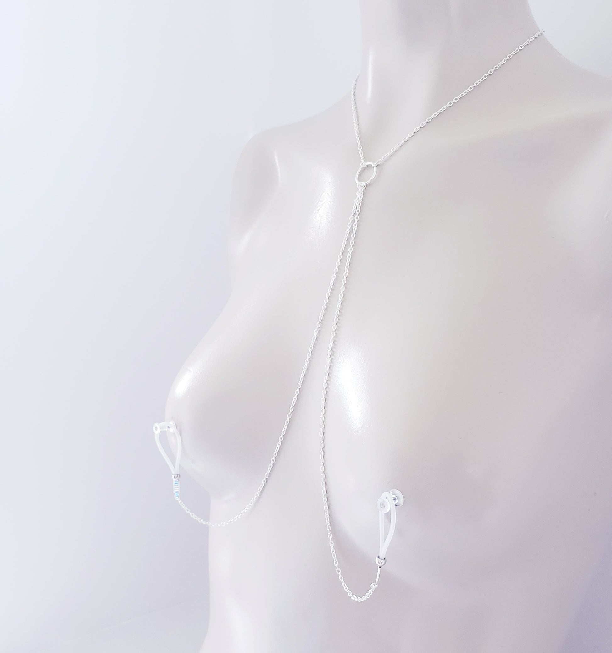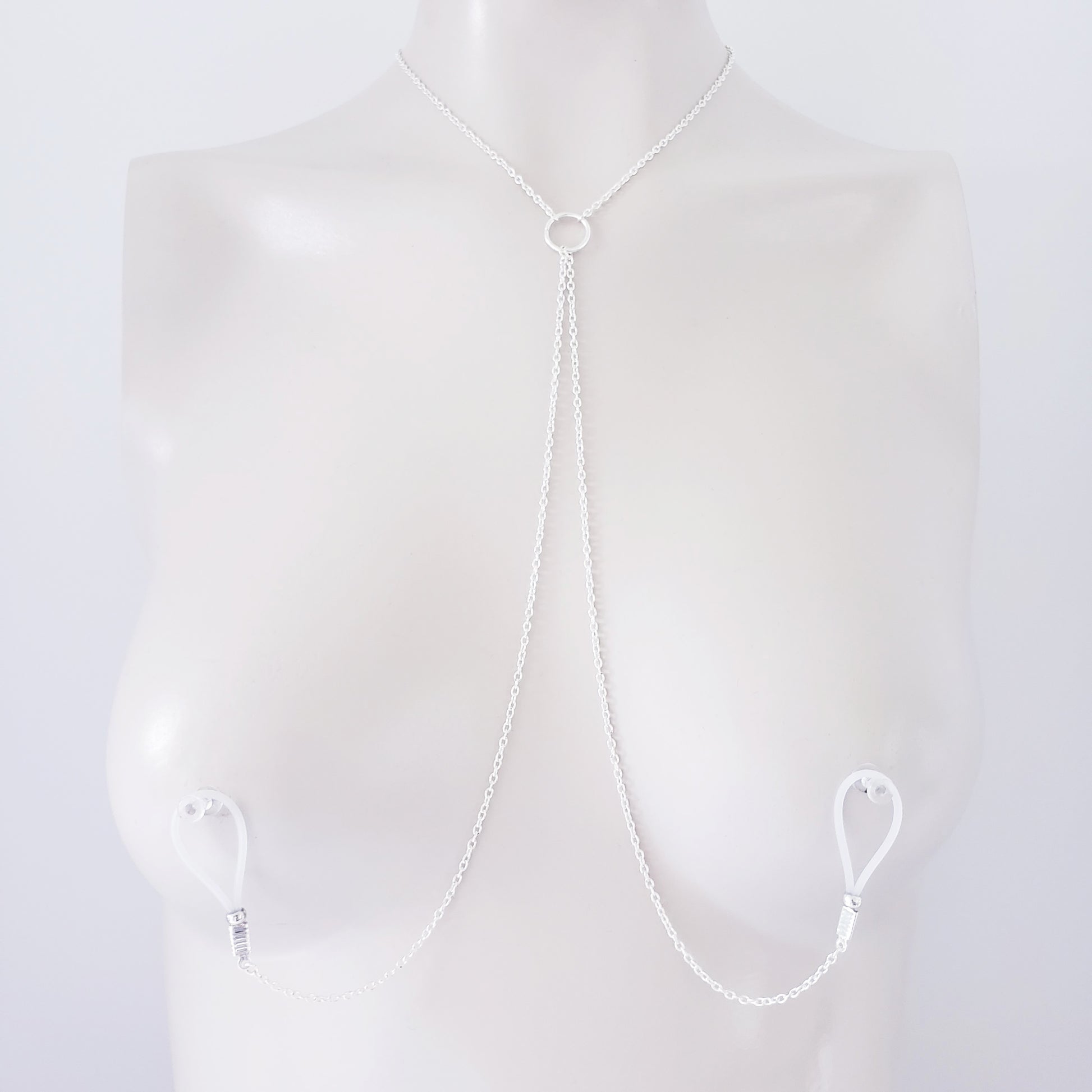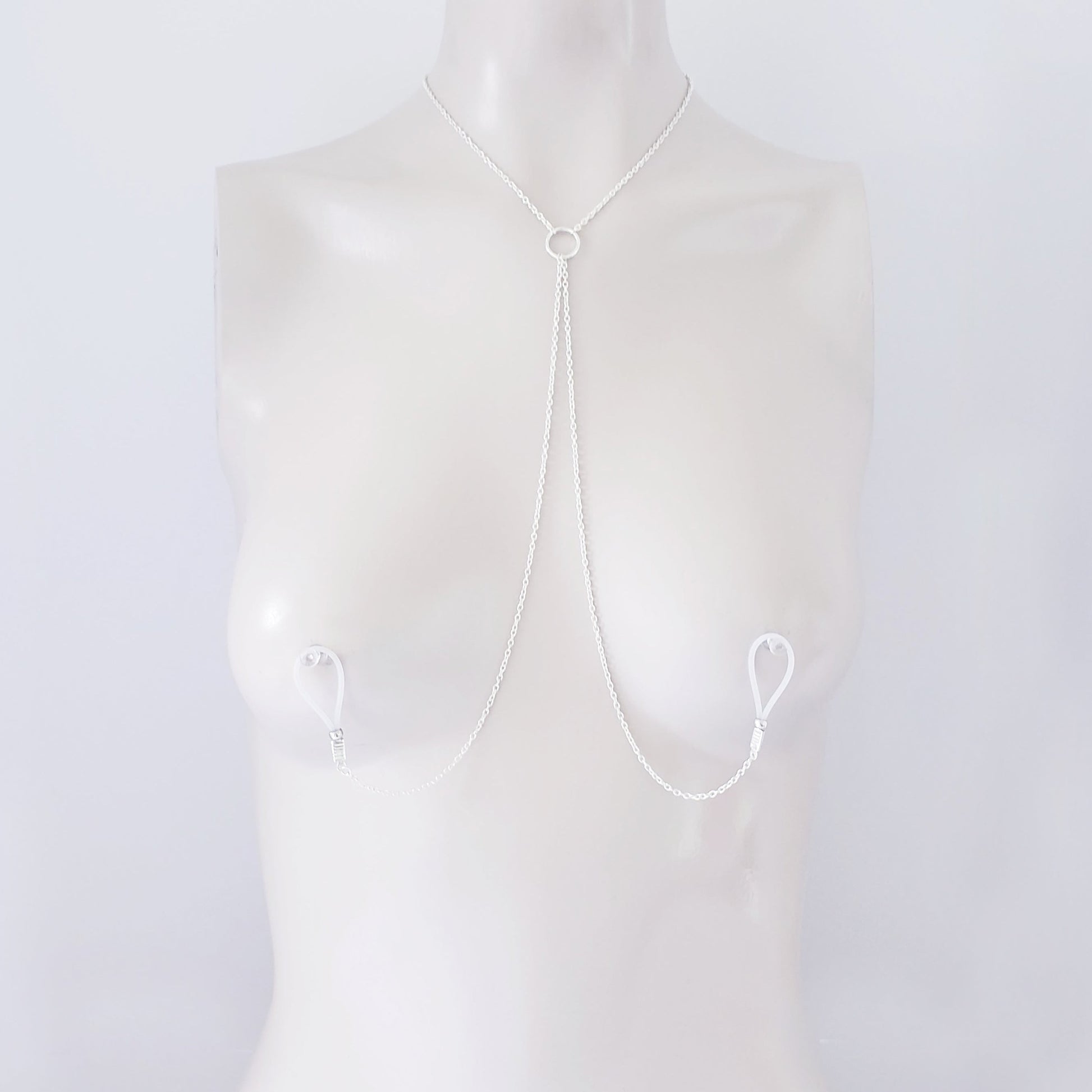 Circle of O necklace with attached non piercing nipple nooses, horseshoe nipple rings, Or feel the sting with one of our five varieties of nipple clamps. Simplistic and perfect for any submissive. BDSM, minimalist, sexy gift.