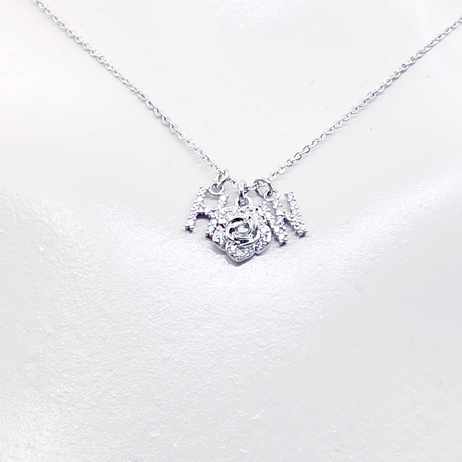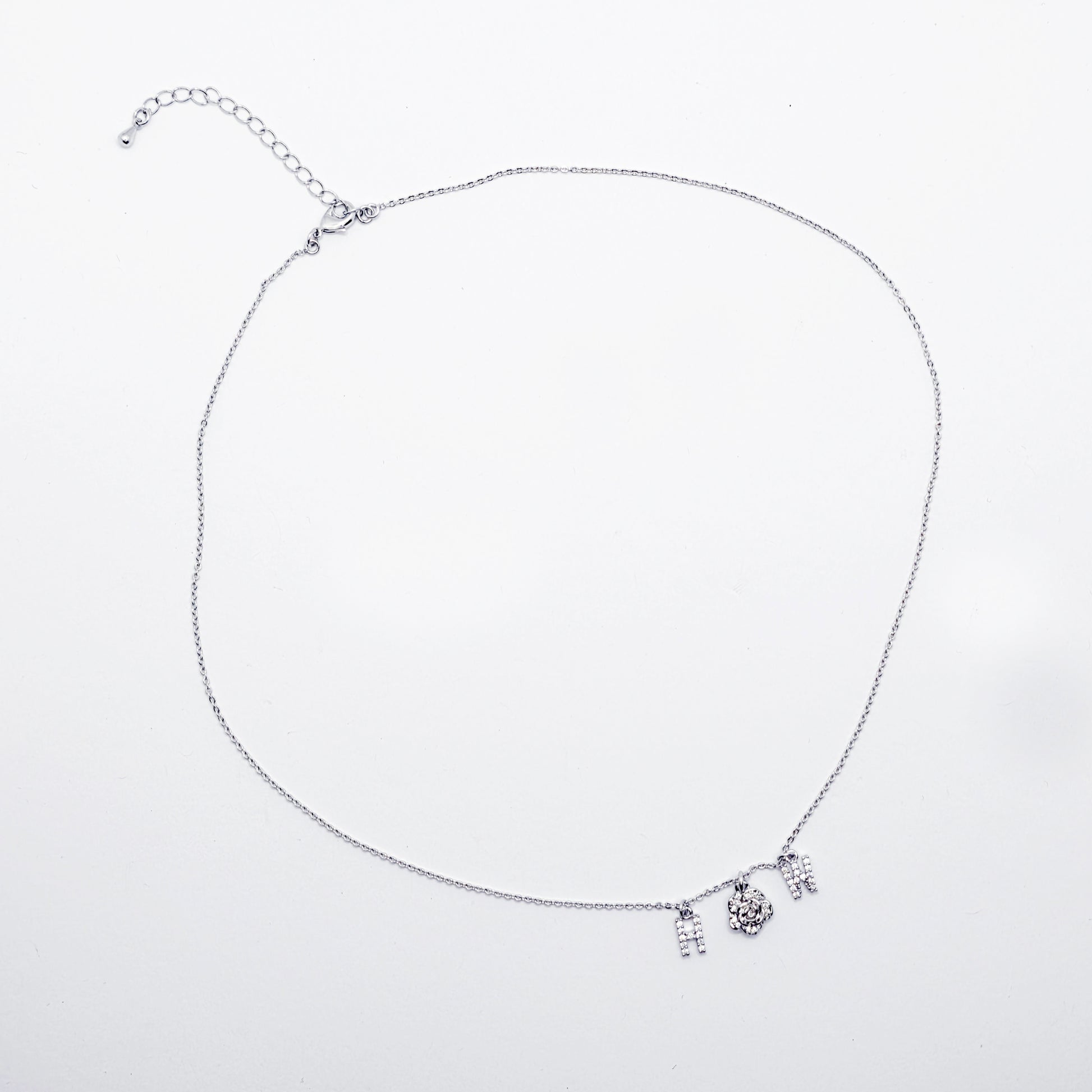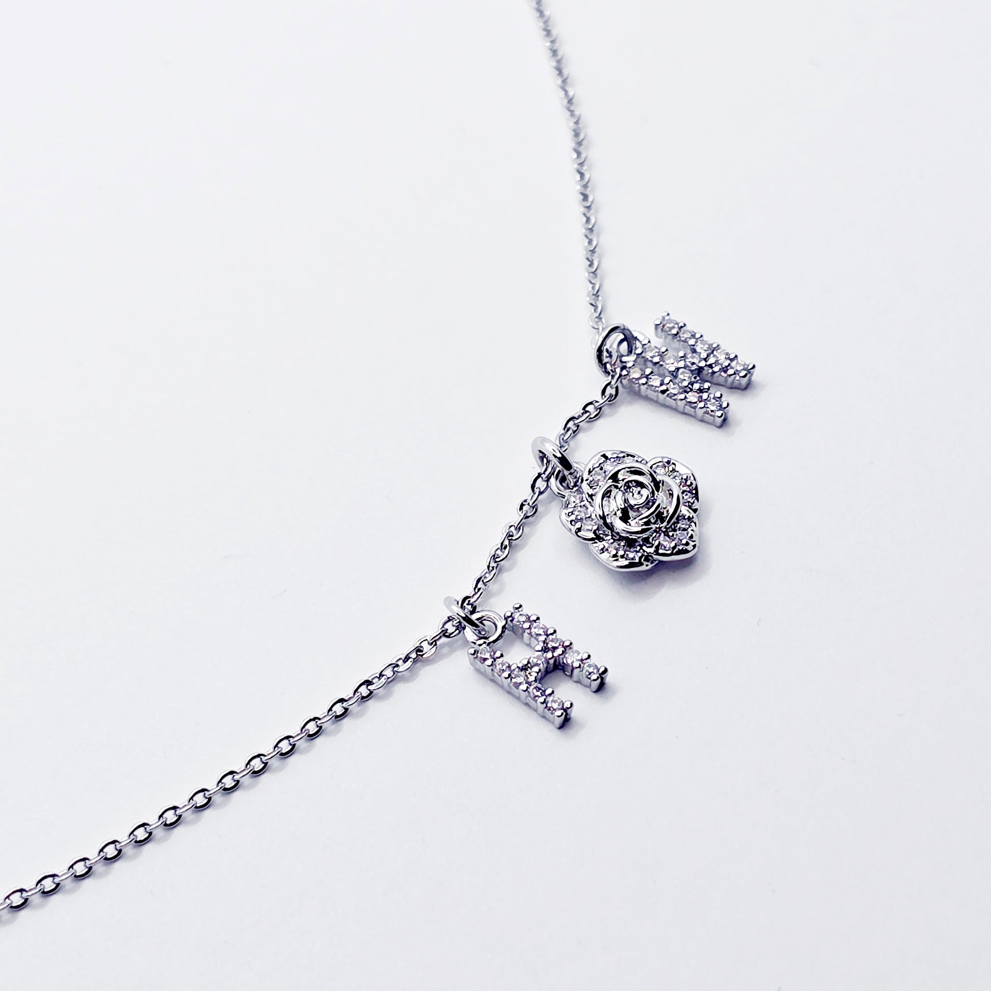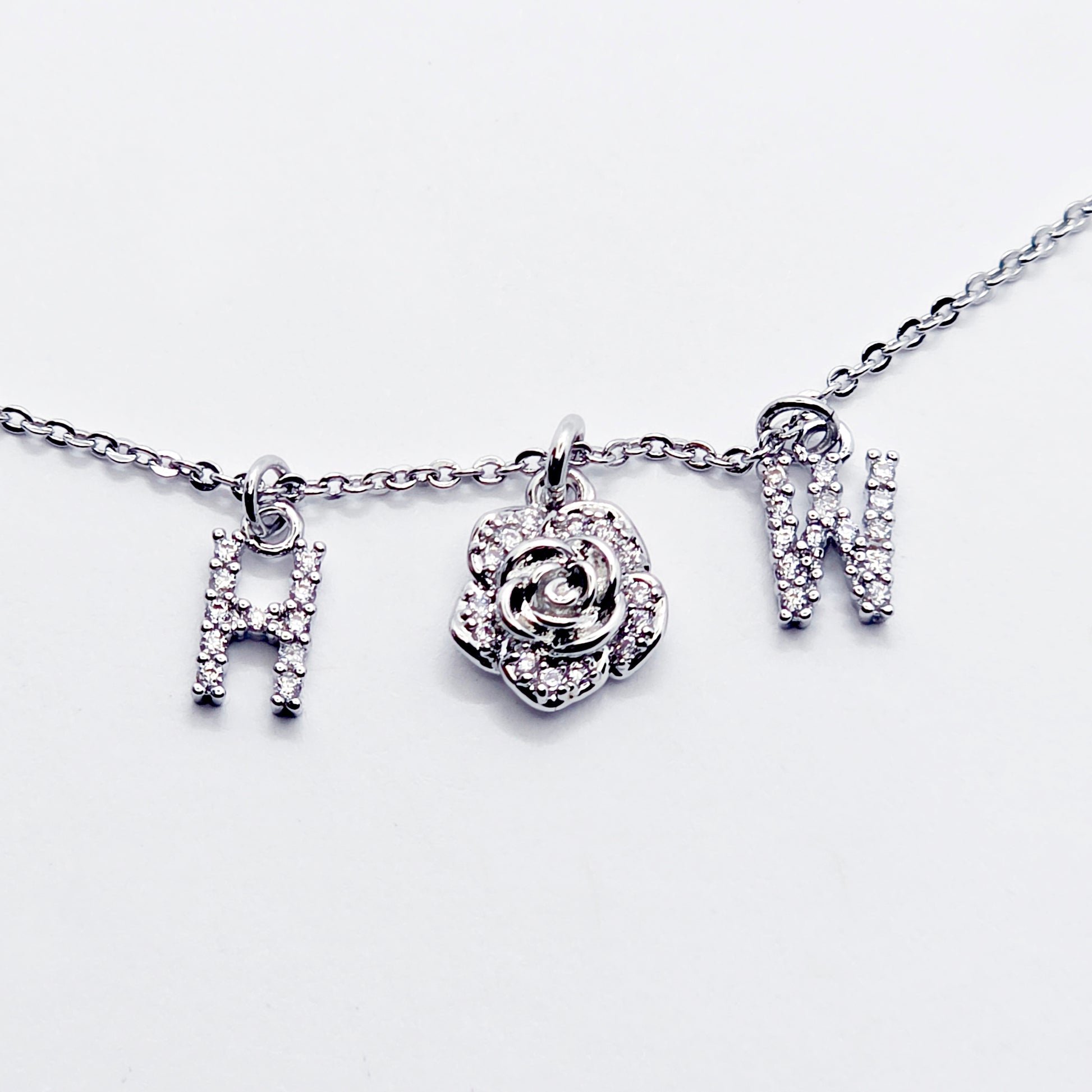 Exquisite Dainty and Discreet Platinum and Cubic Zirconia Hotwife Necklace Featuring a Beautiful Rose and H & W Letter Pendants. 18" Inches with an additional extender for extra length.ย