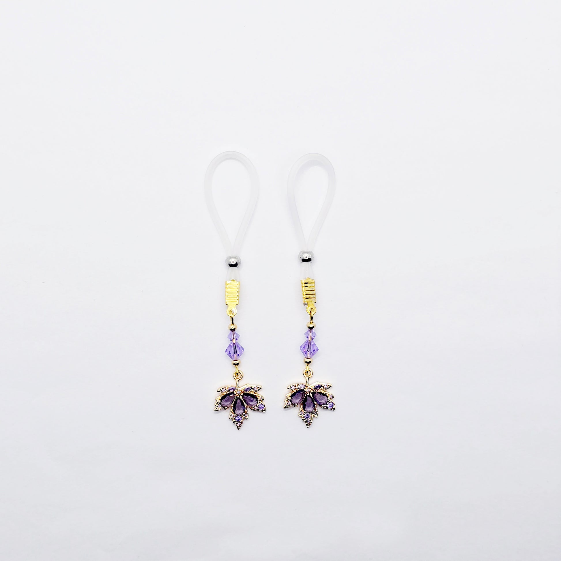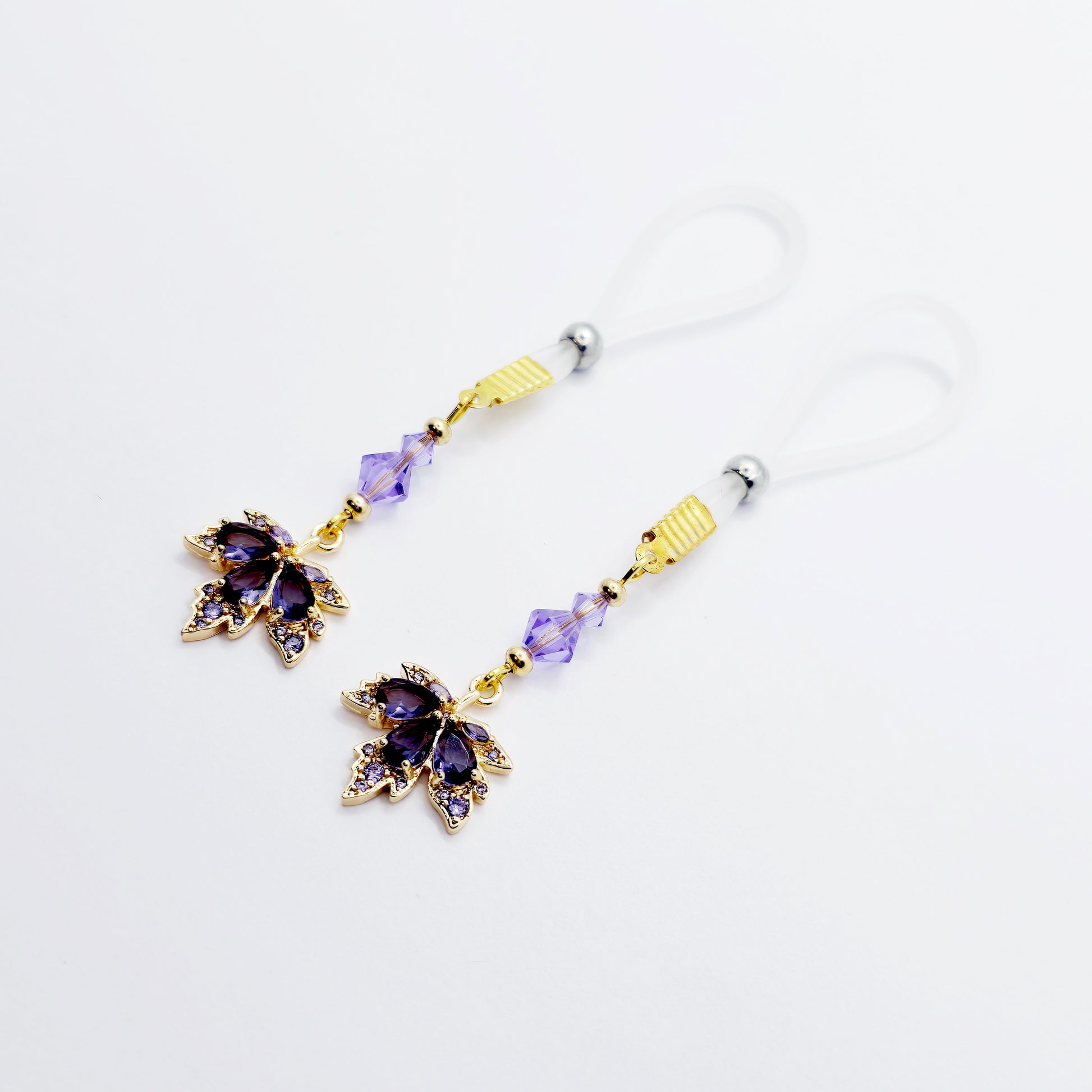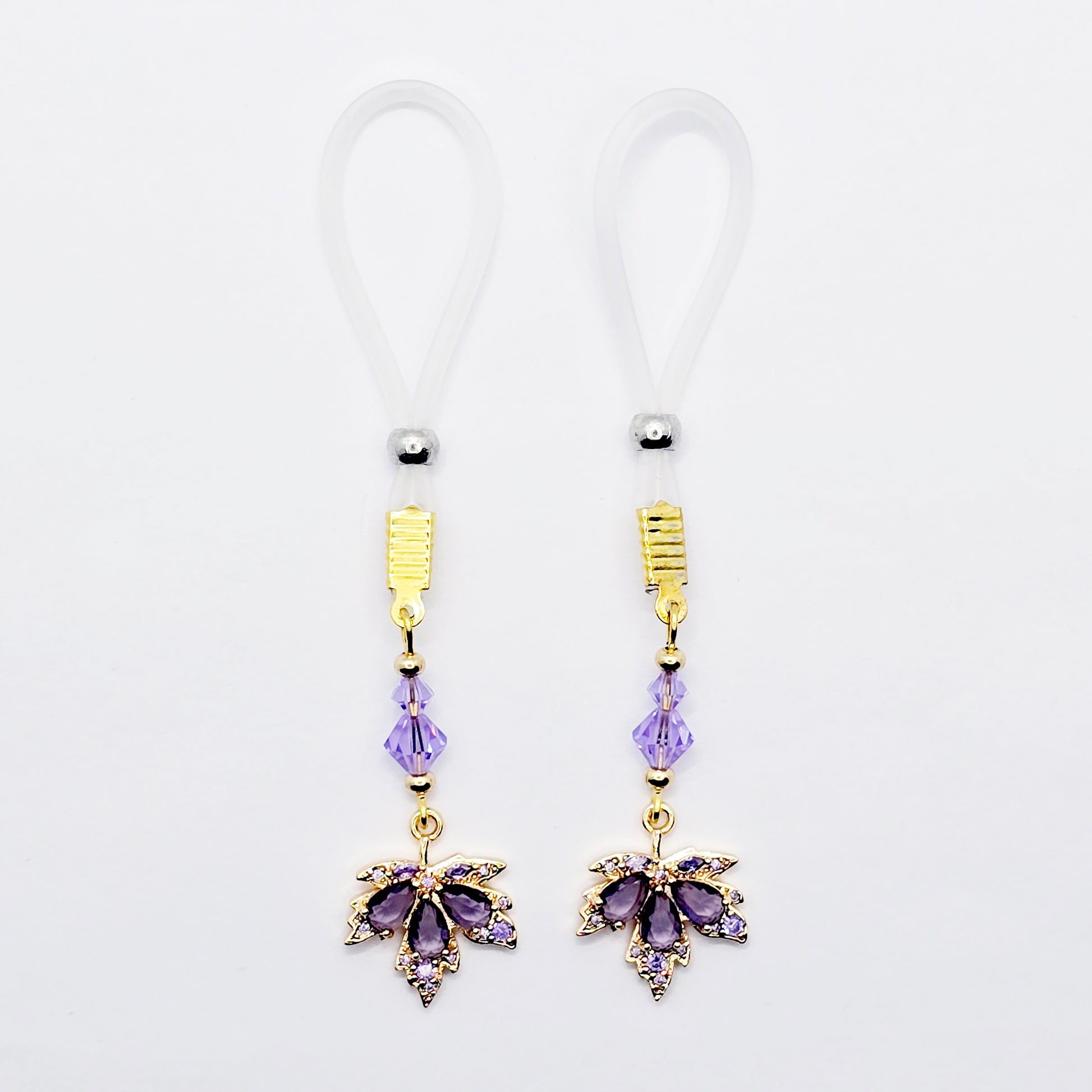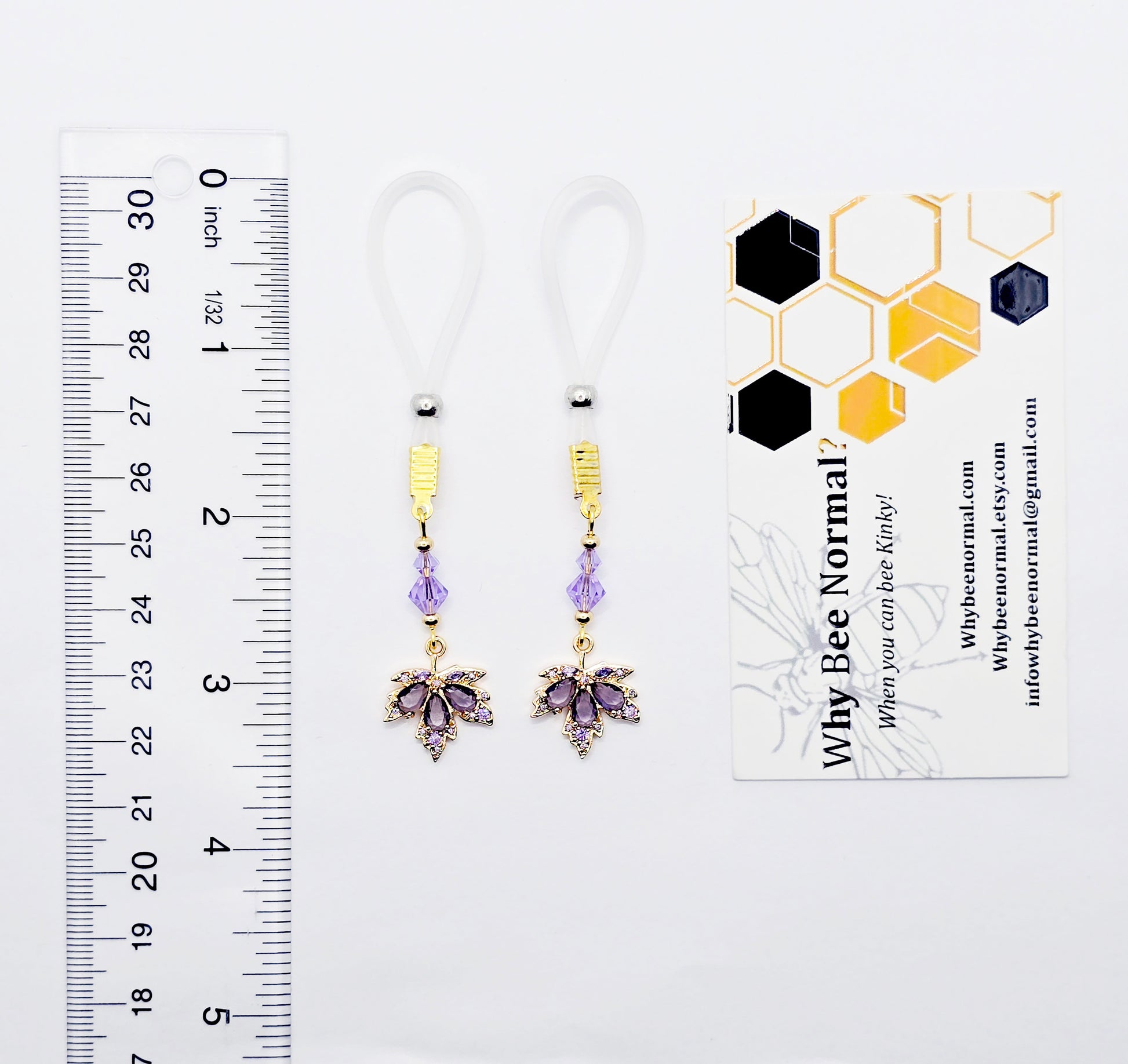 Elegant Non-Piercing Nipple Dangles with Leaves of Gold and Premium Purple Crystals. Choose Nooses or Clamps.