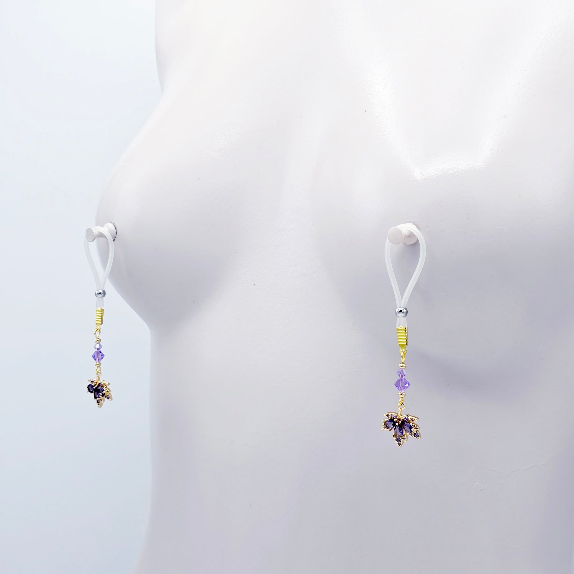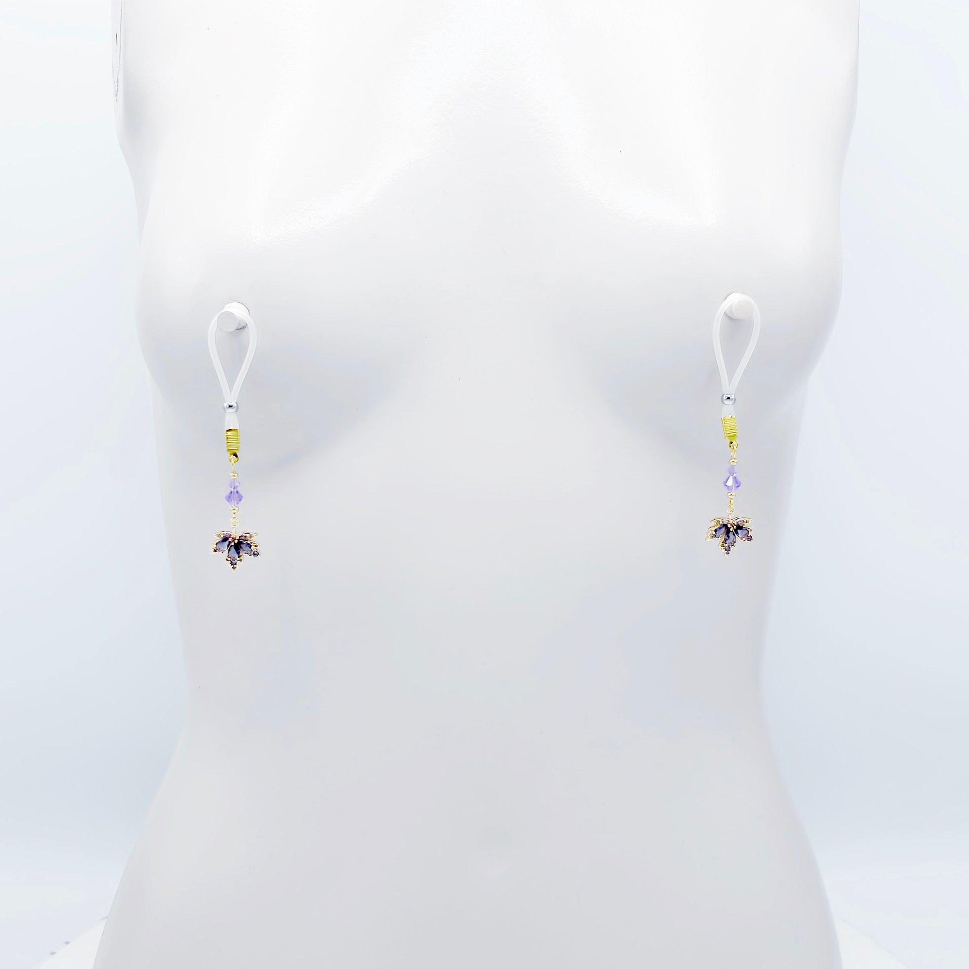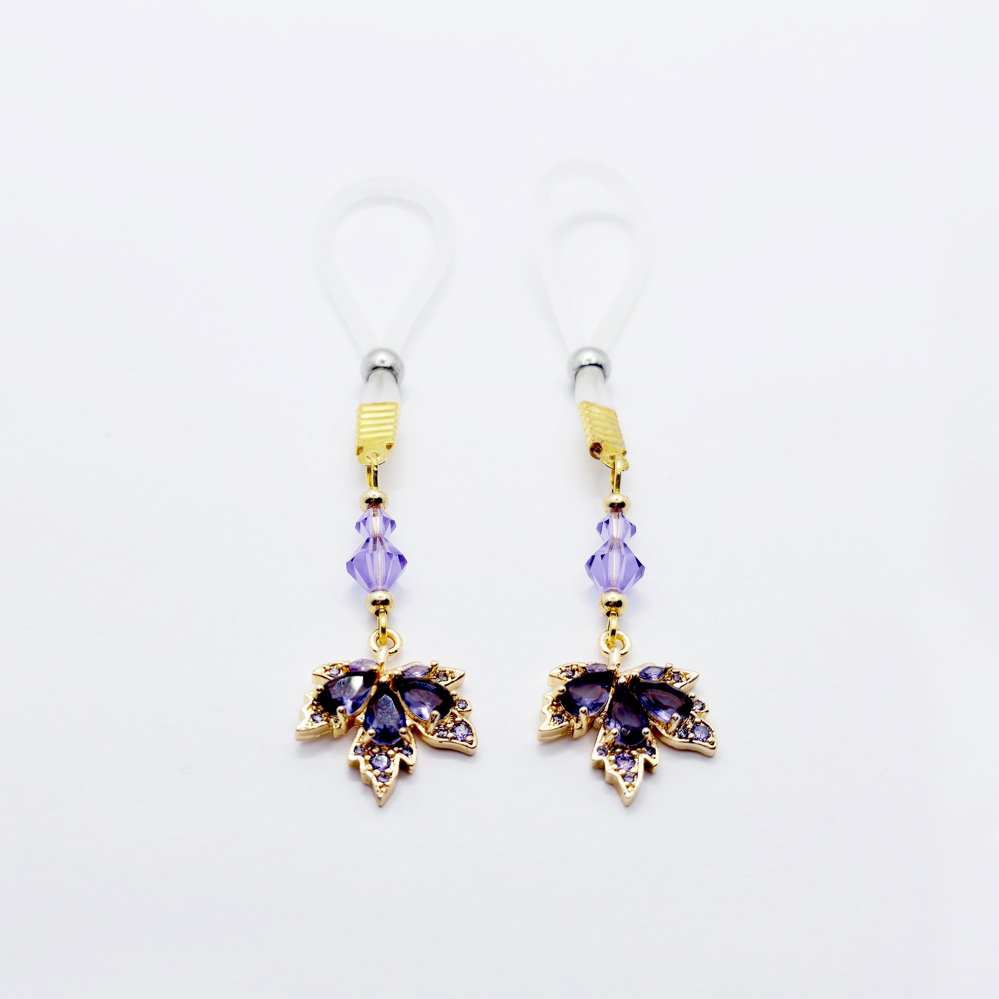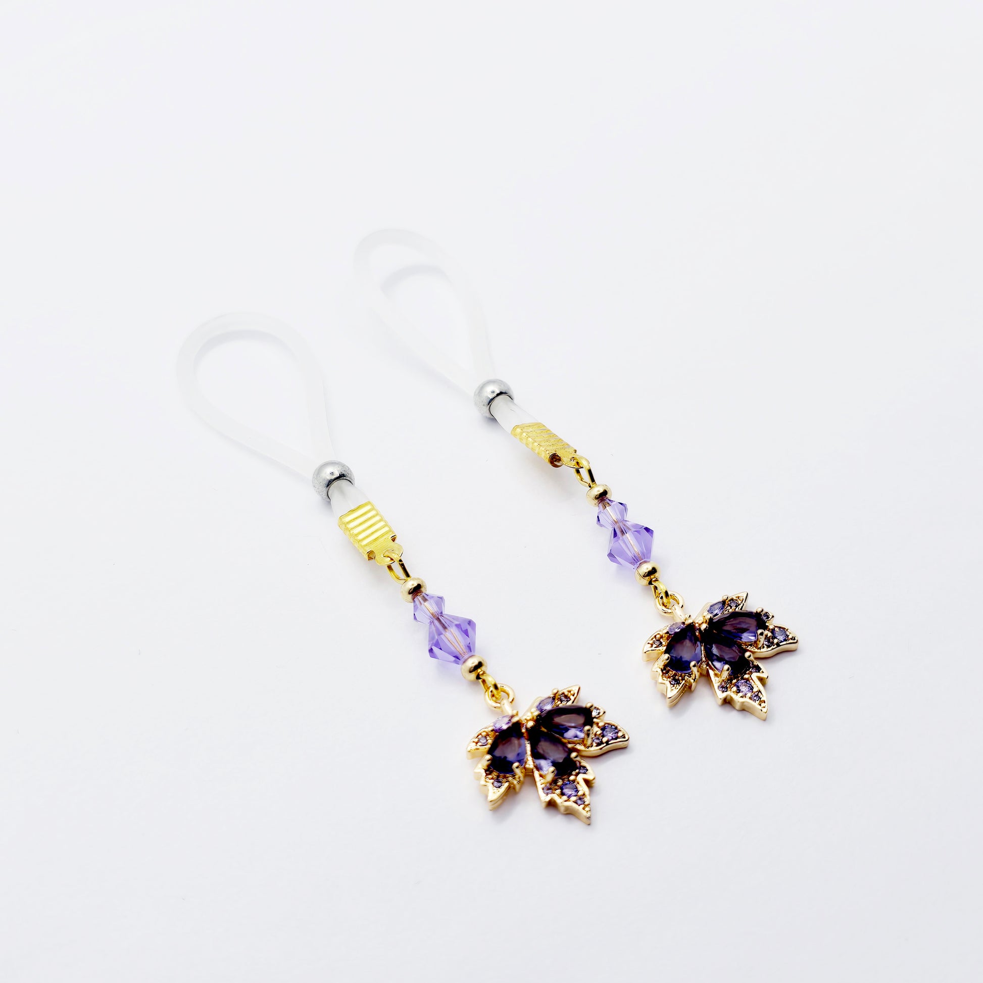 Elegant Non-Piercing Nipple Dangles with Leaves of Gold and Premium Purple Crystals. Choose Nooses or Clamps.