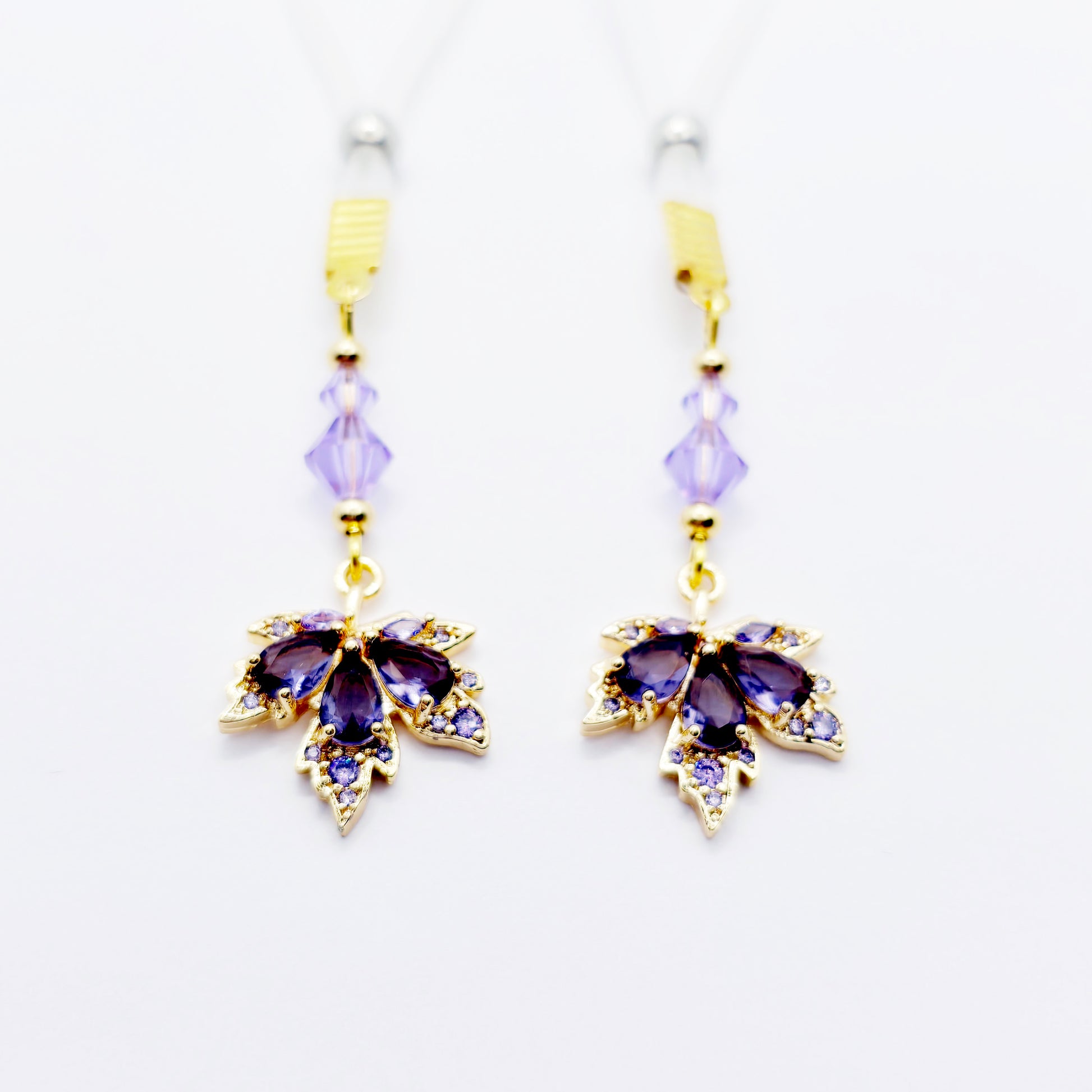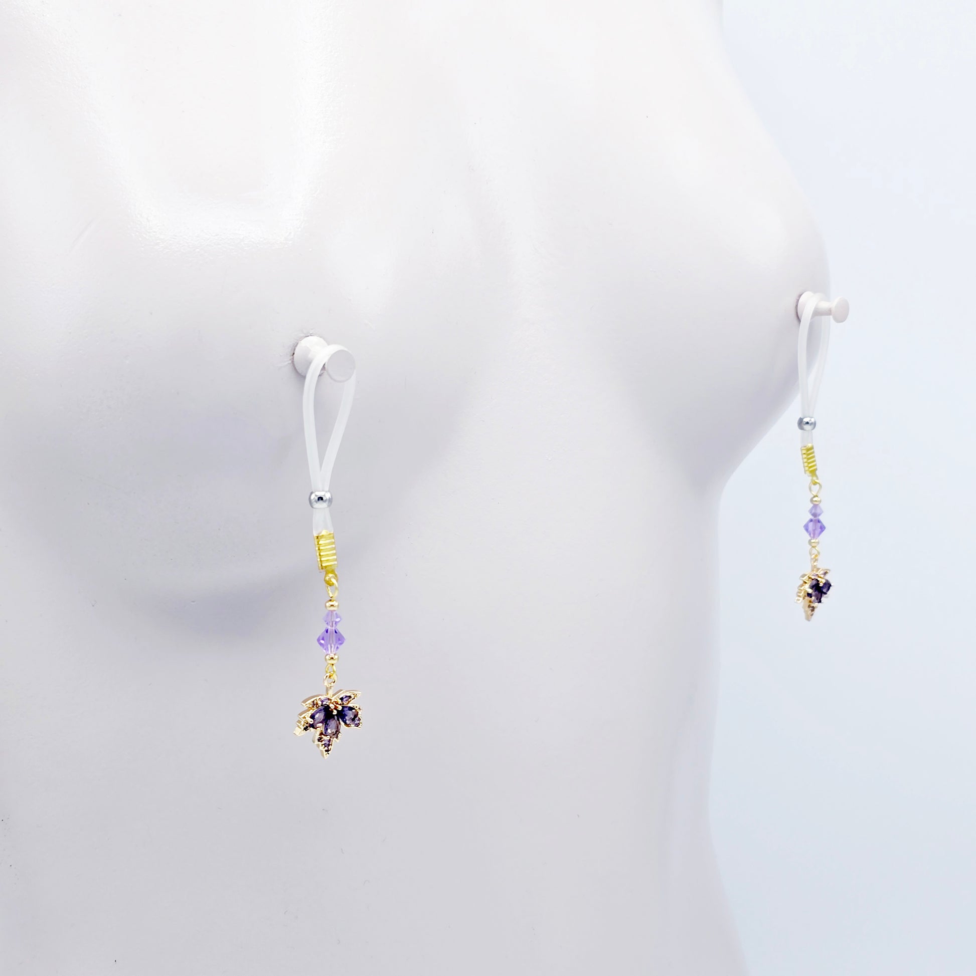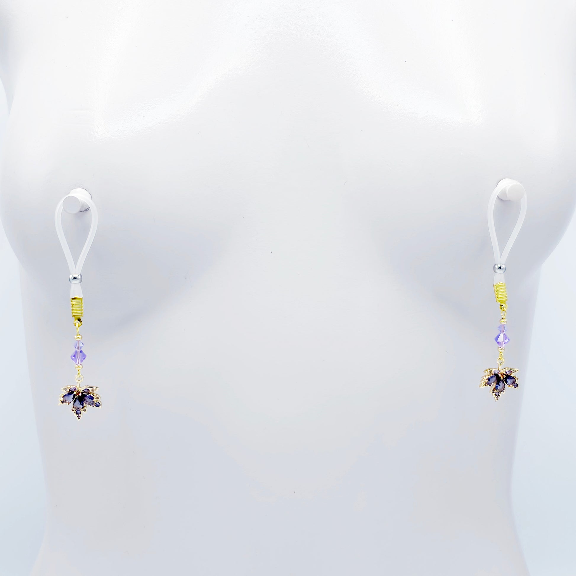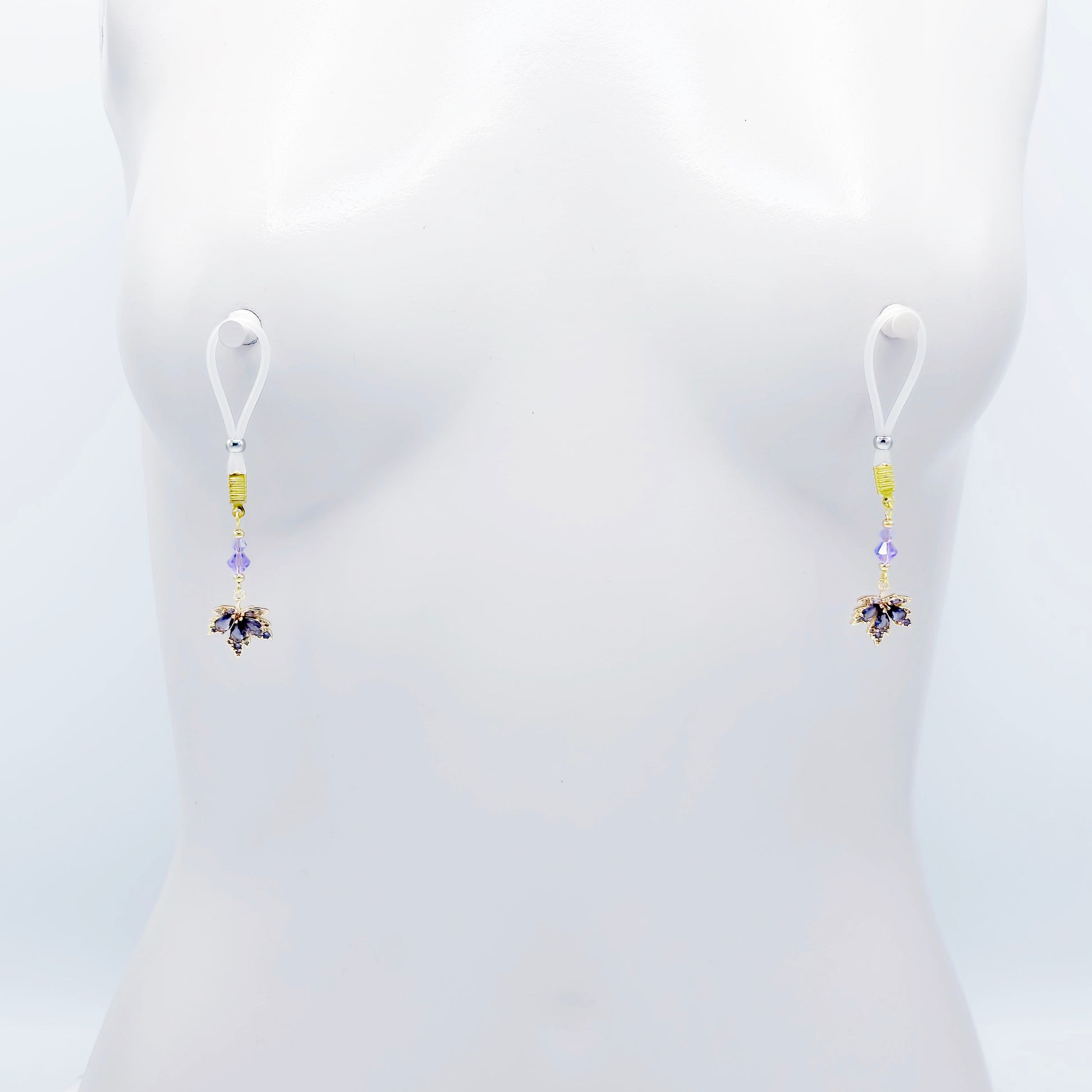 Elegant Non-Piercing Nipple Dangles with Leaves of Gold and Premium Purple Crystals. Choose Nooses or Clamps.
