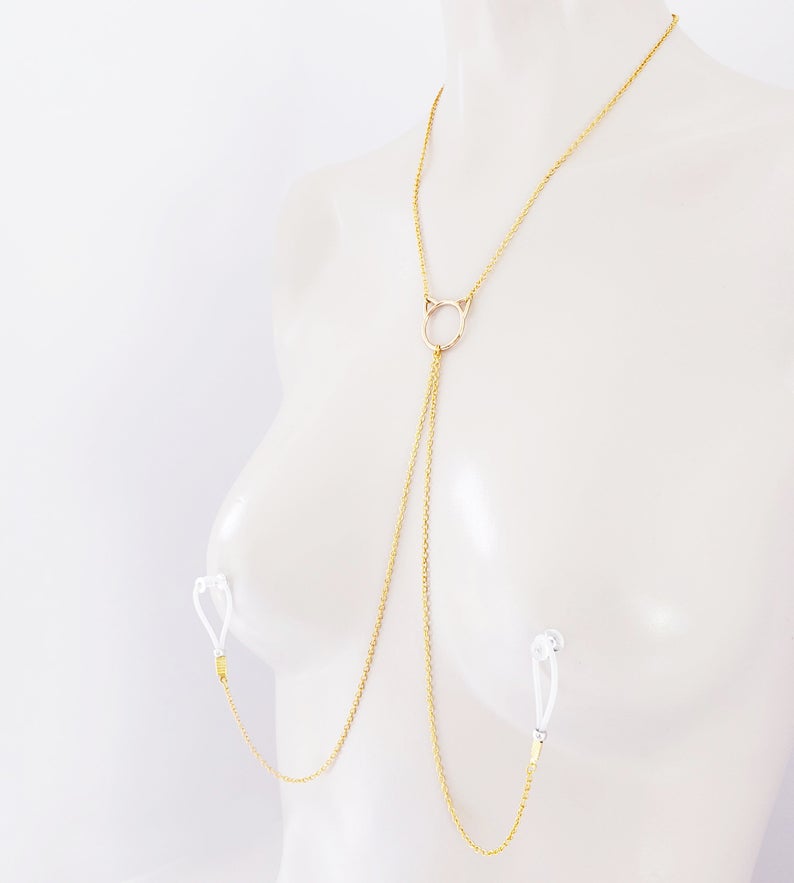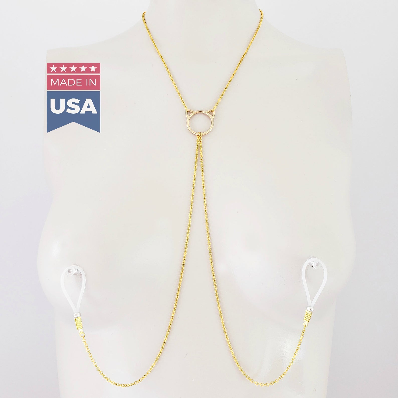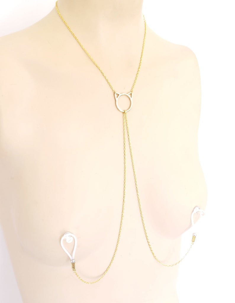 Gold Kitten Necklace with Non Piercing Nipple Nooses or choose to feel the sting with one of our five types of nipple clamps. 🐝 Adjustable, Tweezer, Alligator, C Clamps, and Clover Clamps available. BDSM Gear for Women Submissive, DDLG Little, Baby Girl, Kitten.