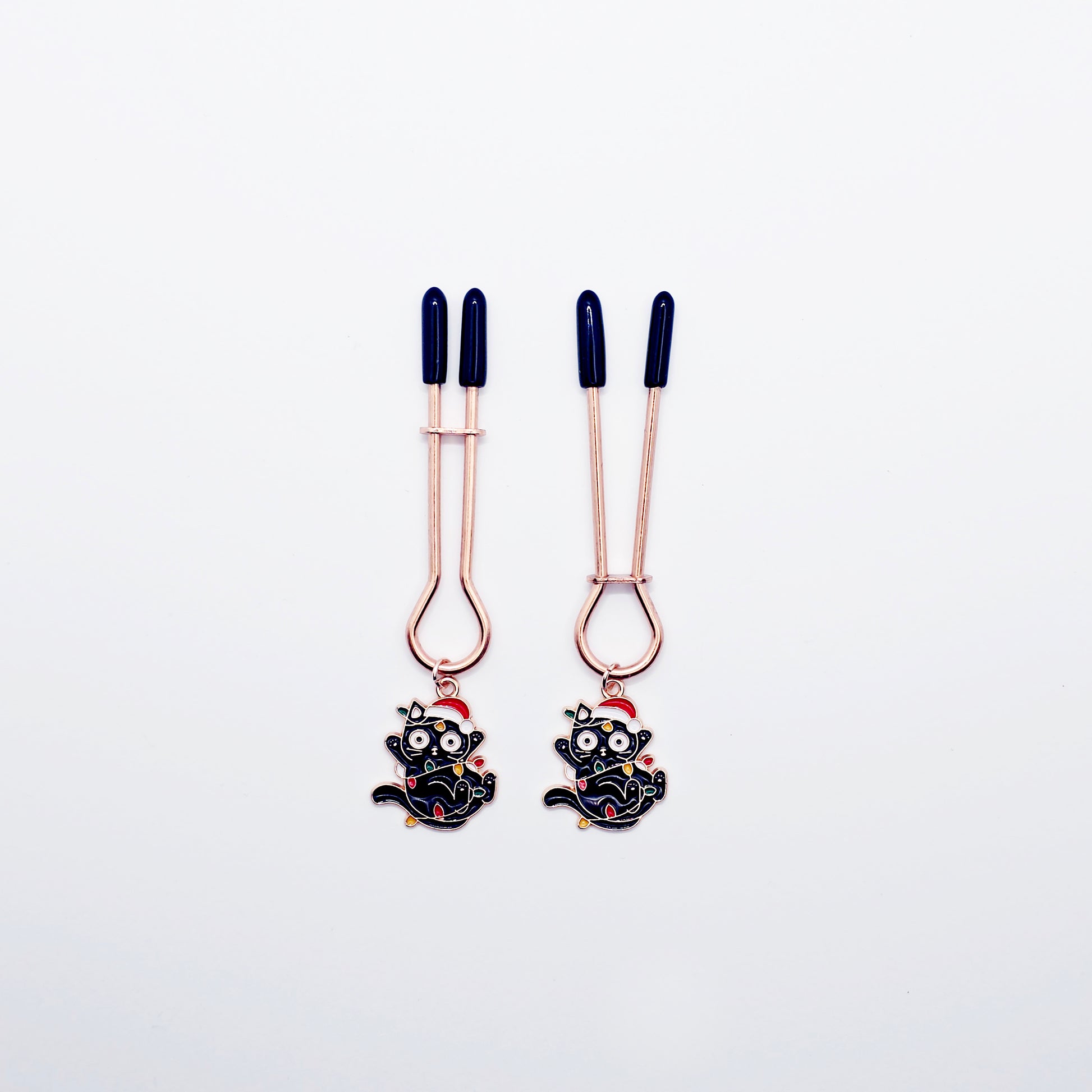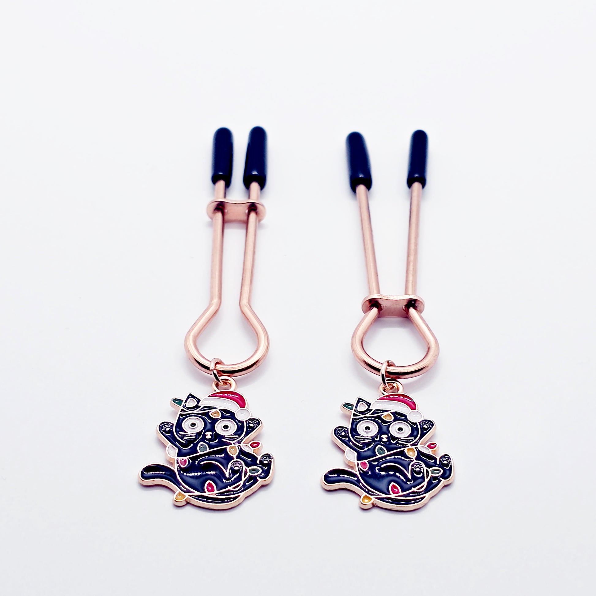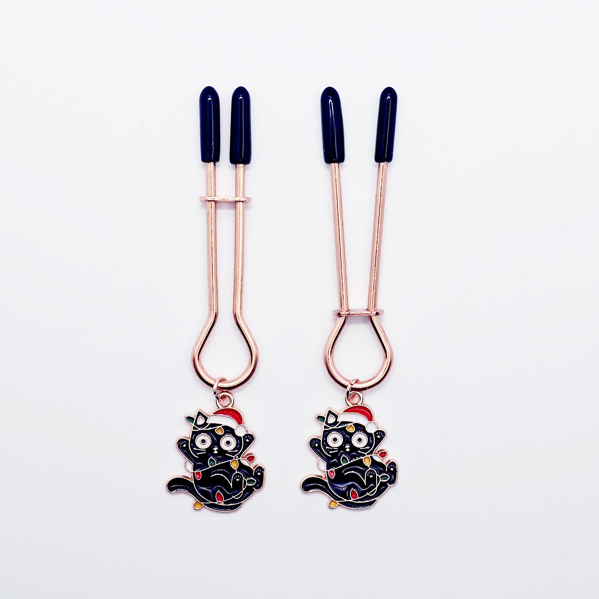 Holiday Nipple Clamps. Rose Gold Straight Tweezer Clamps with Naughty Christmas Kittens.