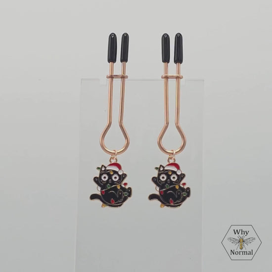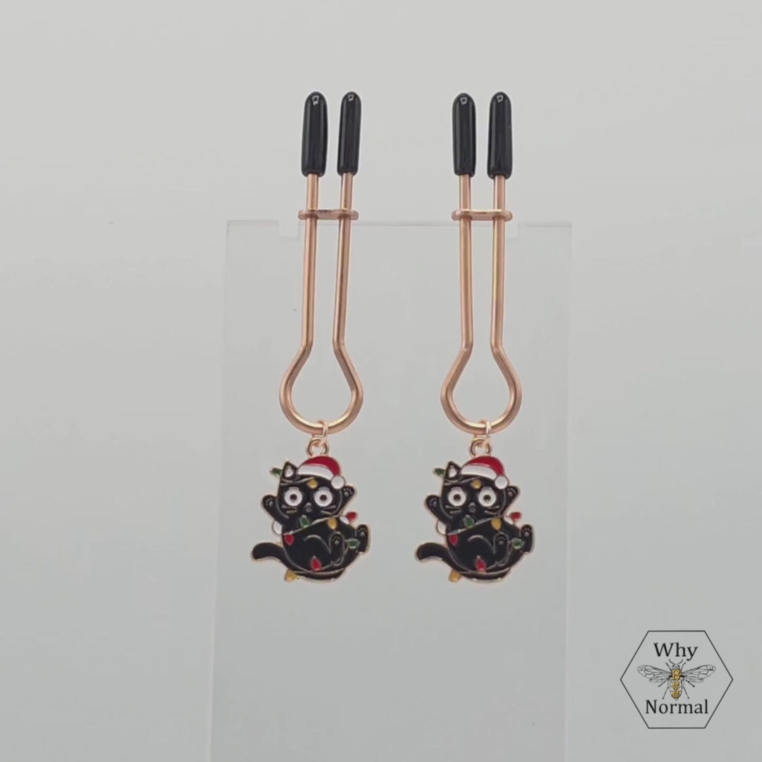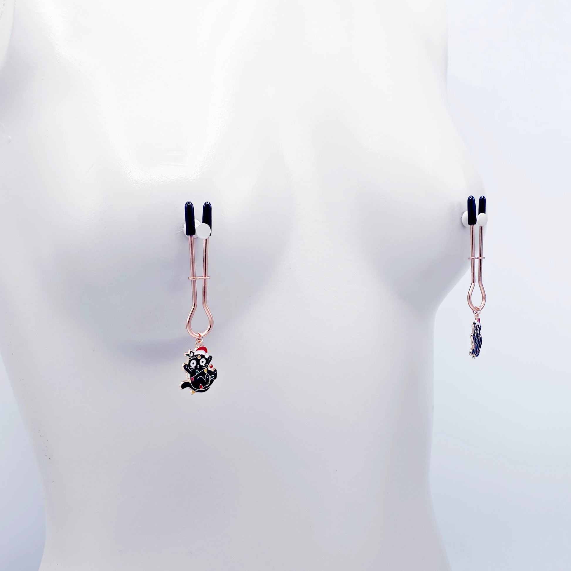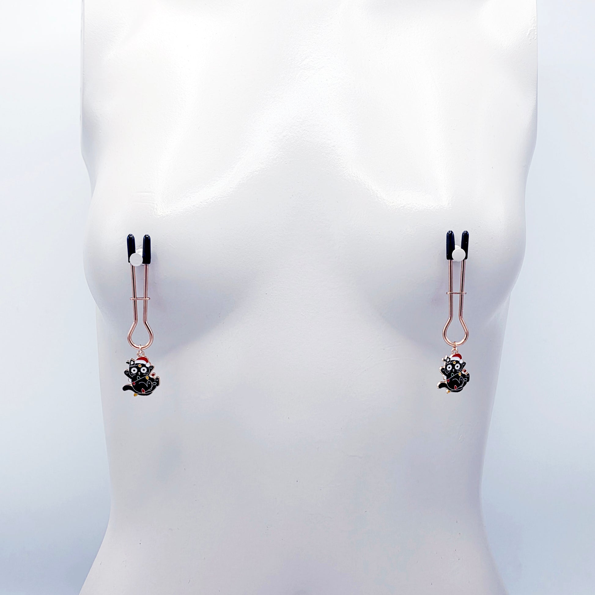 Holiday Nipple Clamps. Rose Gold Straight Tweezer Clamps with Naughty Christmas Kittens.