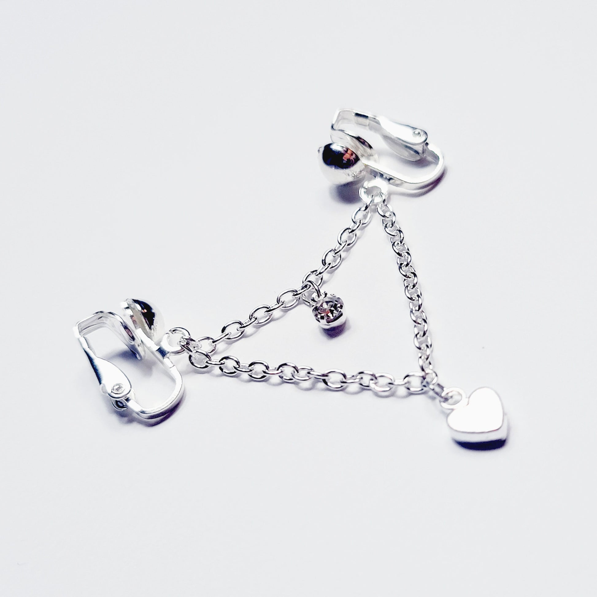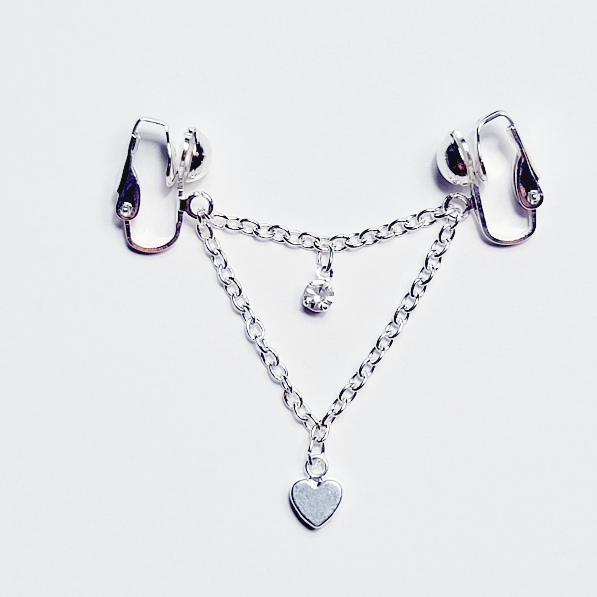 Sexy heart and sparkle labia chain dangle clip onto your outer labia lips. Intimate non-piercing body jewelry. All components are shiny silver.