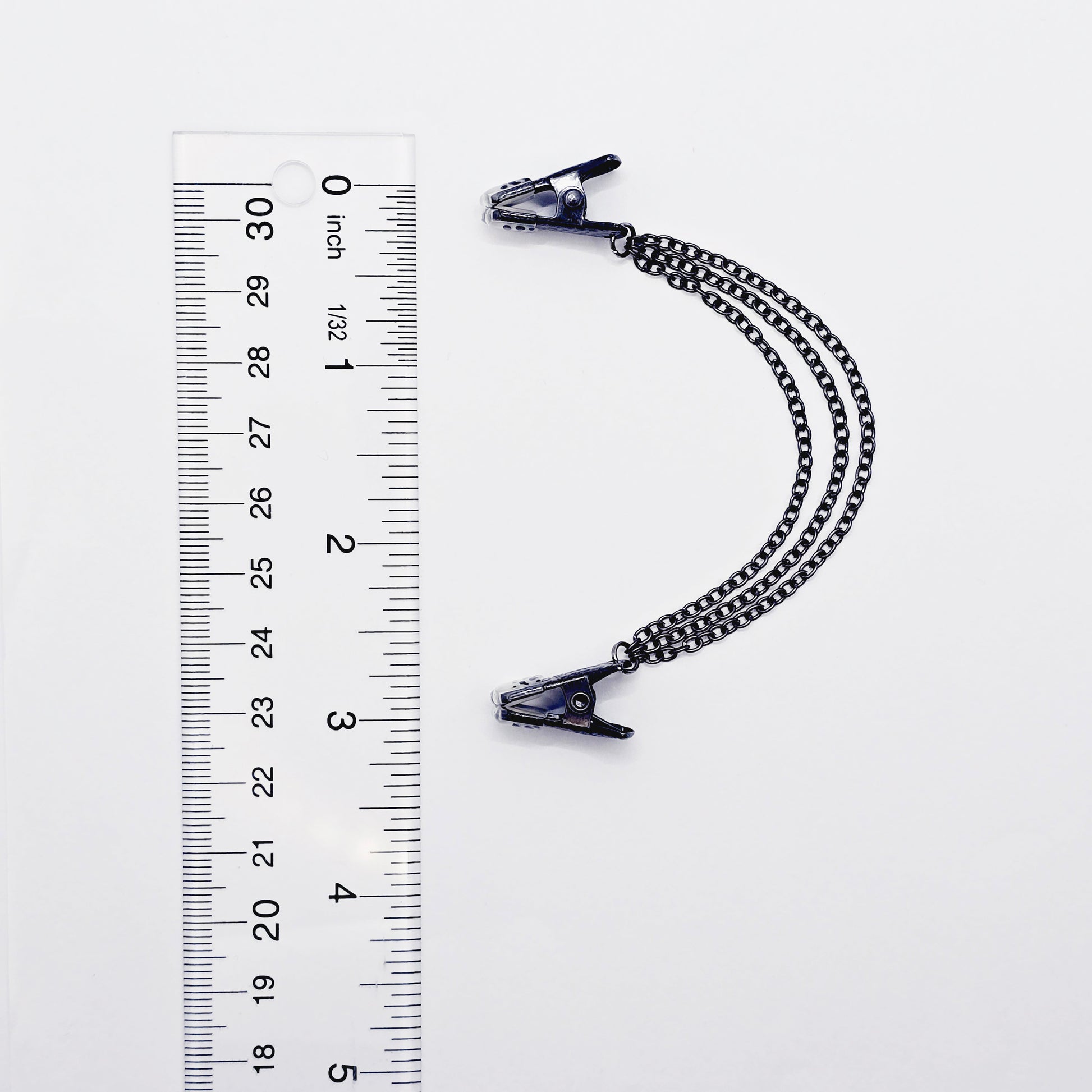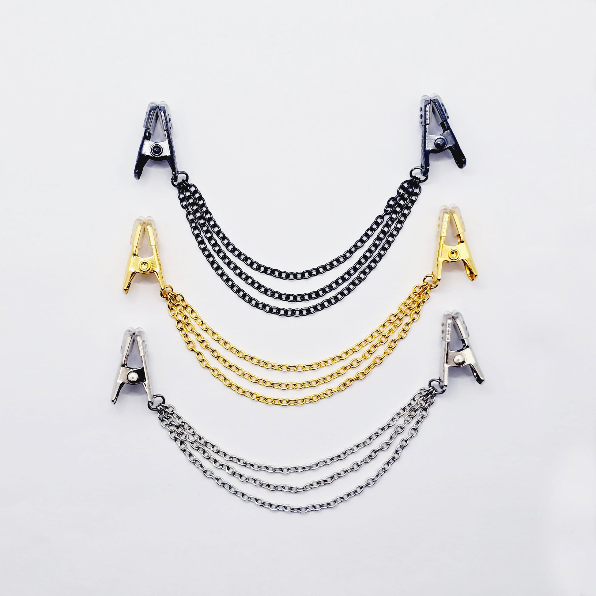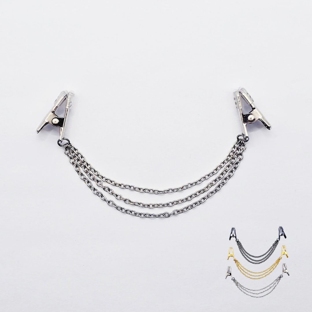 Sexy Labia Chain Dangle with New Clip Style! Multiple chains, and your choice of color. Silver, Gold, or Gunmetal black. Experience a new level of sensation with these higher pressure labia clamps. Non-Piercing Intimate Genital Jewelry for Women. Suggested for wear on outer labia lips.ย