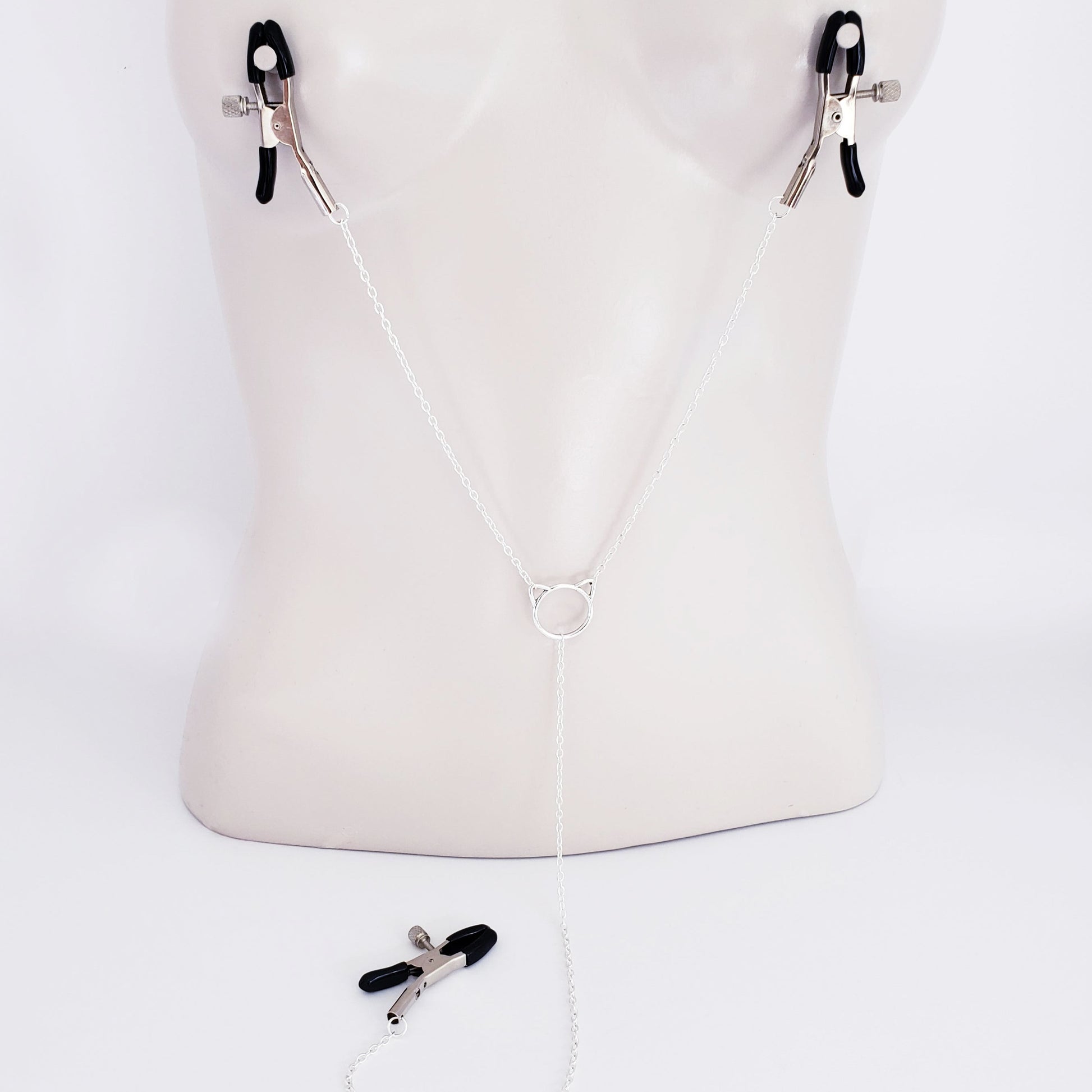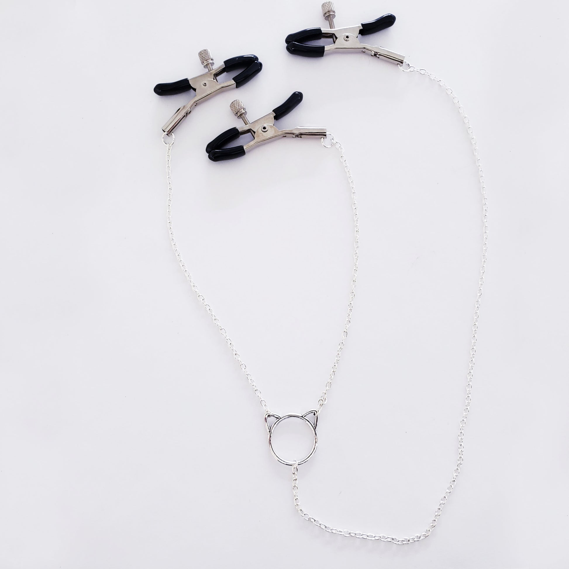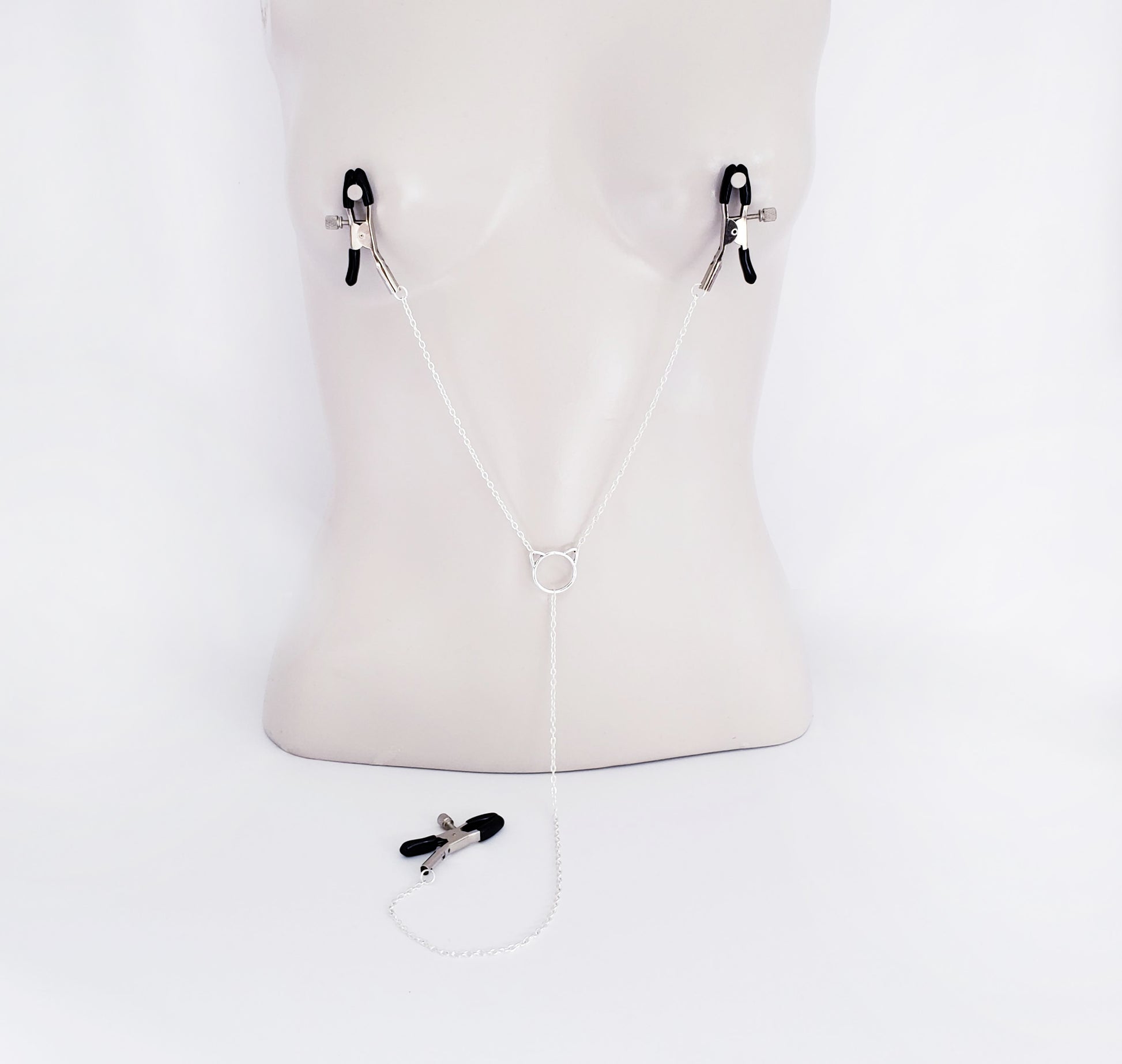Kitten Shiny Silver Iron Chain Attached Nipple and Clitoral Clamps. Choose Adjustable or Tweezer Clamps.