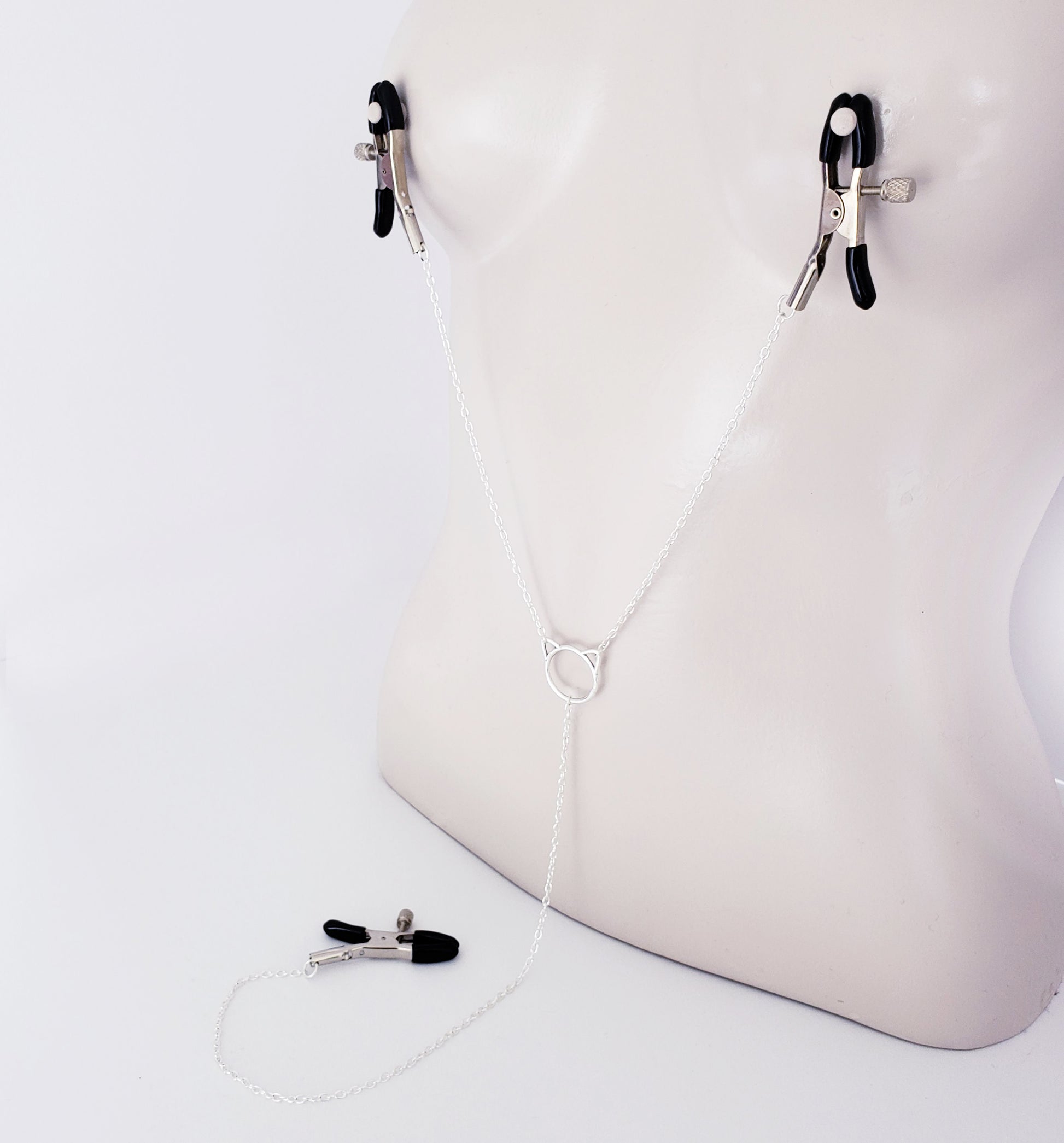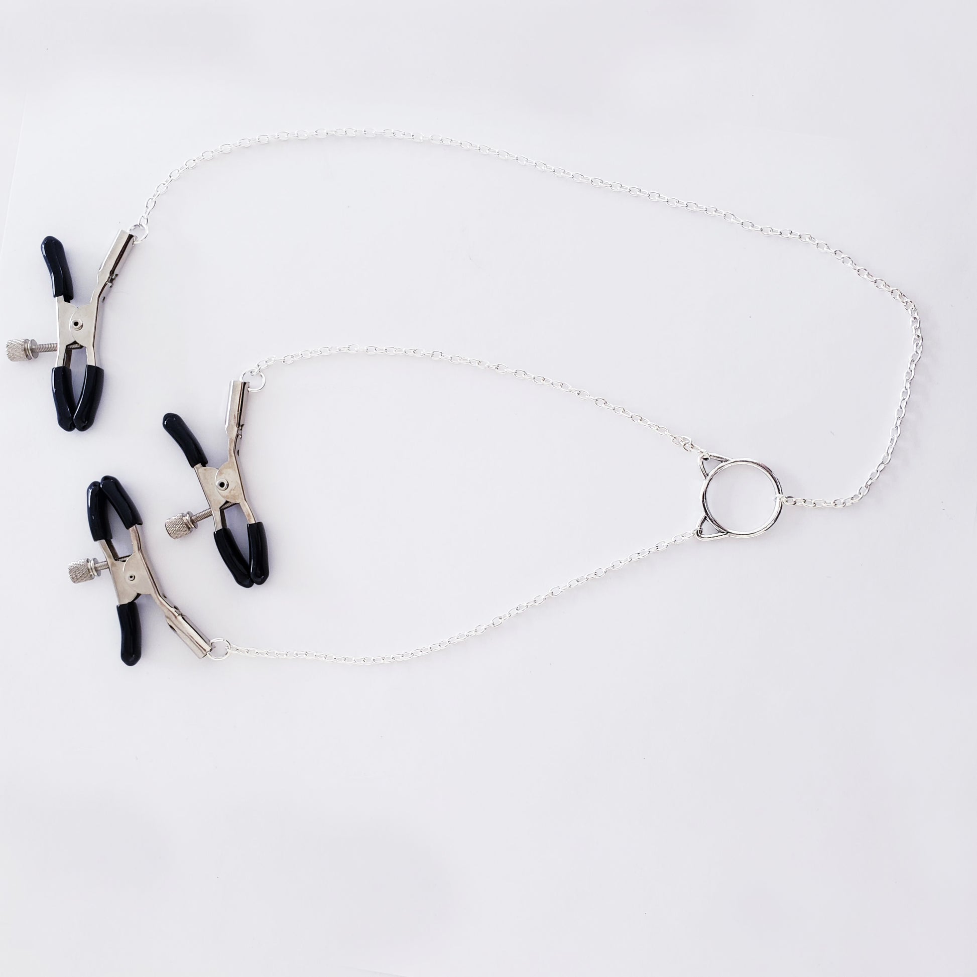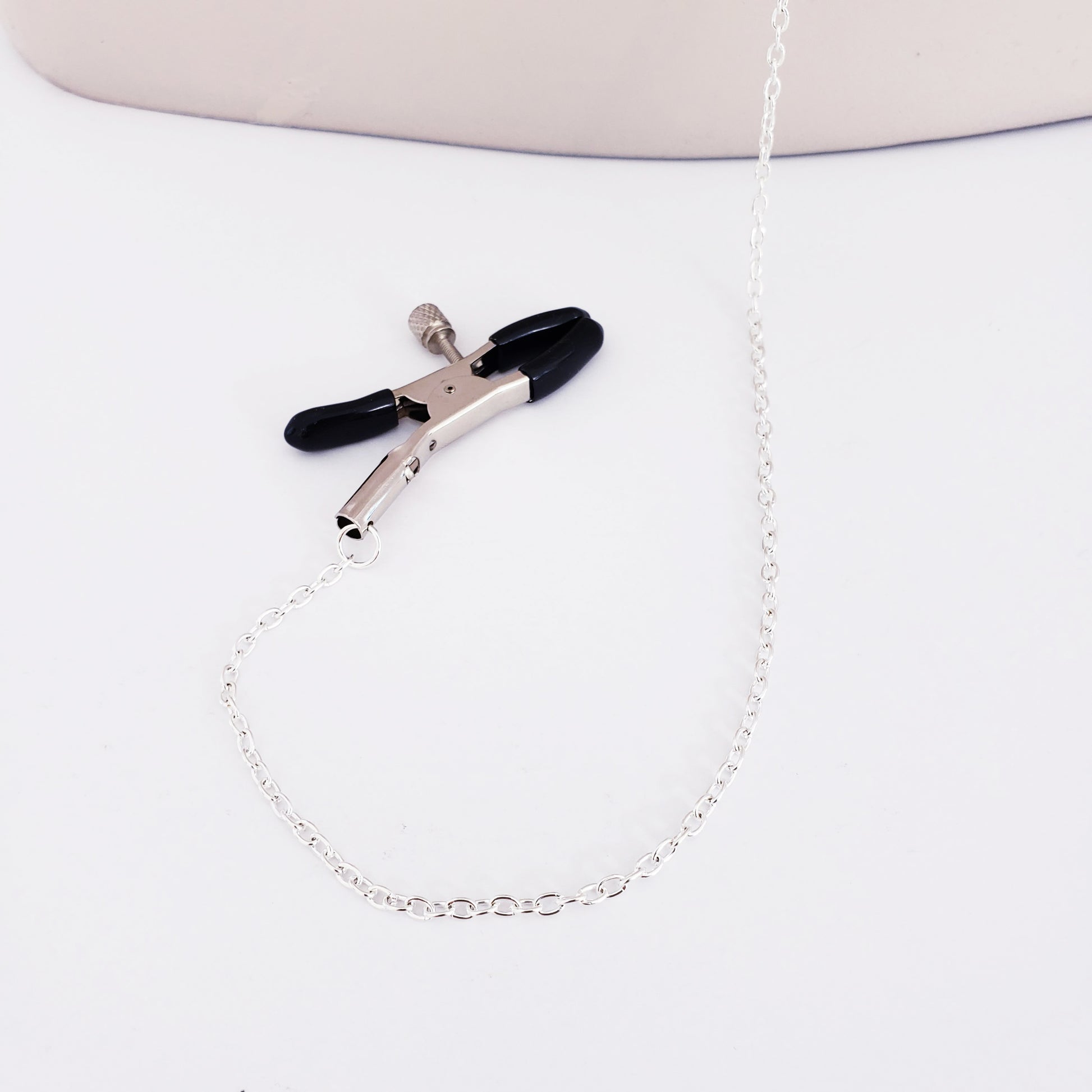 Kitten Shiny Silver Iron Chain Attached Nipple and Clitoral Clamps. Choose Adjustable or Tweezer Clamps.
