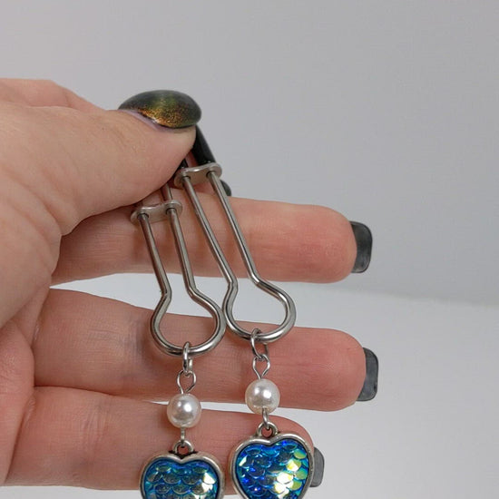 Straight Tweezer Clamps with Blue Mermaid/Dragon Scale Heart and White Pearl Bead.
