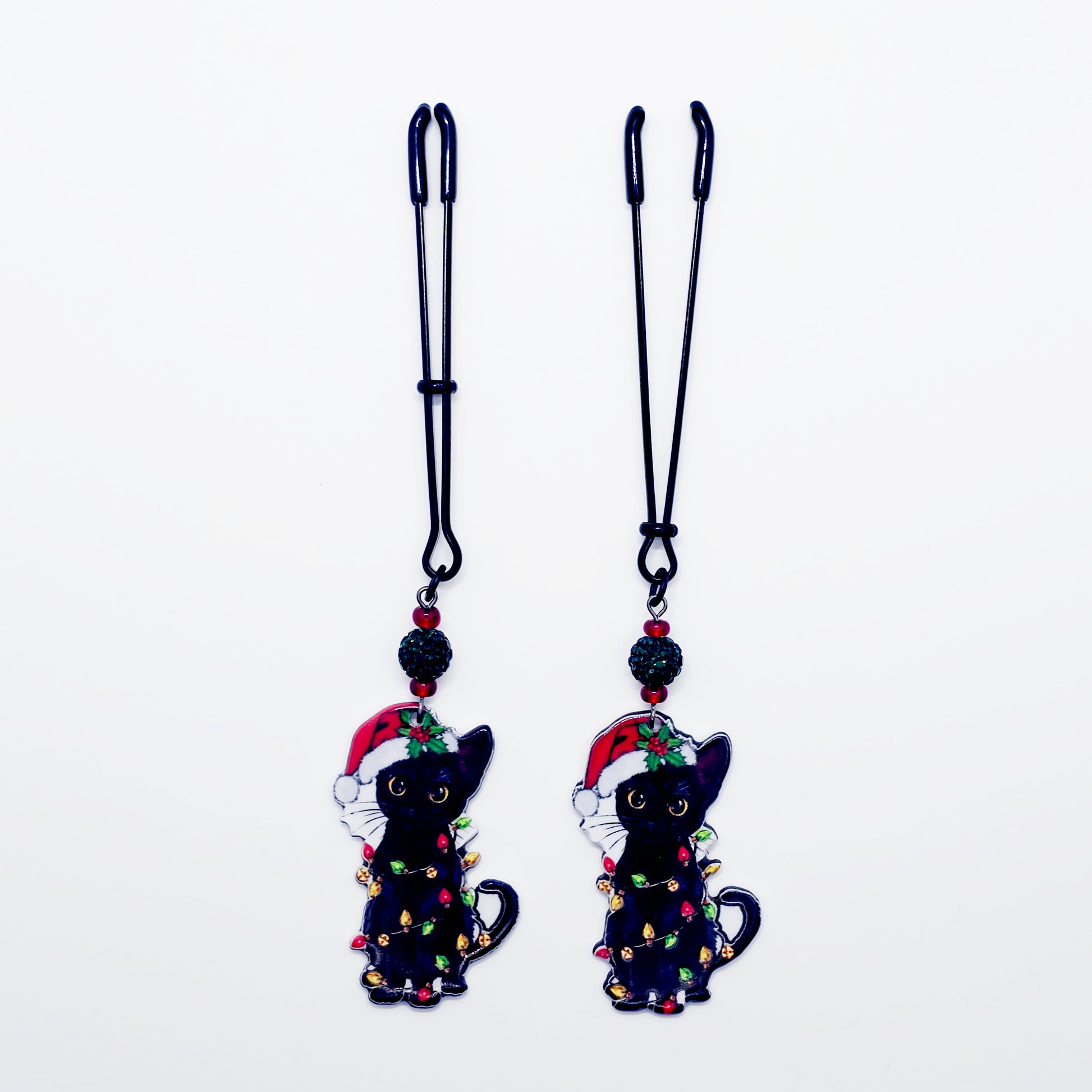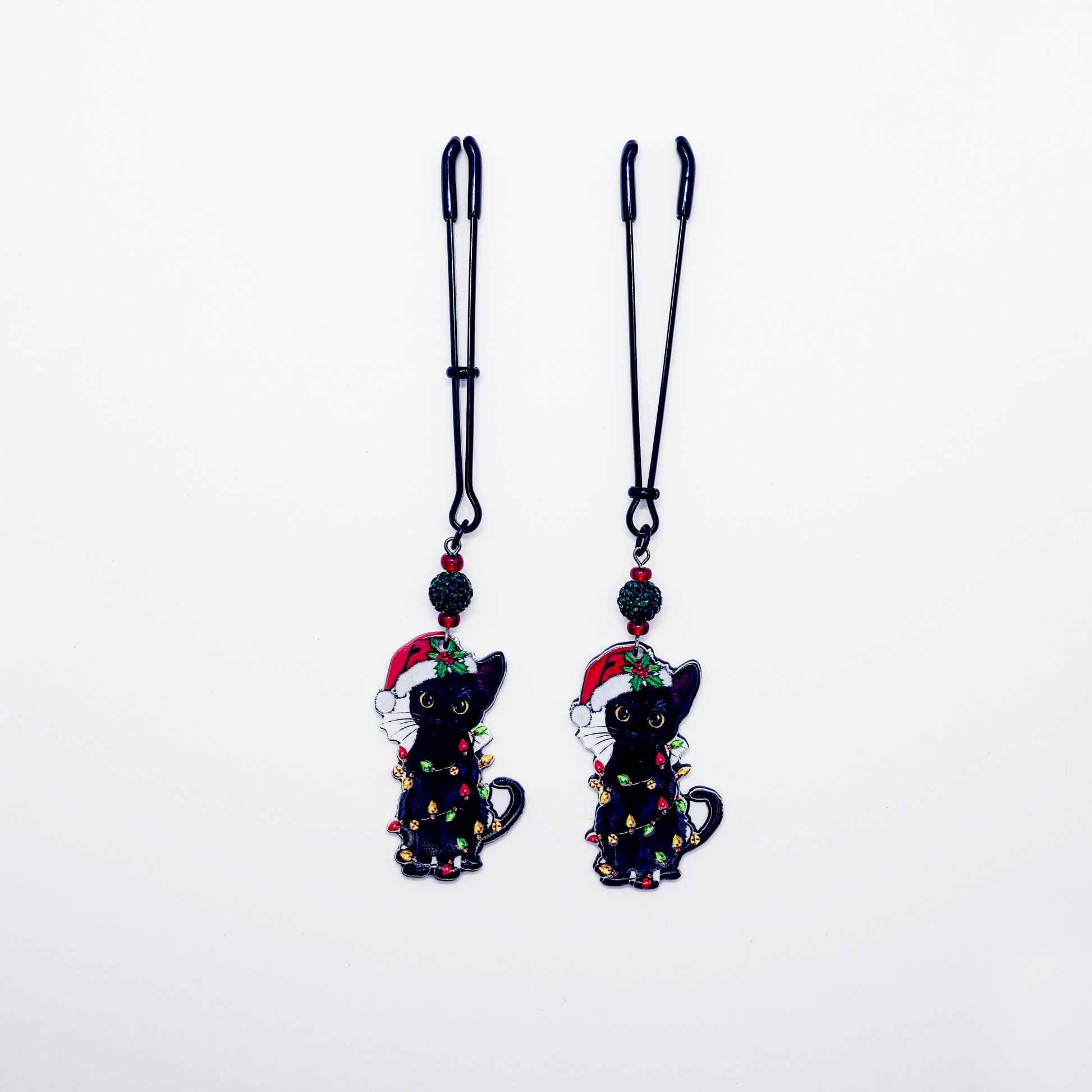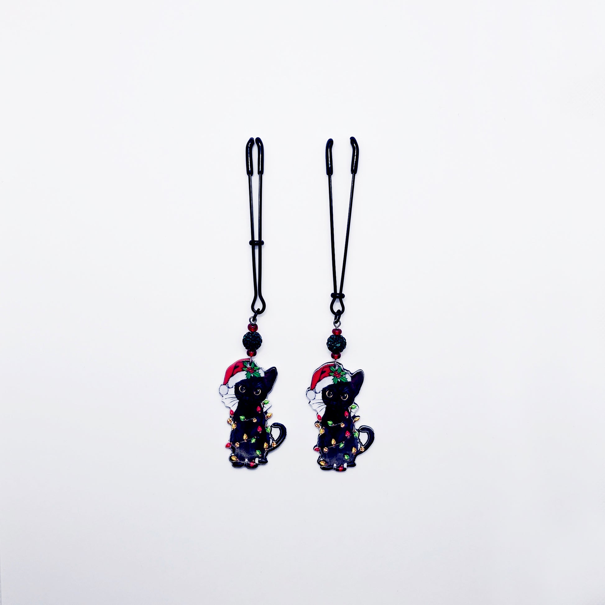 Has your kitten been naughty or nice? Spice up the holidays with our new Christmas bondage kitty nipple clamps. Featuring adjustable black tweezer nipple clamps adorned with sparkling green bead and a black kitty cat wrapped up in festive Christmas lights, wearing a Santa hat. Sold in pairs of two. Great Naughty Santa Gift or stocking stuffer for your BDSM sub/kitten.