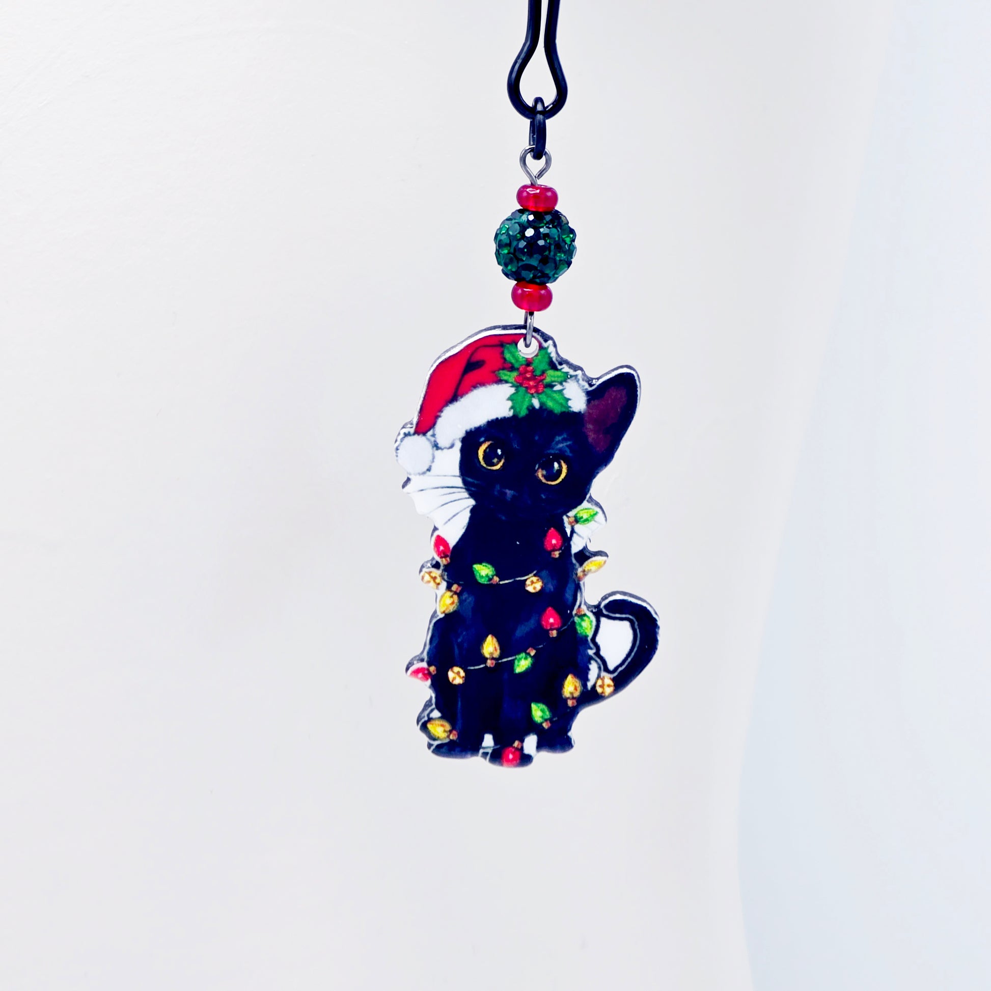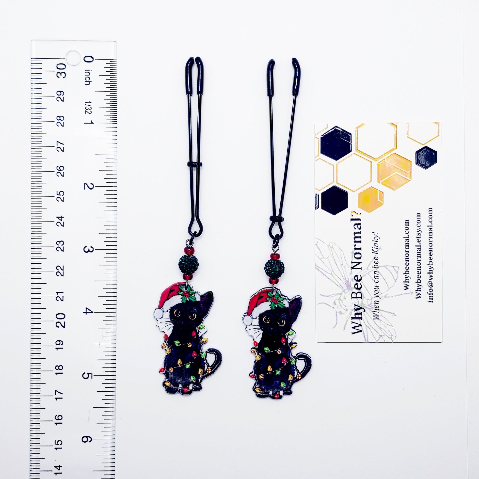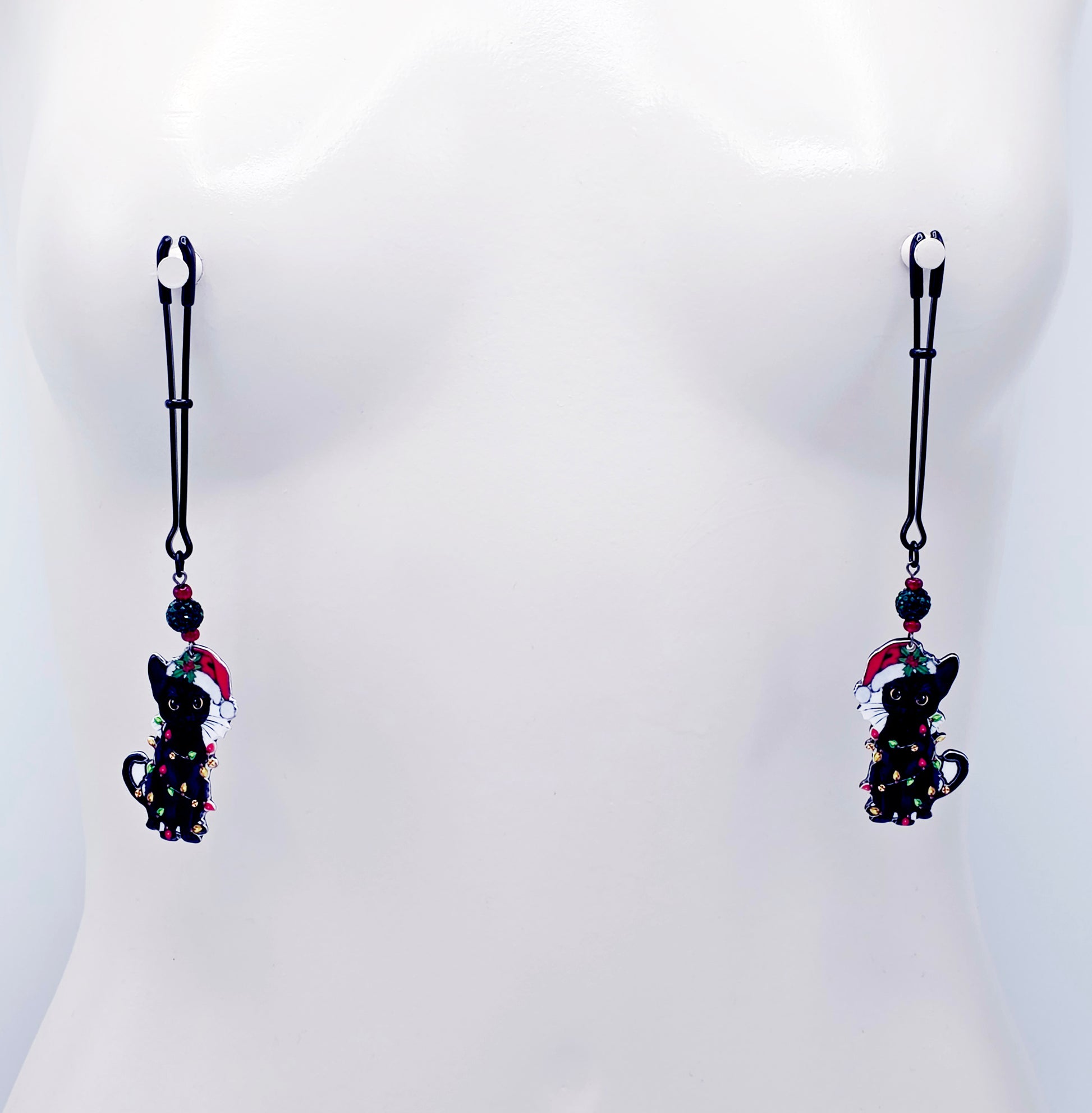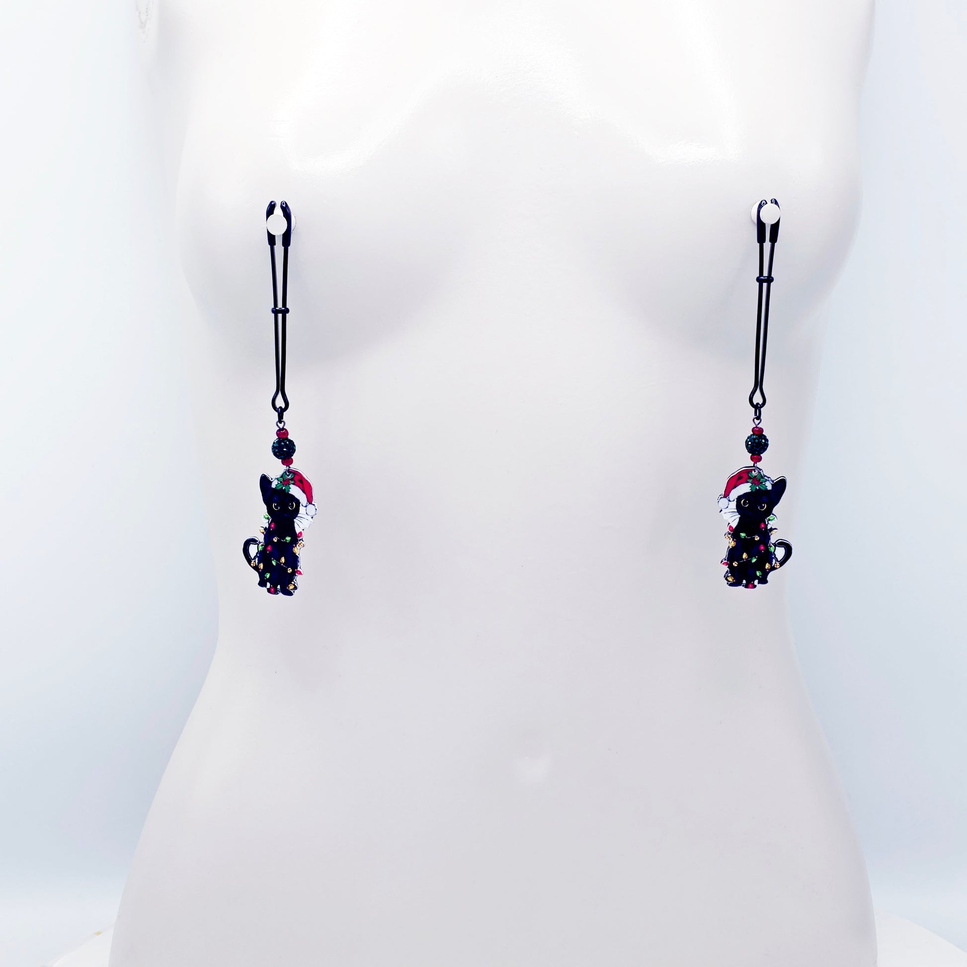 Has your kitten been naughty or nice? Spice up the holidays with our new Christmas bondage kitty nipple clamps. Featuring adjustable black tweezer nipple clamps adorned with sparkling green bead and a black kitty cat wrapped up in festive Christmas lights, wearing a Santa hat. Sold in pairs of two. Great Naughty Santa Gift or stocking stuffer for your BDSM sub/kitten.