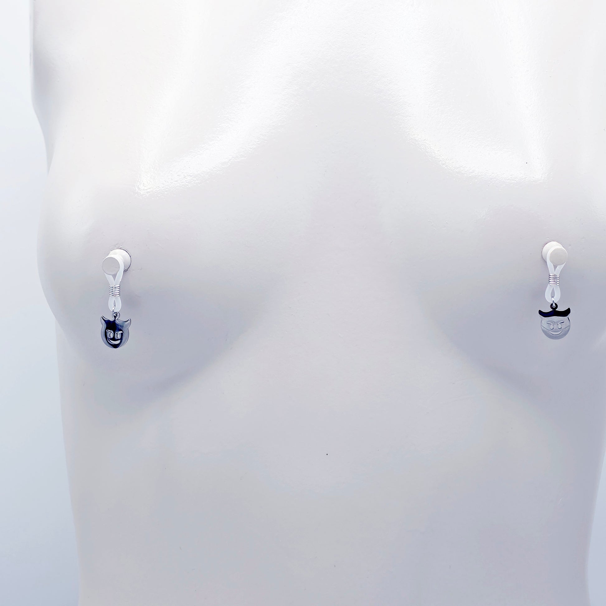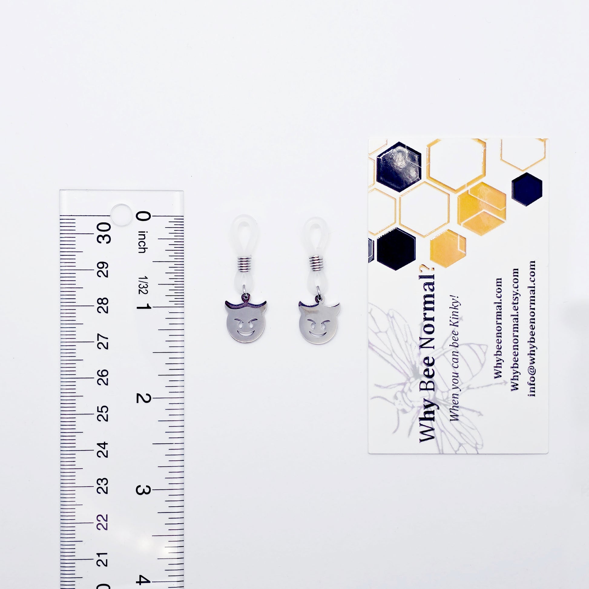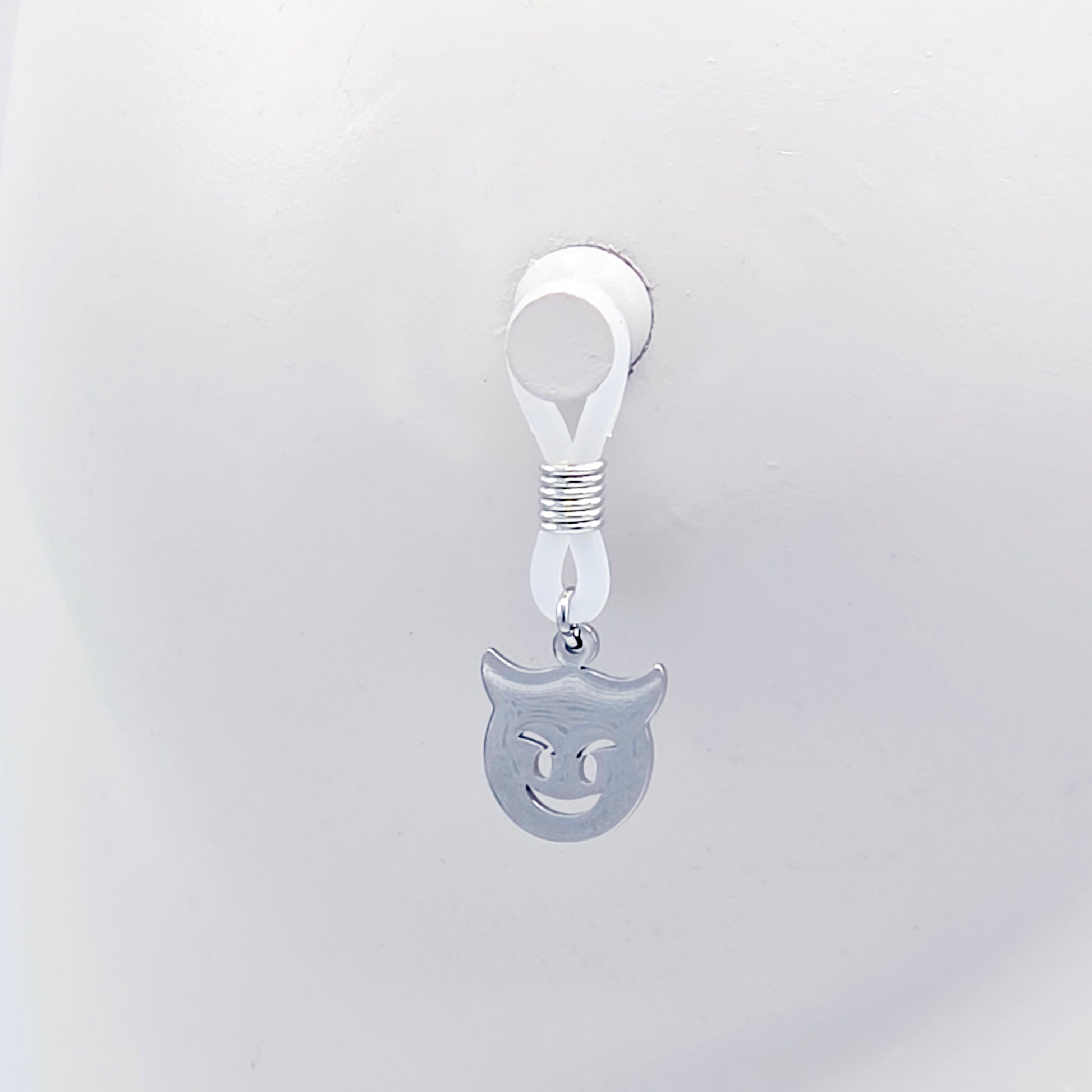 Small nipple nooses with stainless steel devil pendants. Unisex, fake piercing, non-piercing nipple jewelry for men or women with narrow nipples. Not recommended for nipples over 10mm wide.