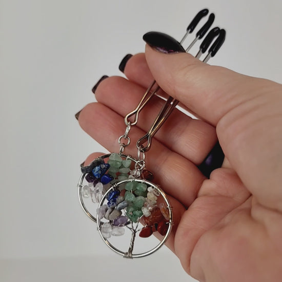 Nipple Clamps with Gemstone Tree of Life Pendant. Shown on Tweezer Clamps. Non-Piercing Nipple.