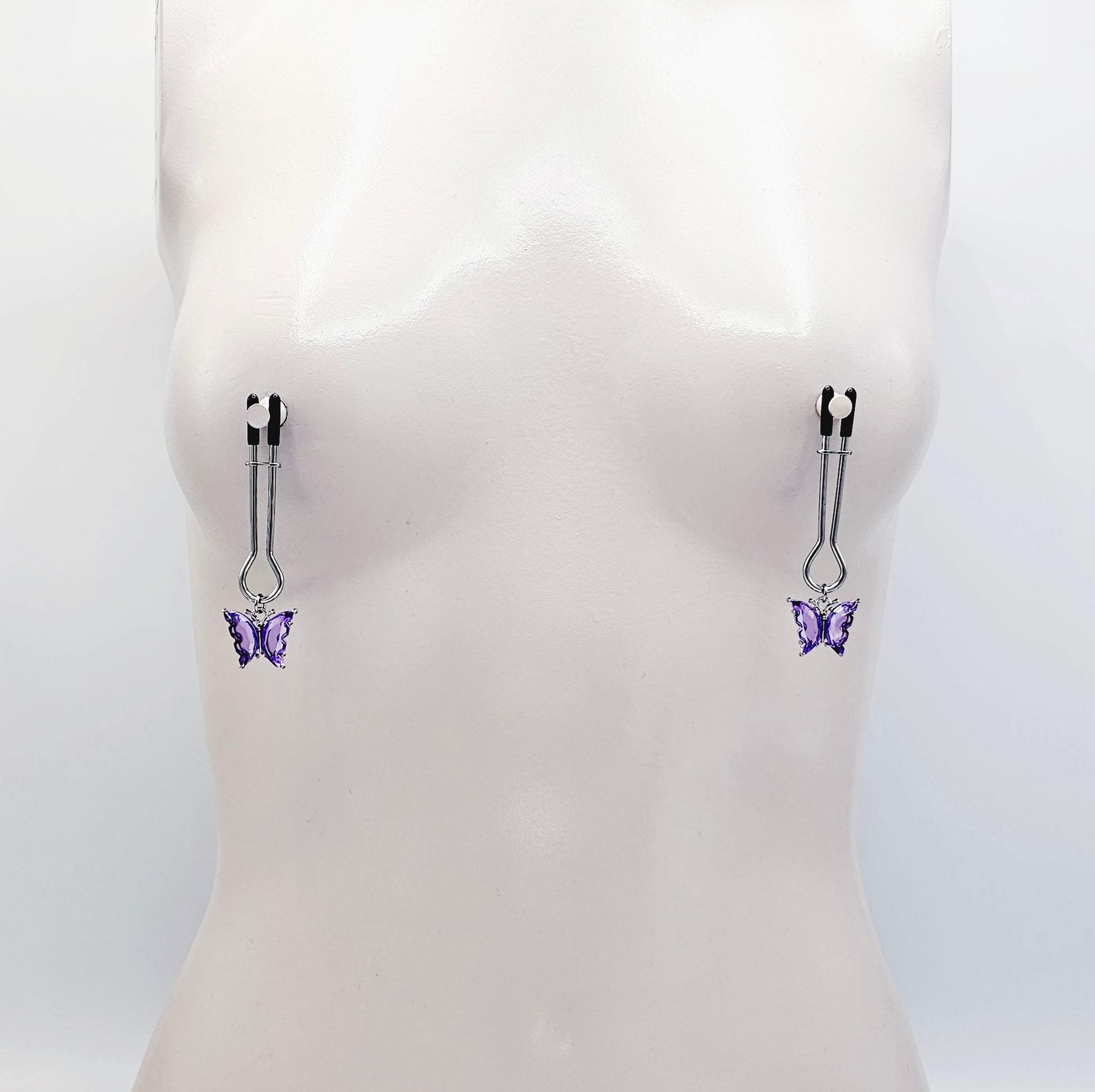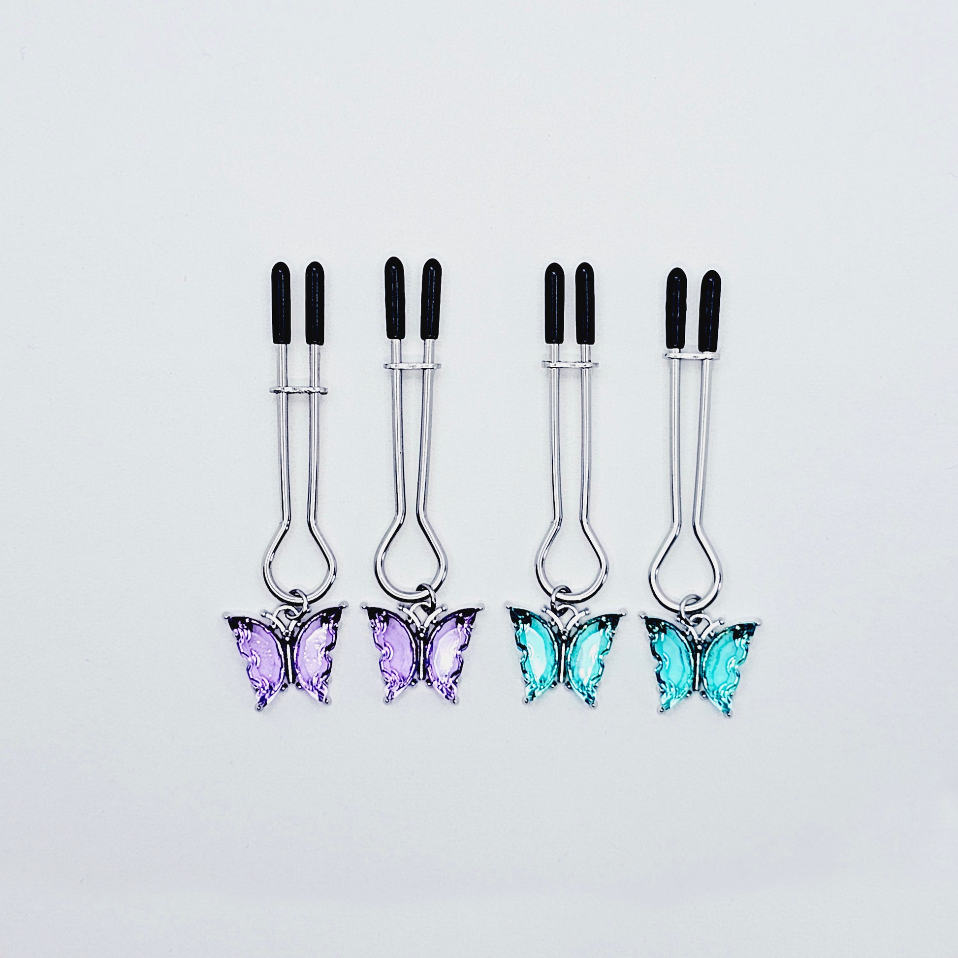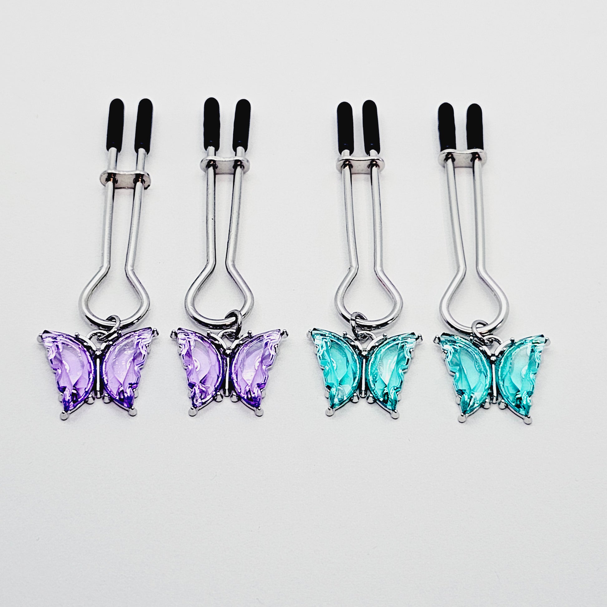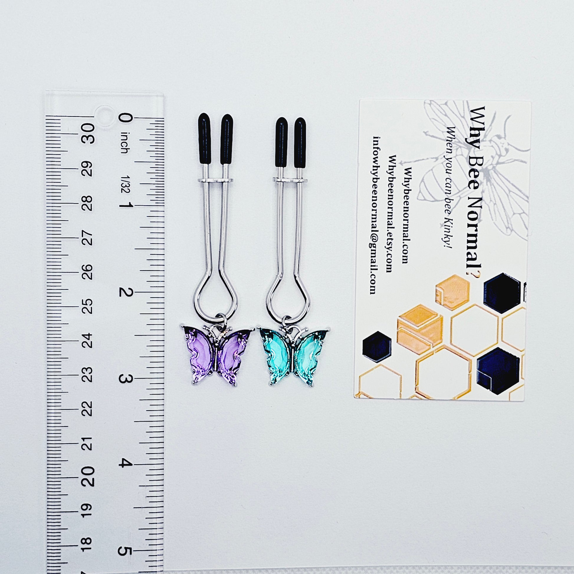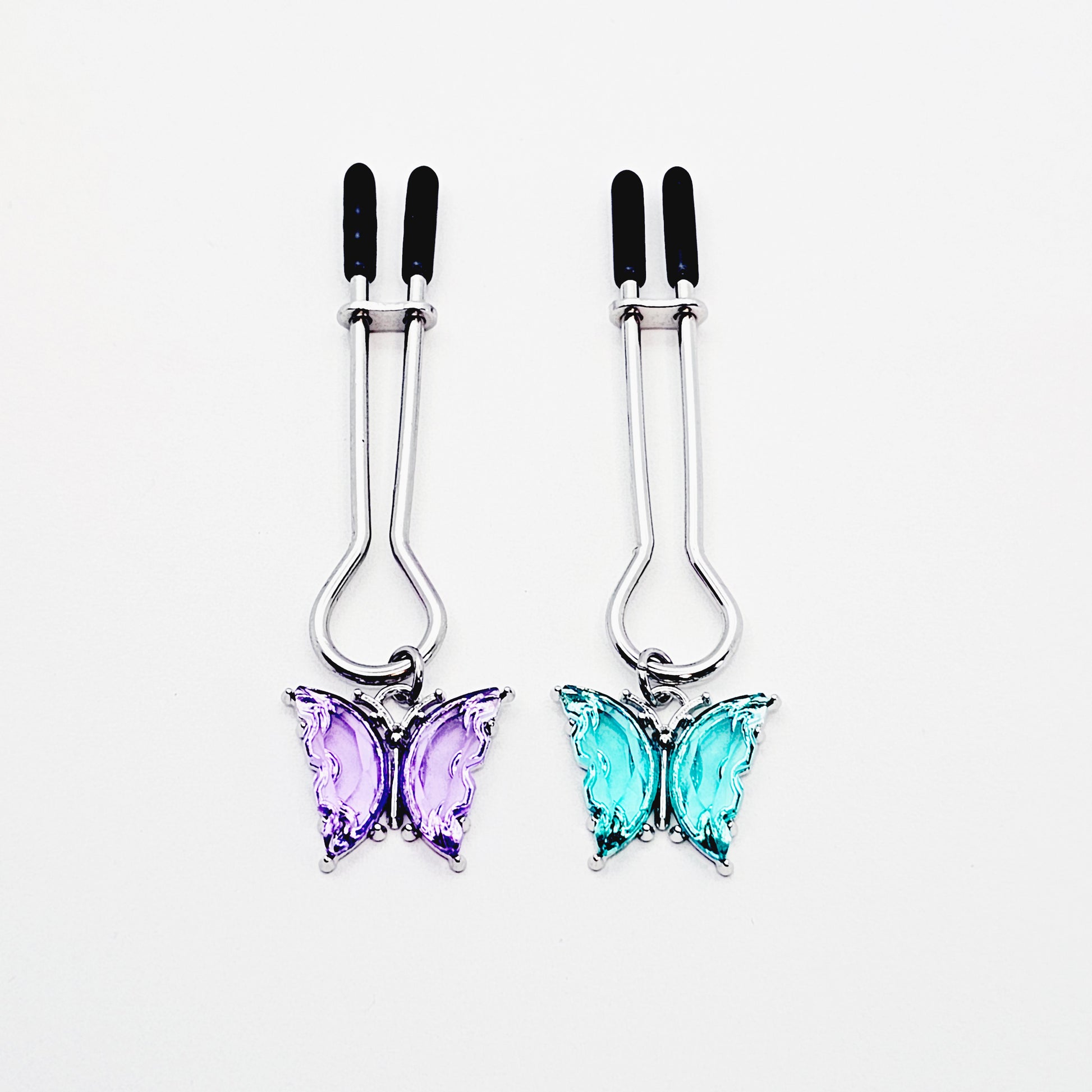 Nipple Clamps with Purple or Teal Butterflies. Adjustable Straight Tweezer Clamps.