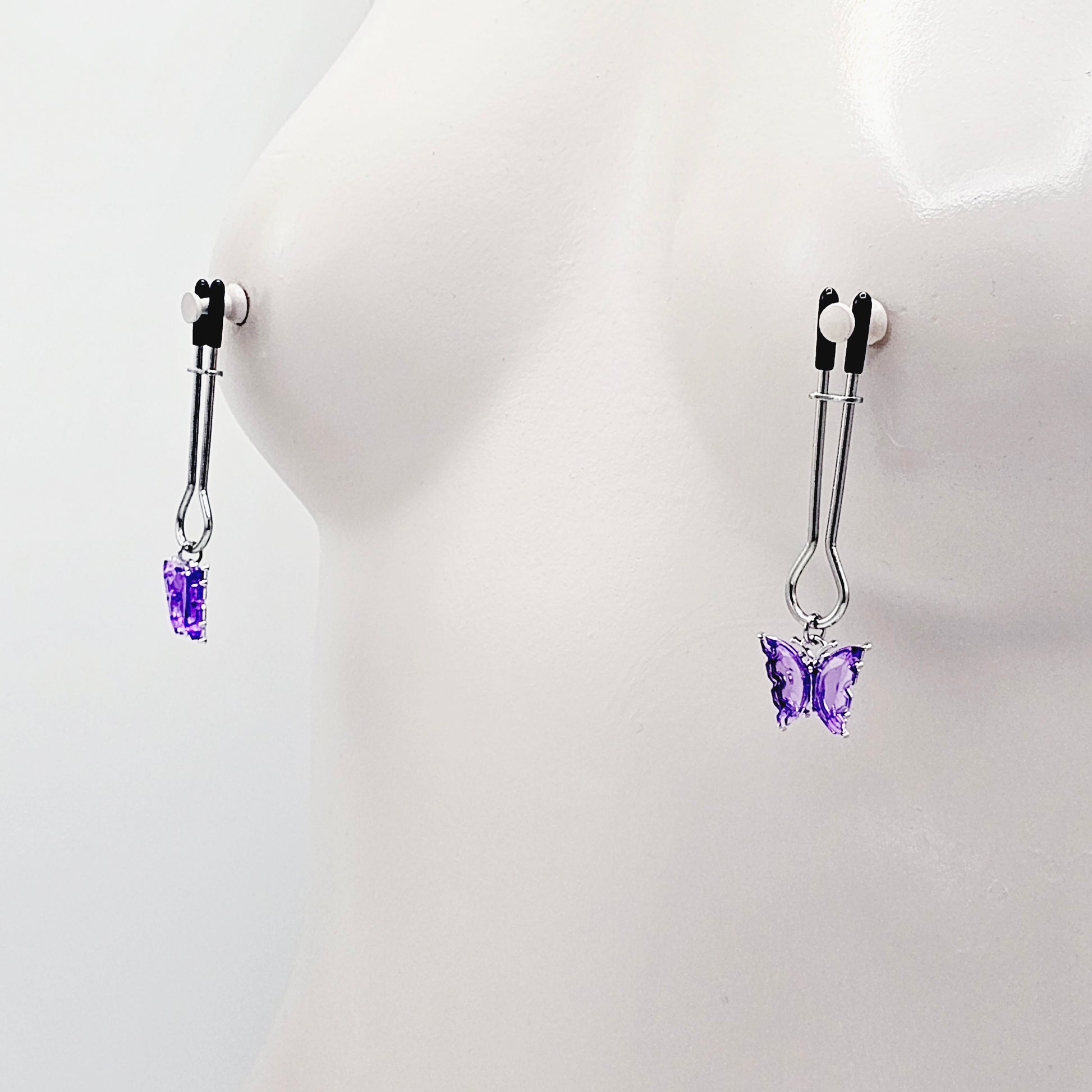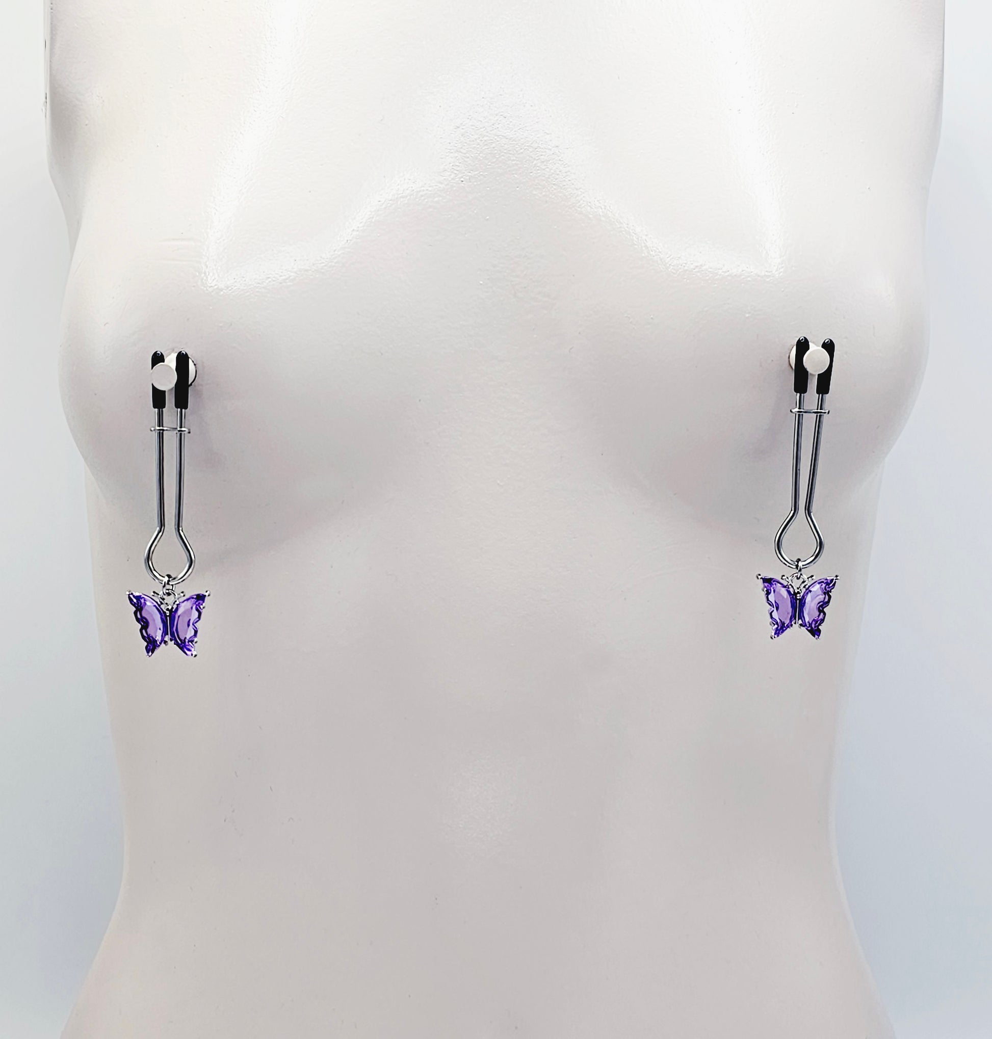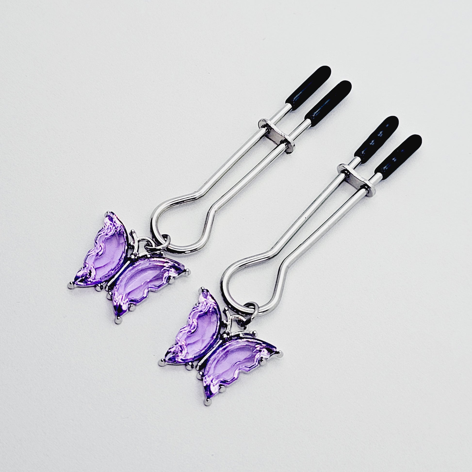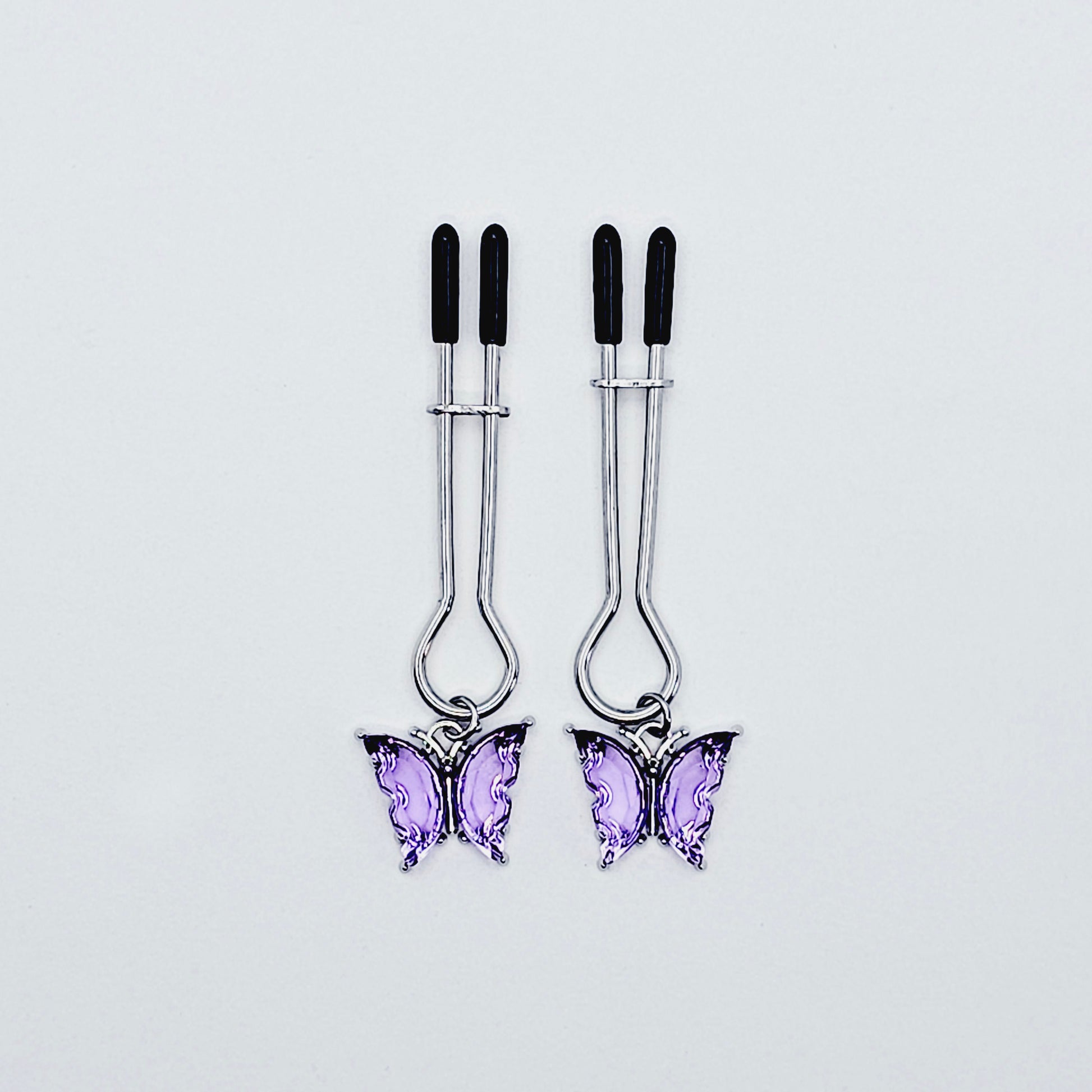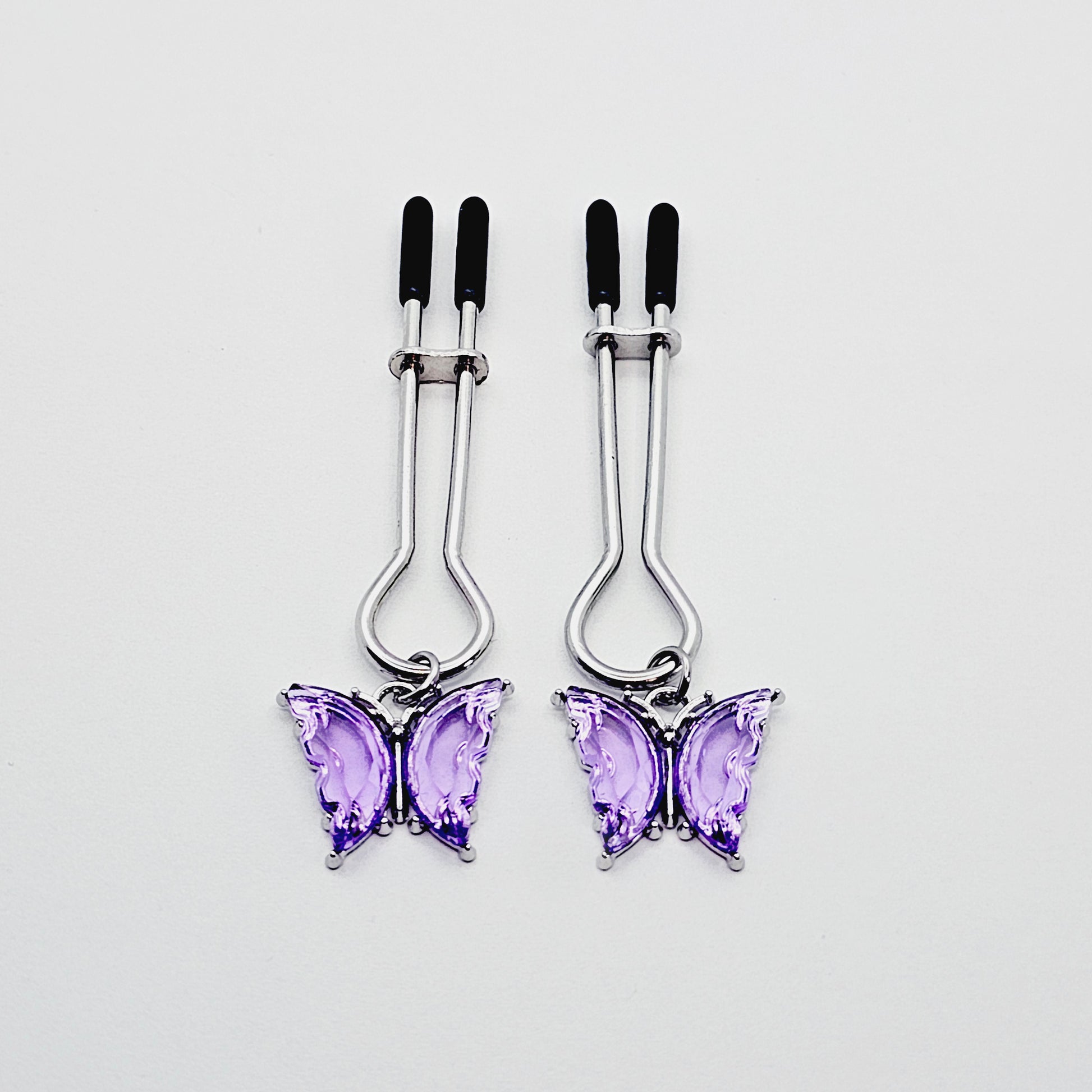 Nipple Clamps with Purple or Teal Butterflies. Adjustable Straight Tweezer Clamps.