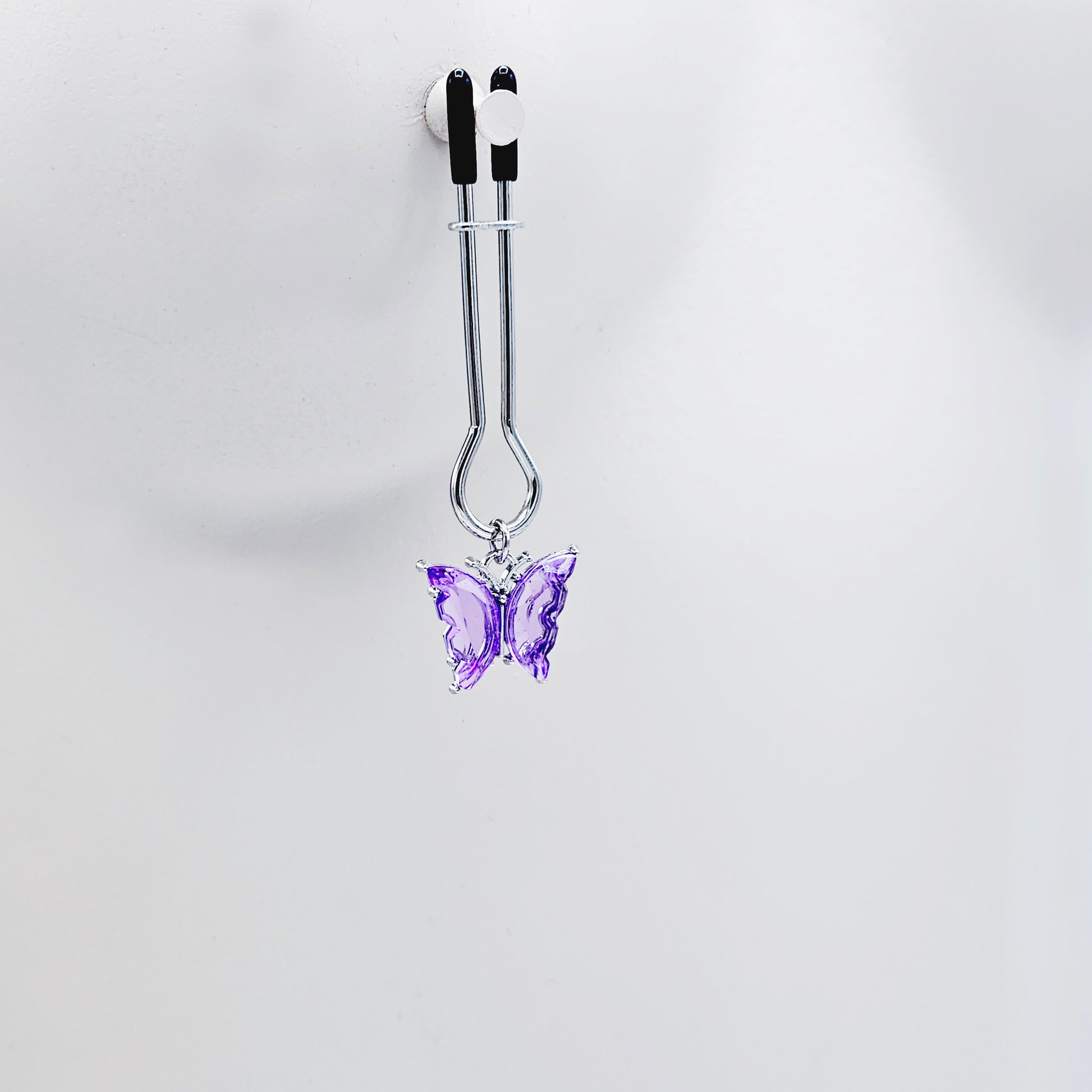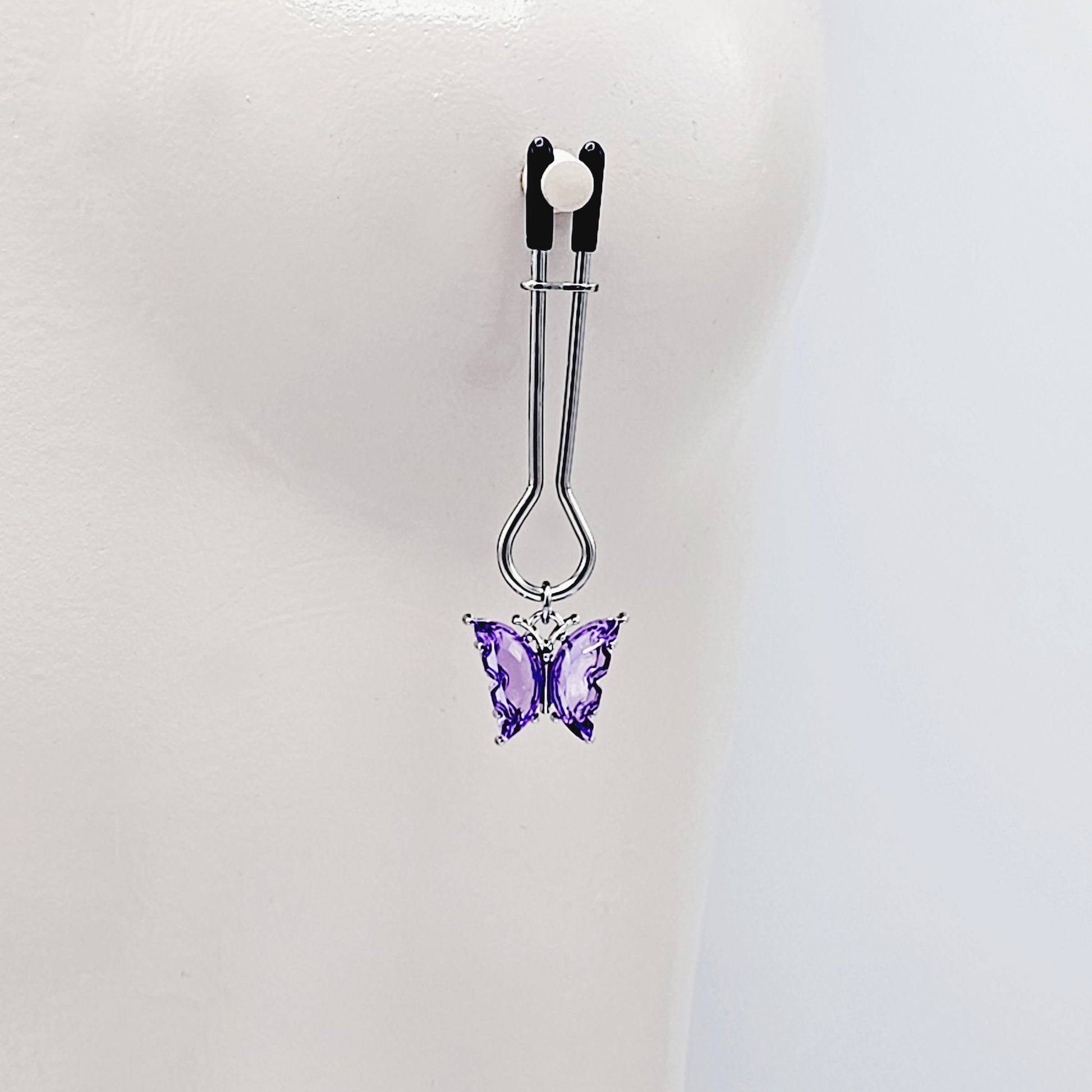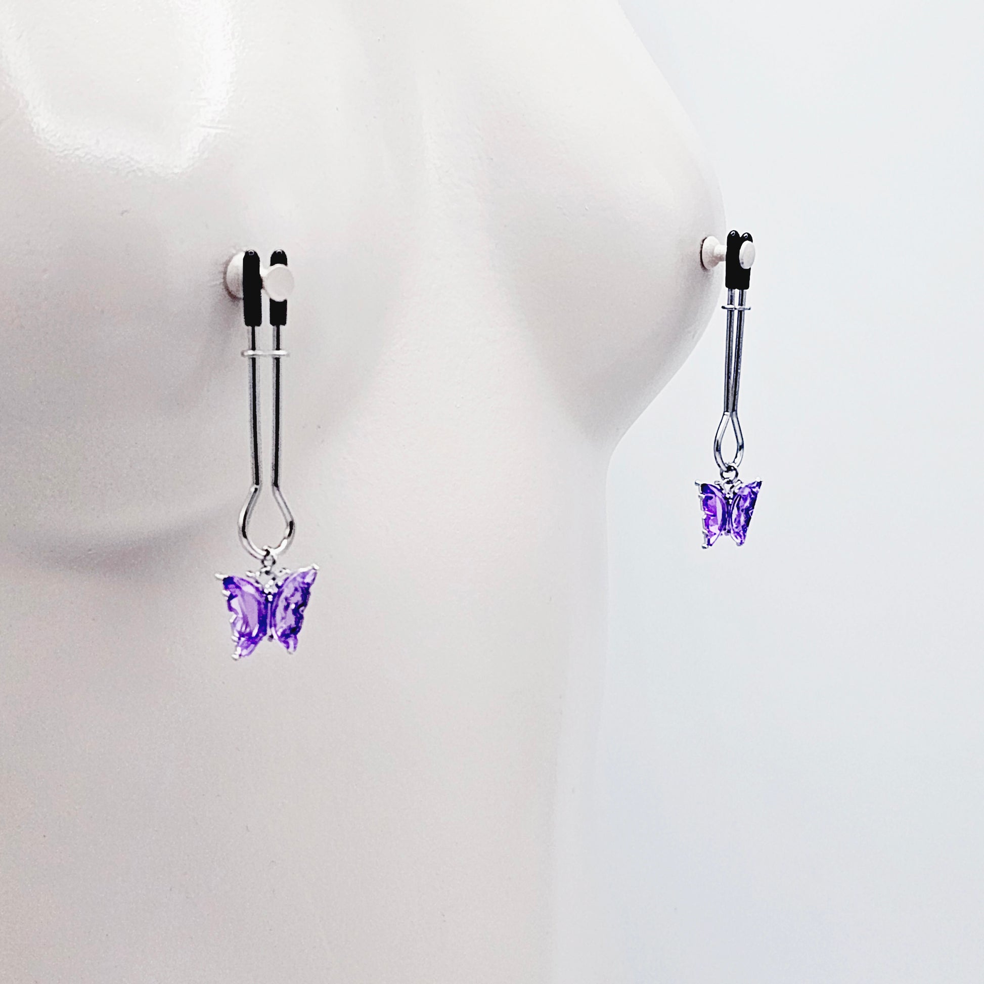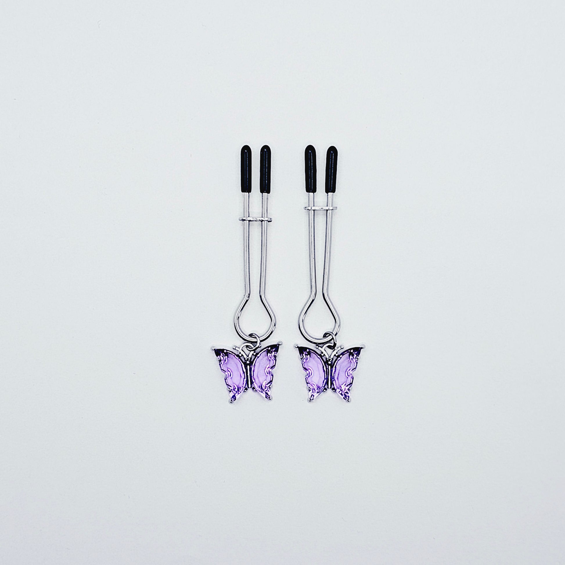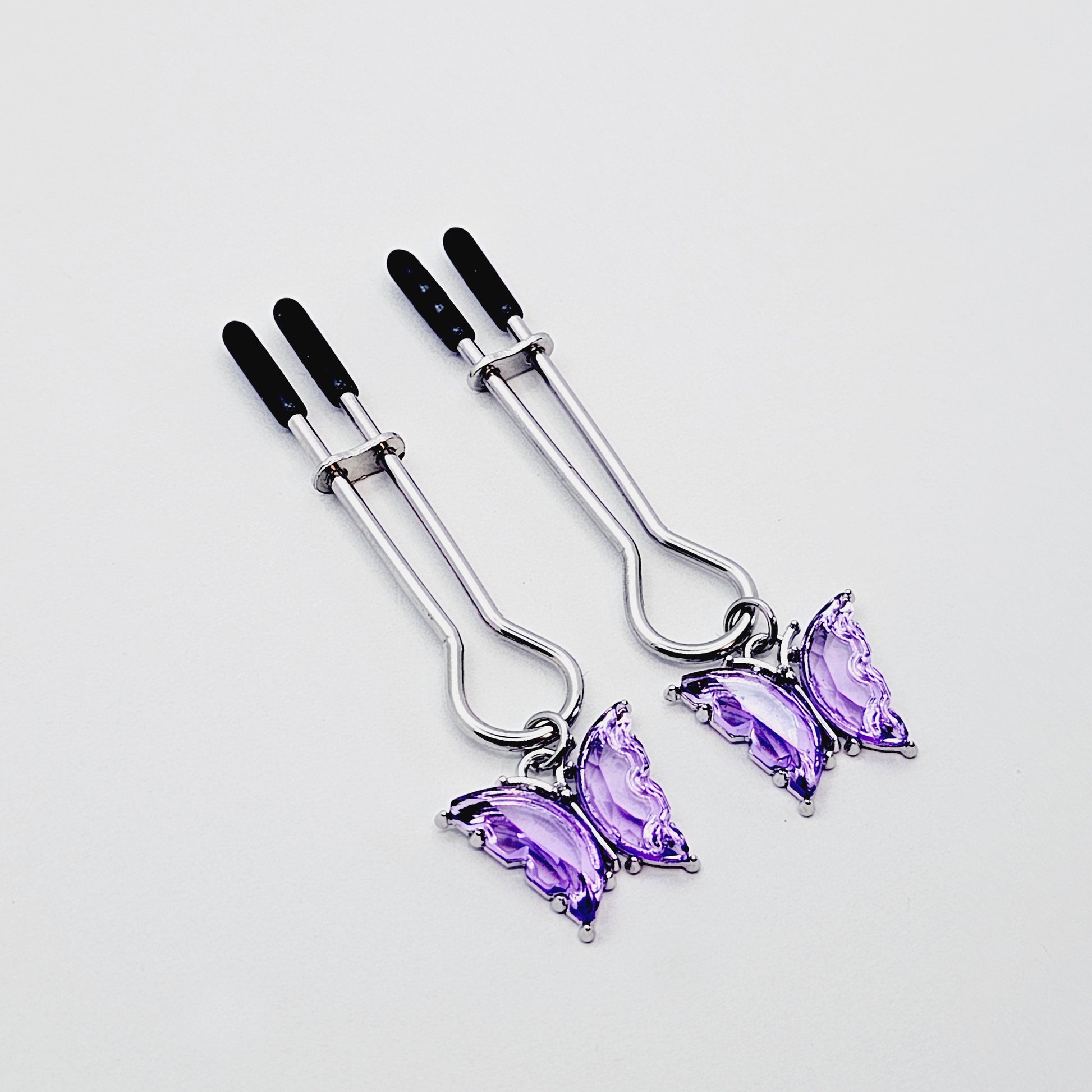 Nipple Clamps with Purple or Teal Butterflies. Adjustable Straight Tweezer Clamps.
