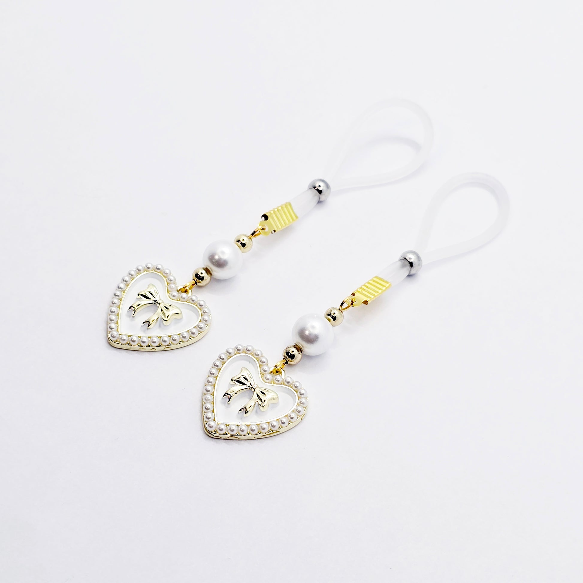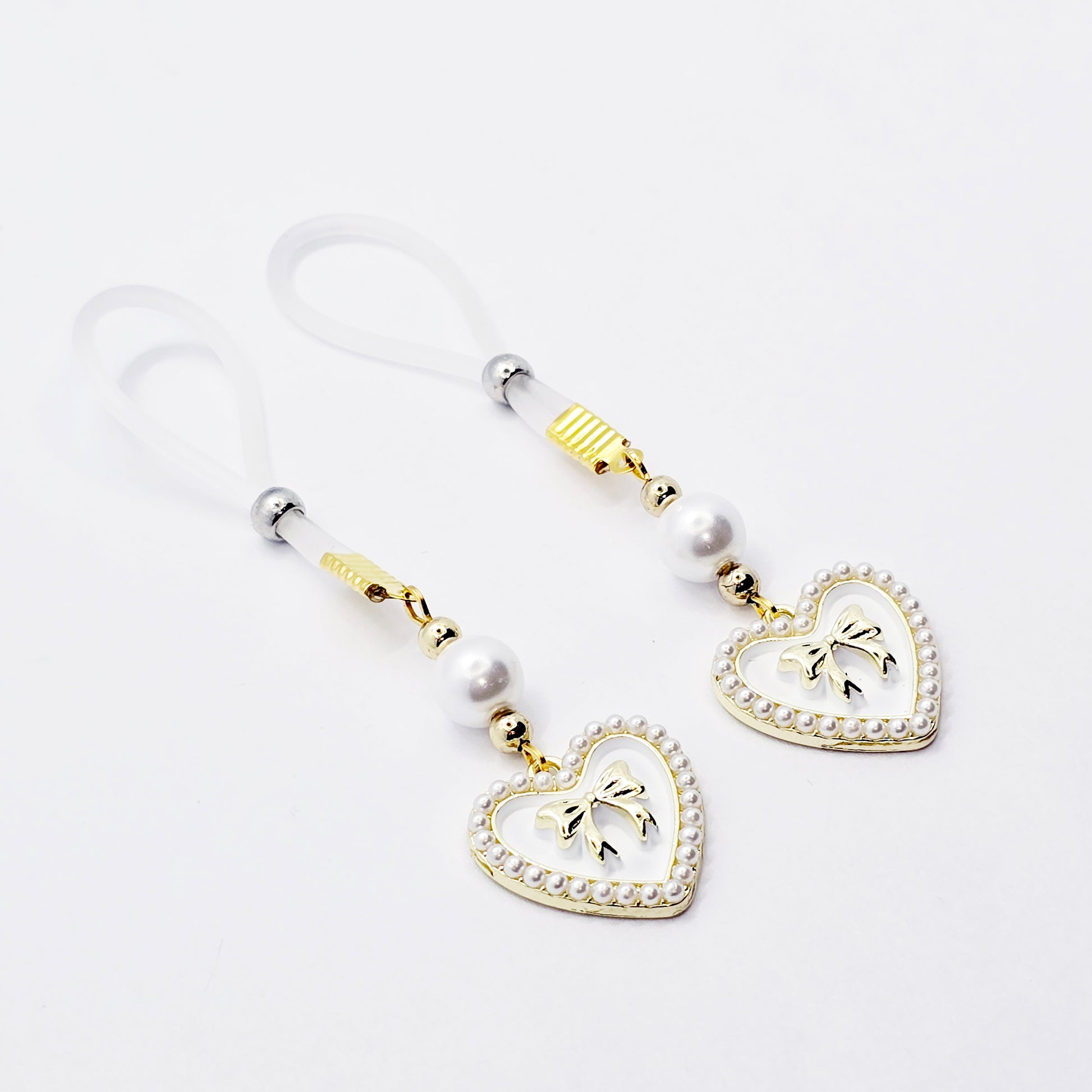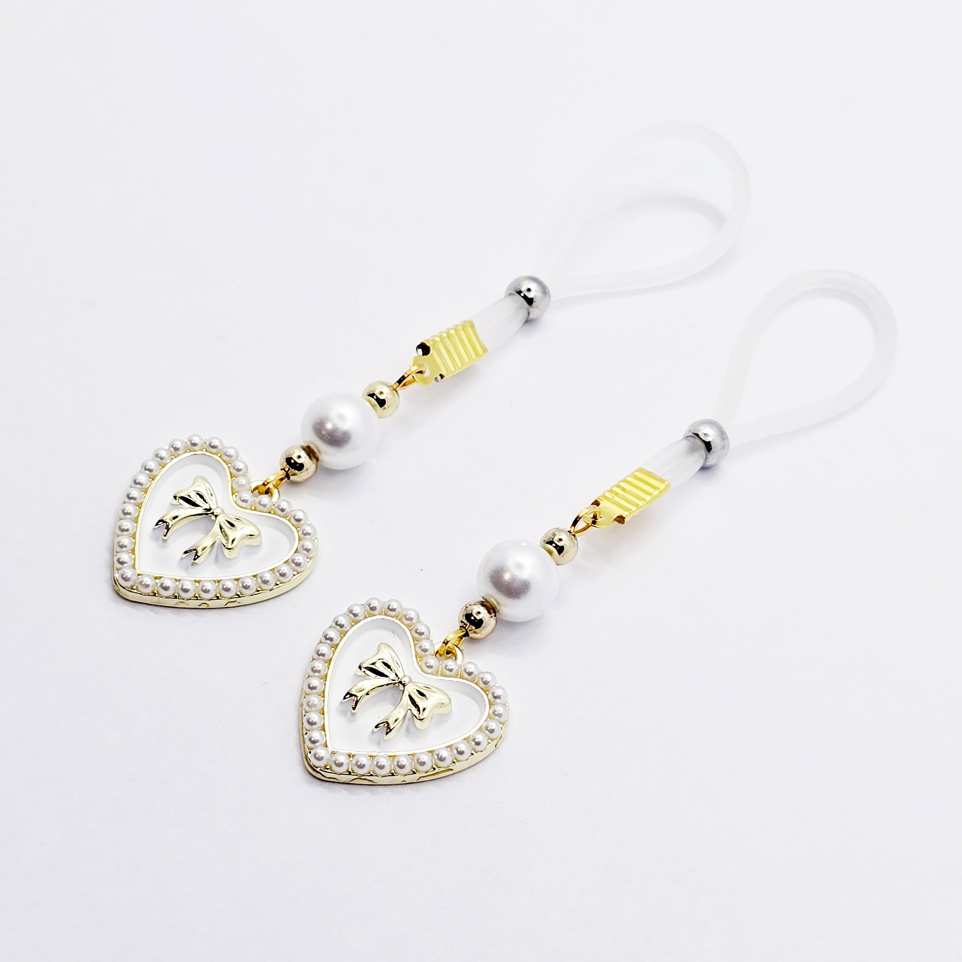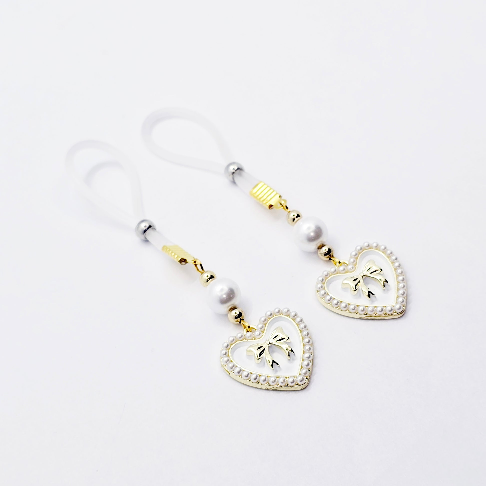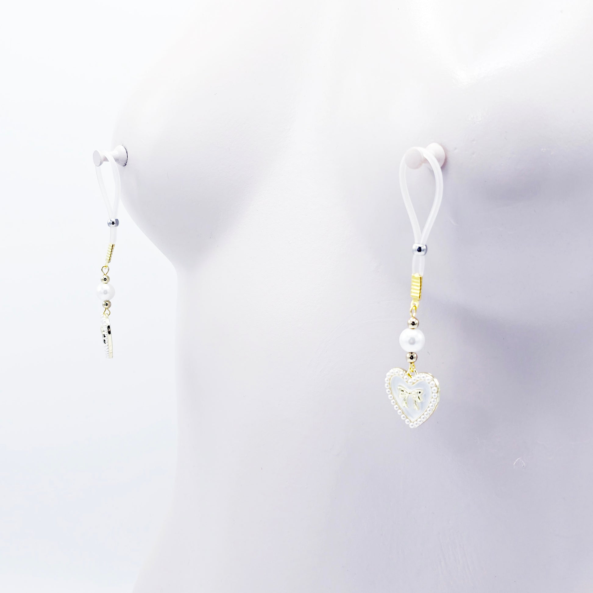 Heart and Pearl Nipple Dangles on Non-Piercing Nipple Nooses or Your Choice of Nipple Clamps. ย Or if you choose to "๐๐๐๐ ๐๐๐ ๐๐๐๐๐" with nipple clamps, we have several options to choose from. ๐ Adjustable, Tweezer, Alligator, C Clamps, and Clover Clamps available.