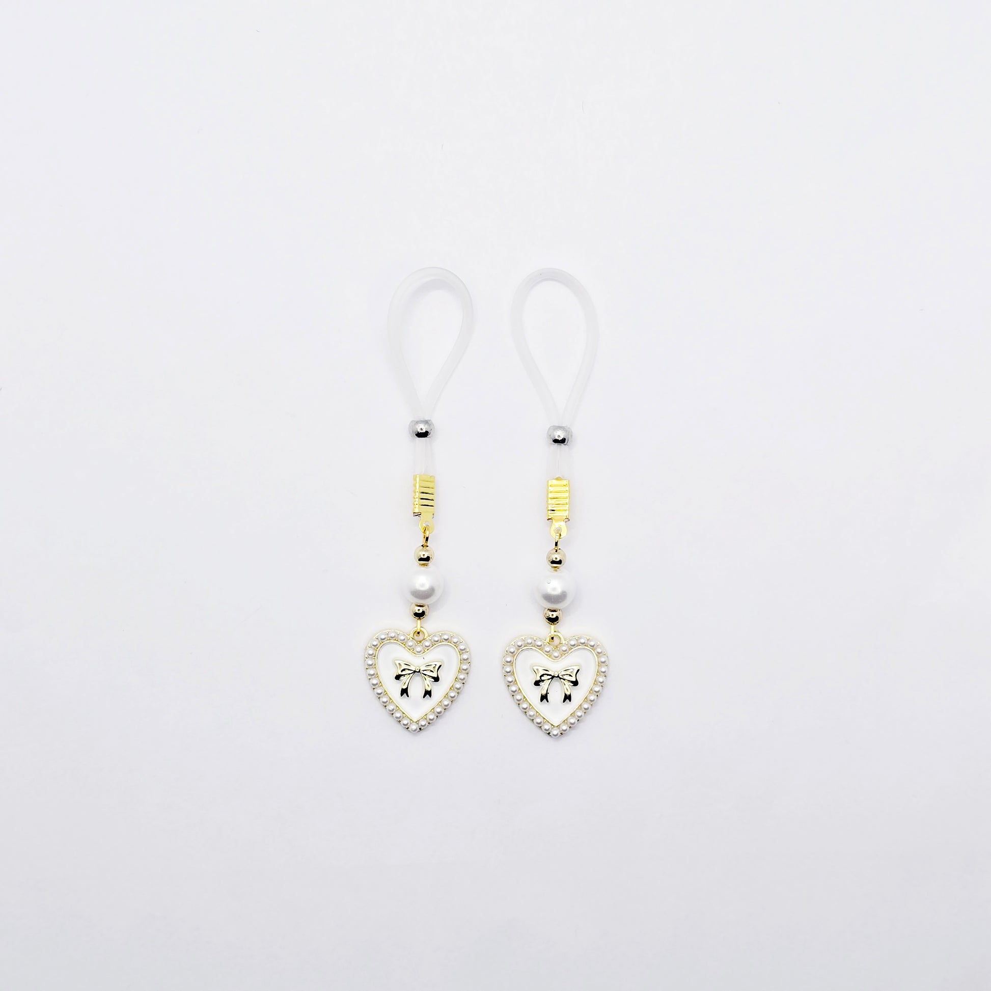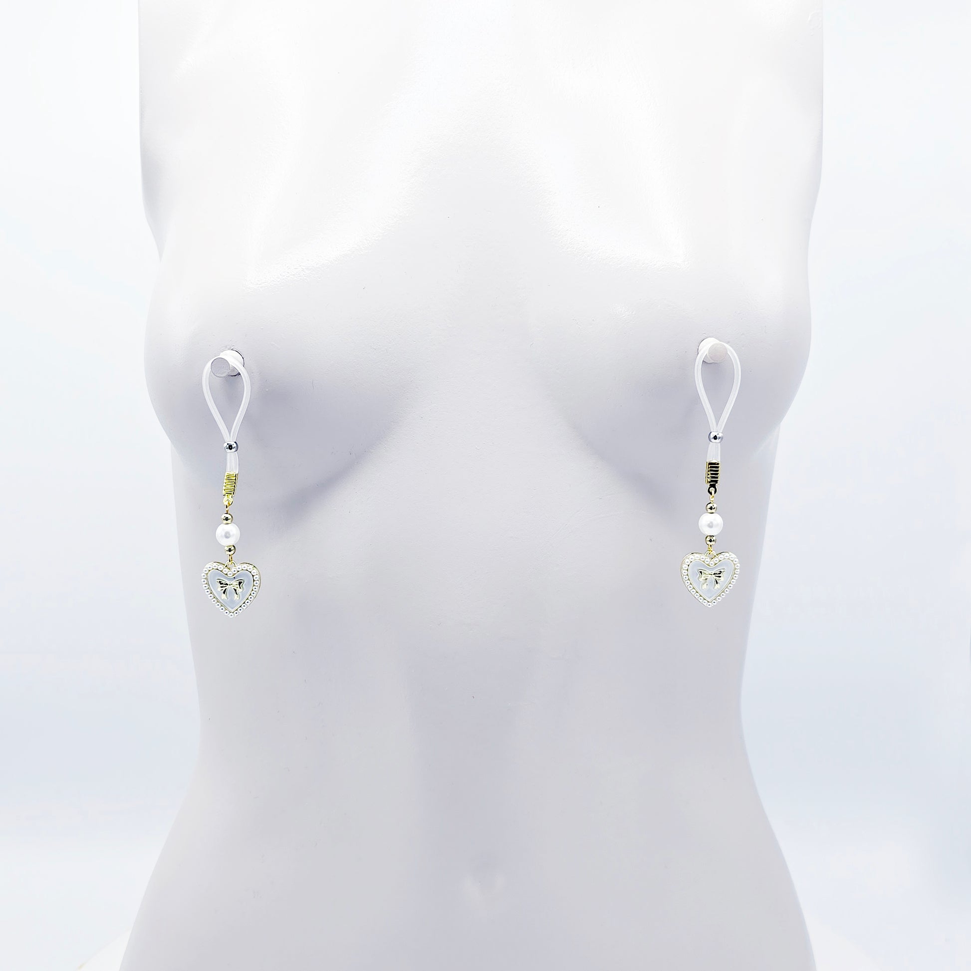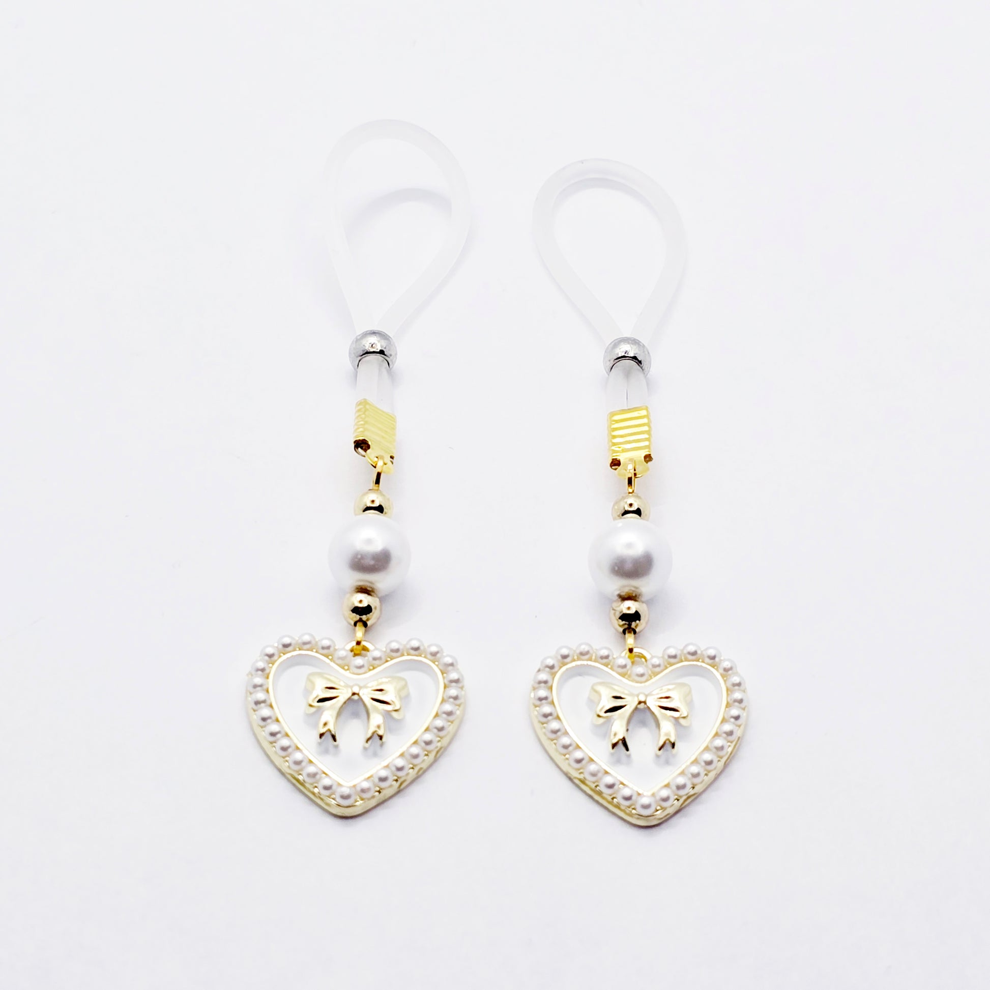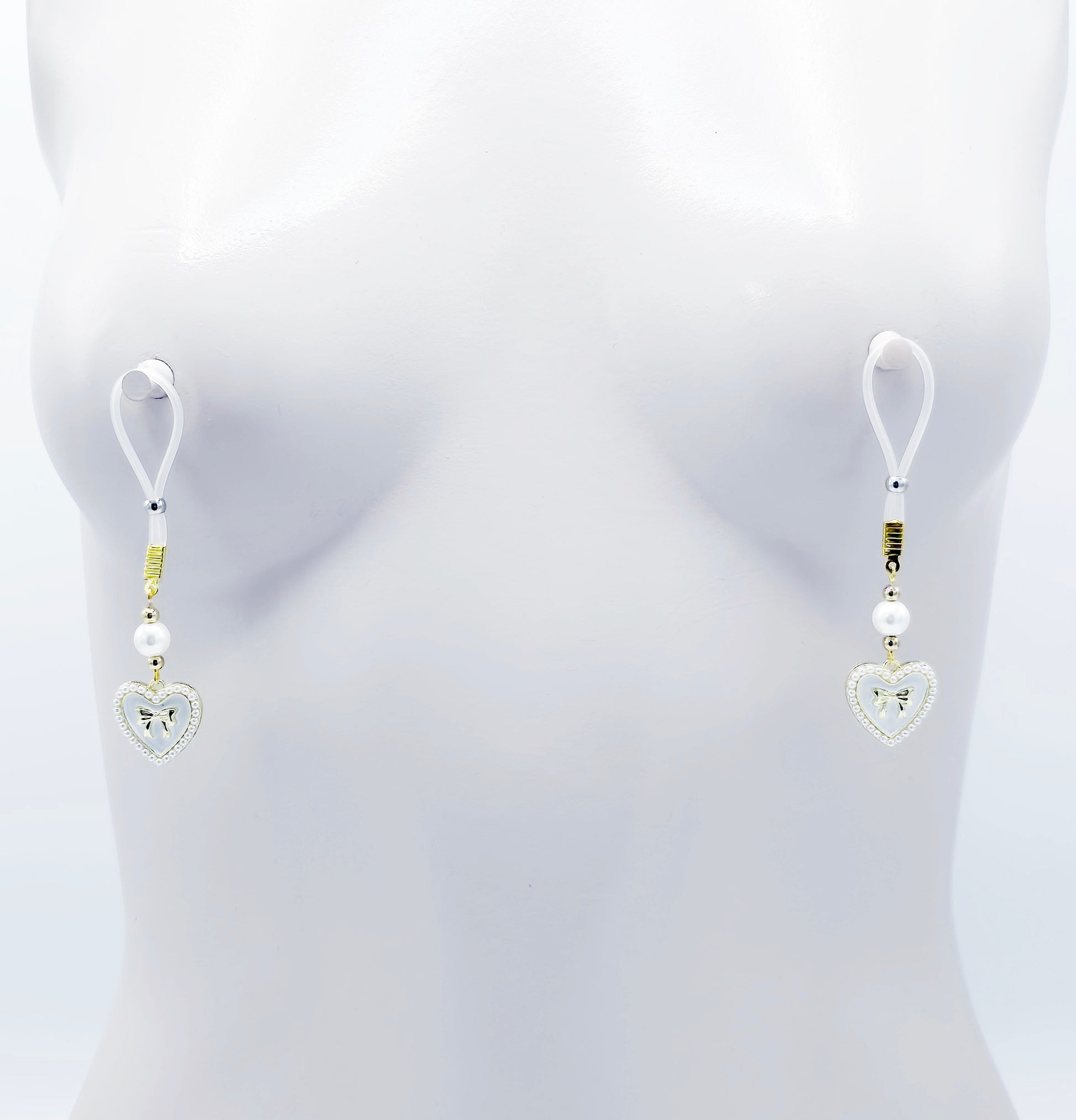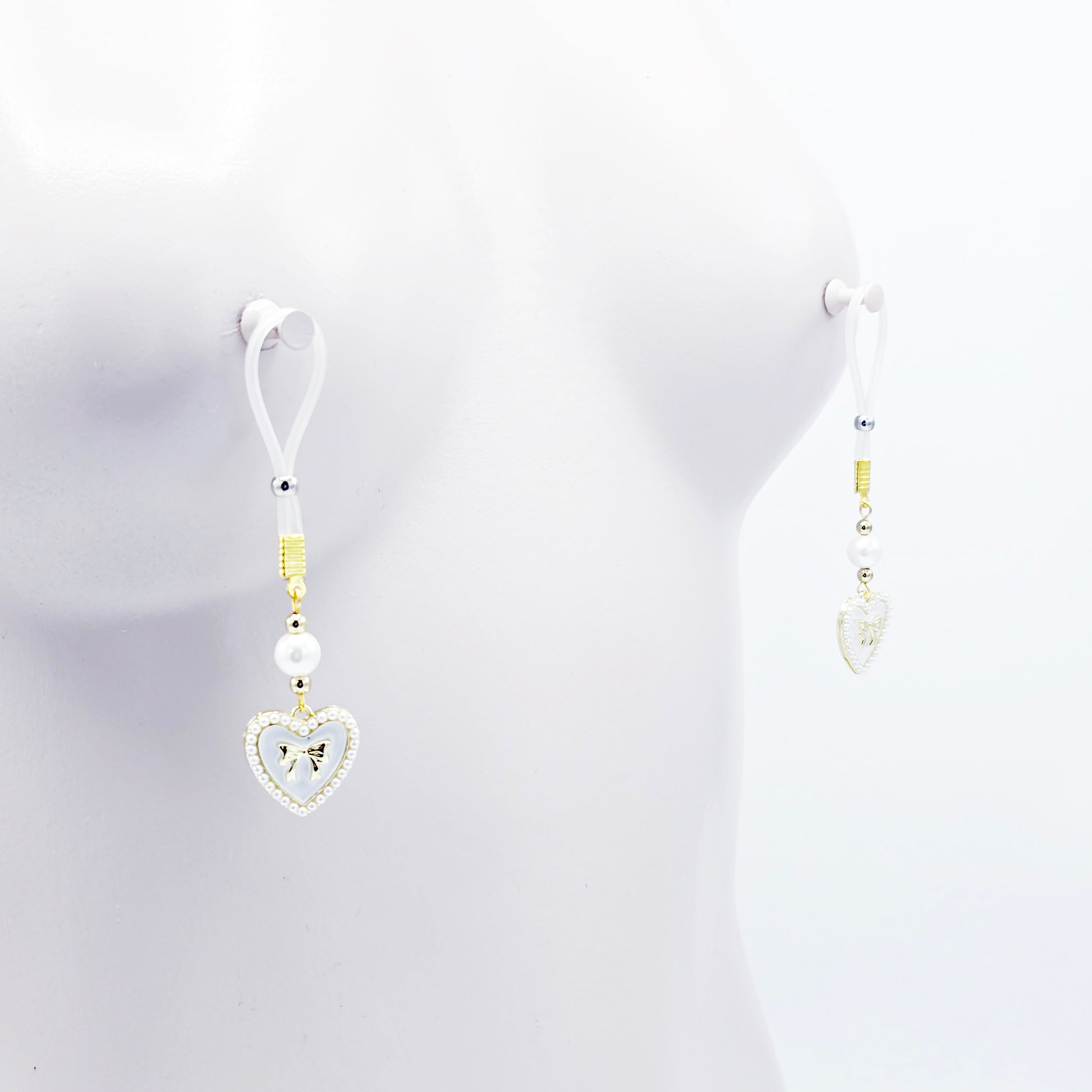 Heart and Pearl Nipple Dangles on Non-Piercing Nipple Nooses or Your Choice of Nipple Clamps. ย Or if you choose to "๐๐๐๐ ๐๐๐ ๐๐๐๐๐" with nipple clamps, we have several options to choose from. ๐ Adjustable, Tweezer, Alligator, C Clamps, and Clover Clamps available.