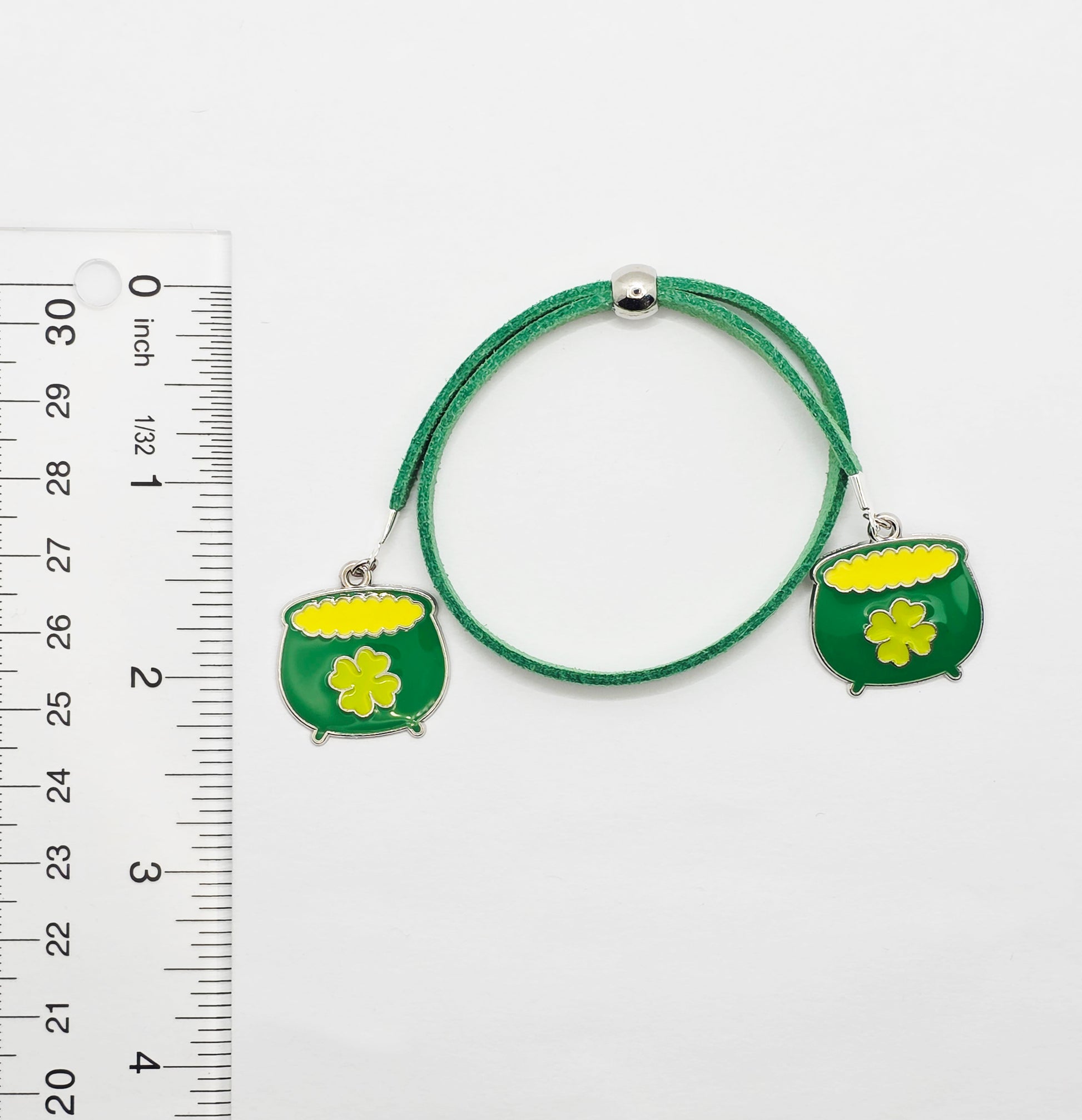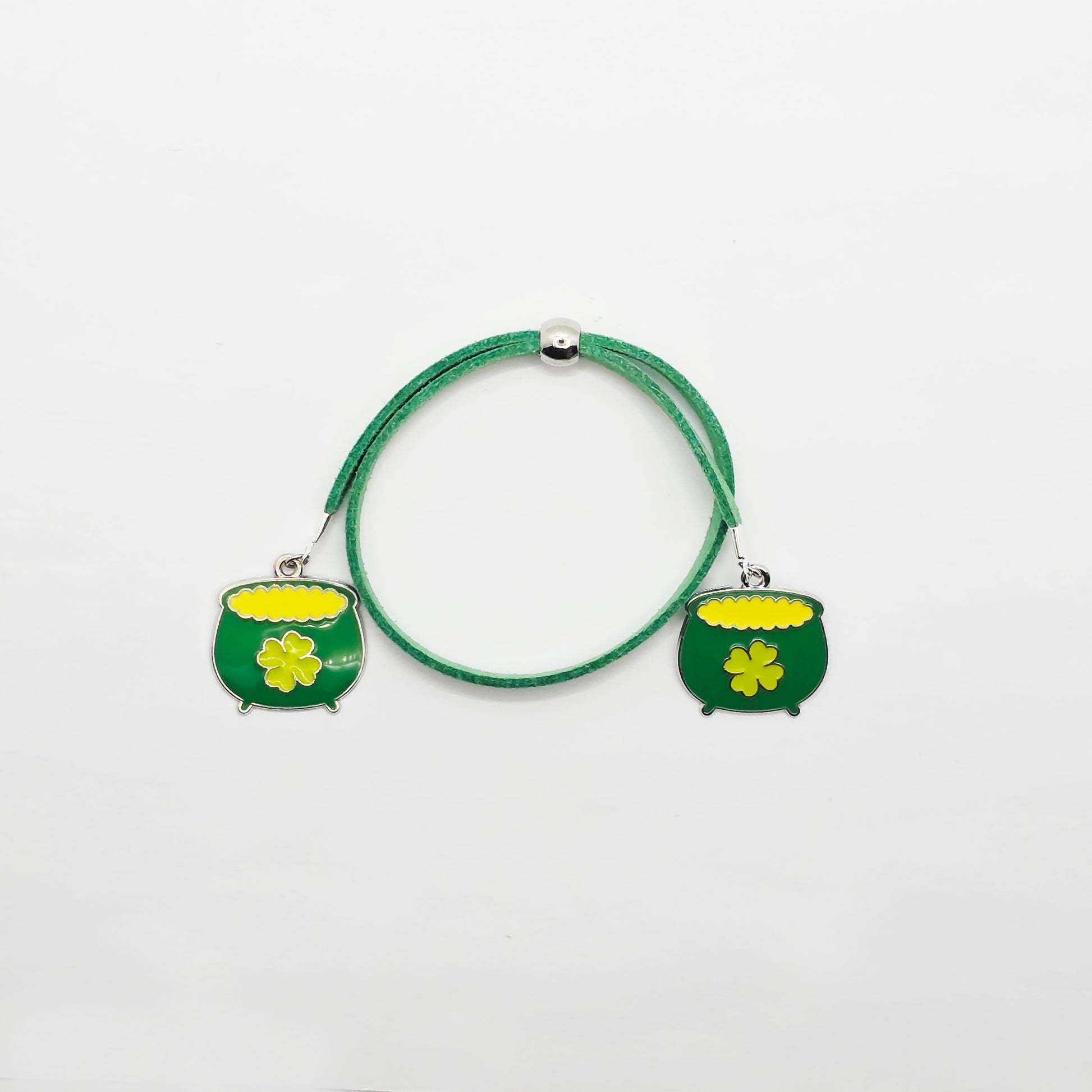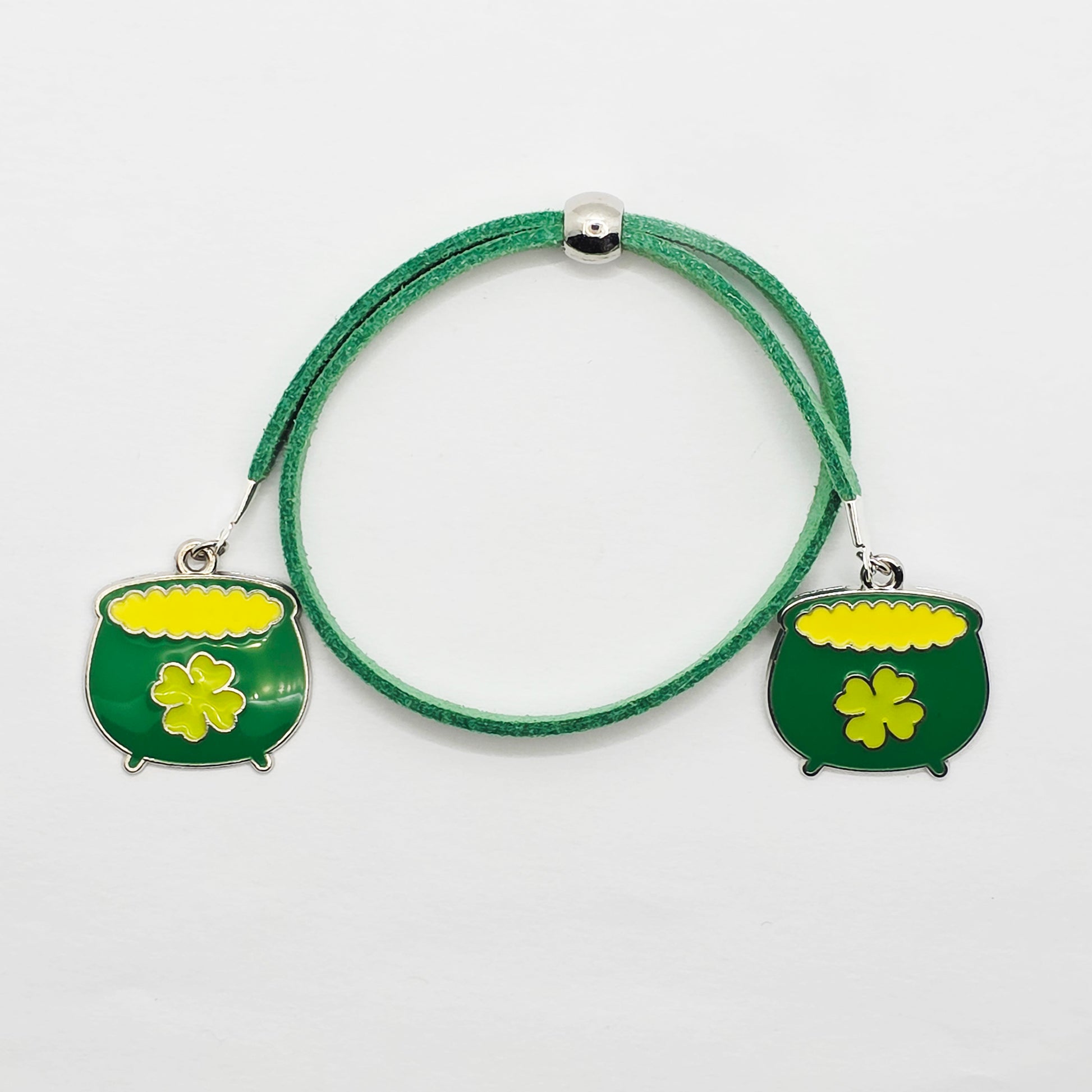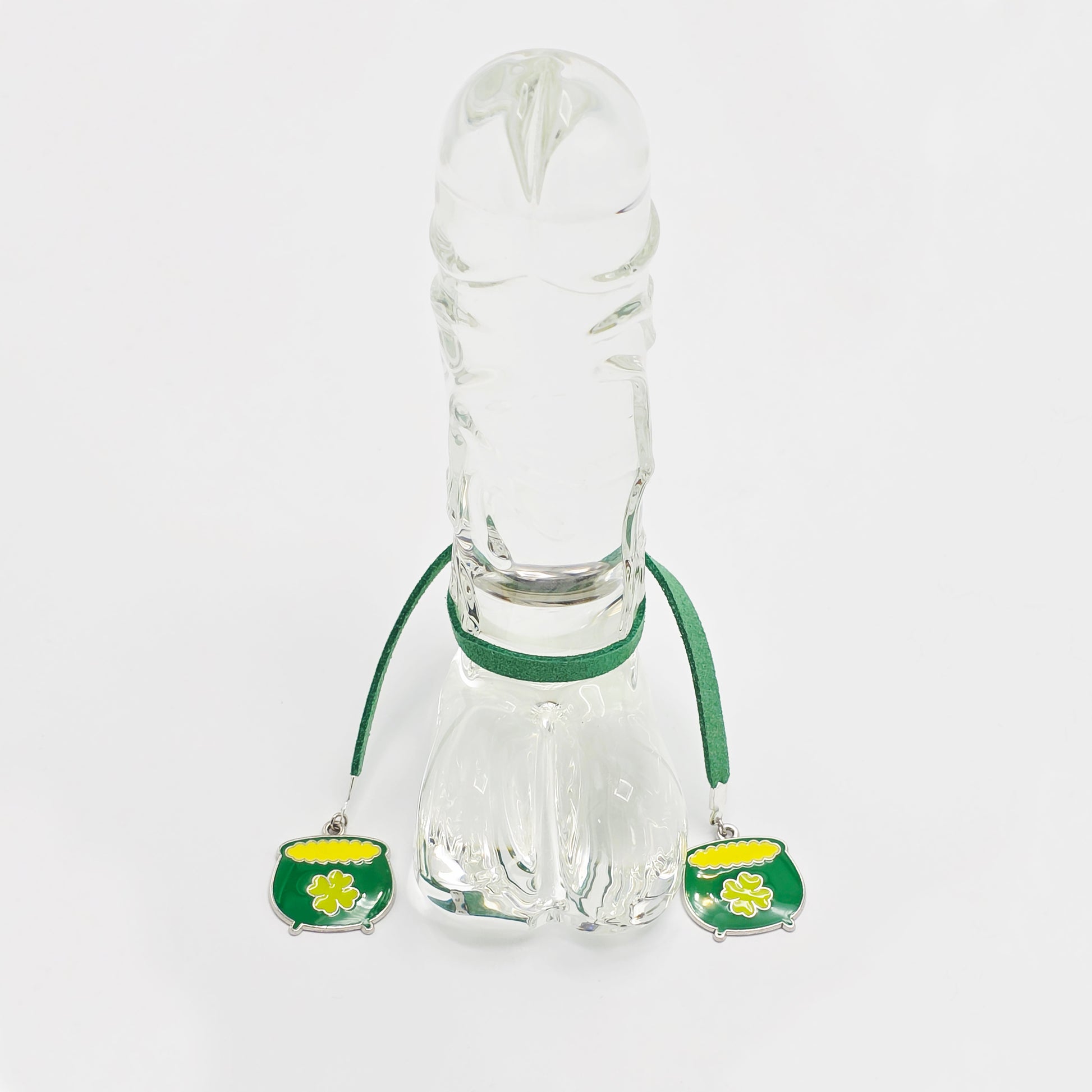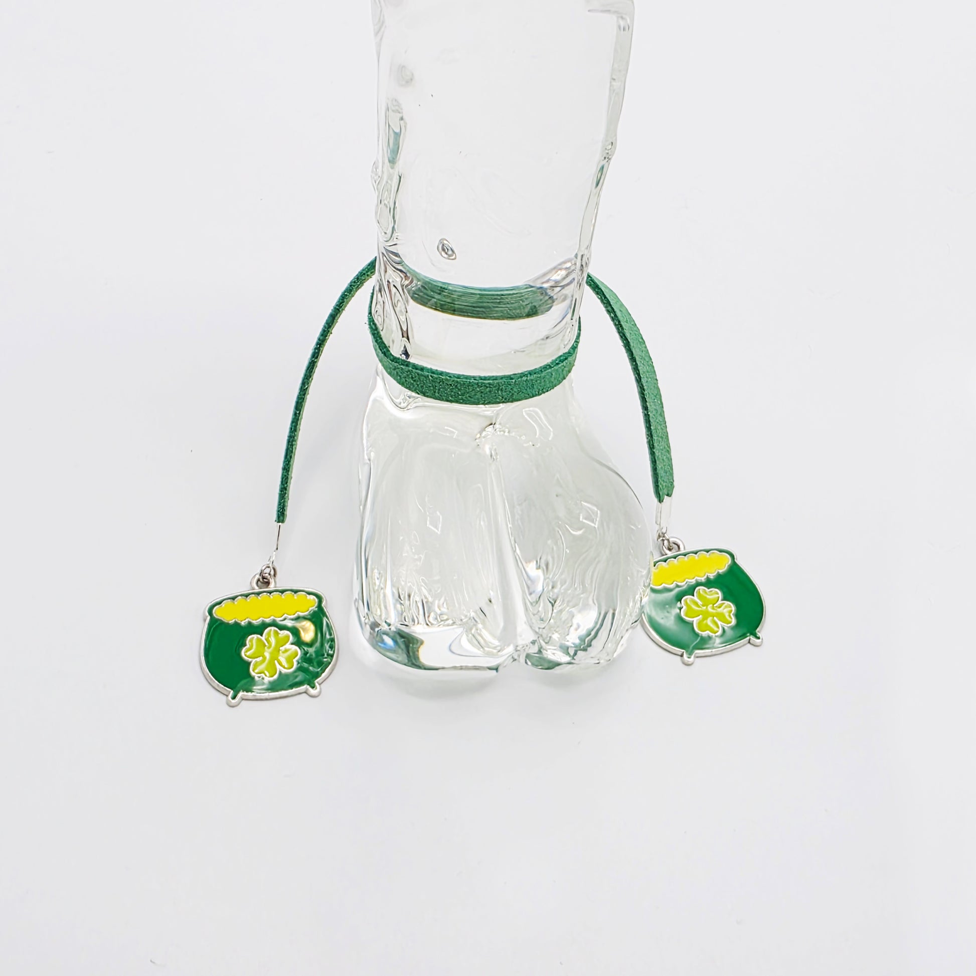 Where is your pot of gold for Saint Patrick's Day? Add some flare to your St Patty's wear! No measuring needed as this festive and fun penis noose is adjustable and fits most. Green faux suade penis noose bracelet with Shamrock Pot of Gold pendants.ย