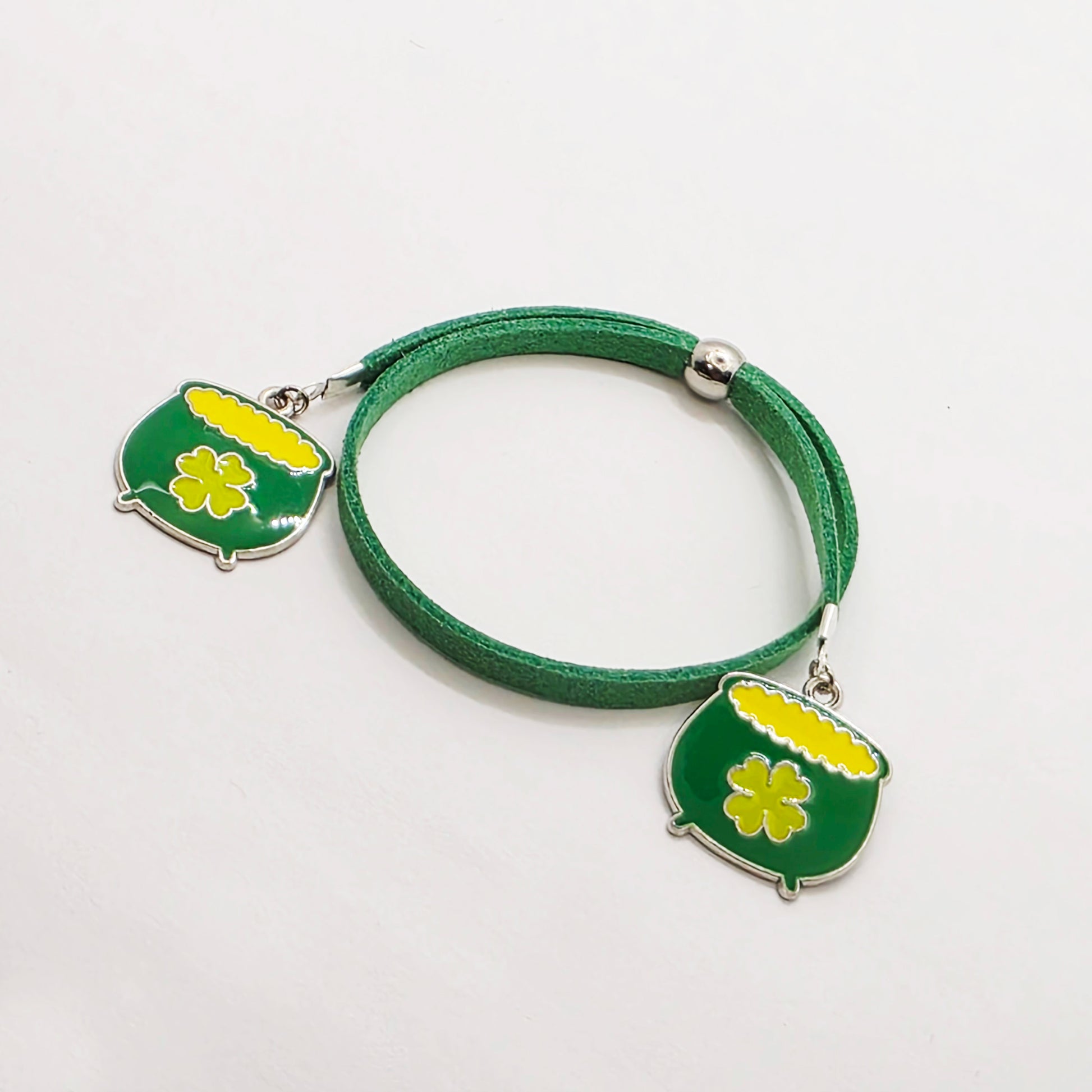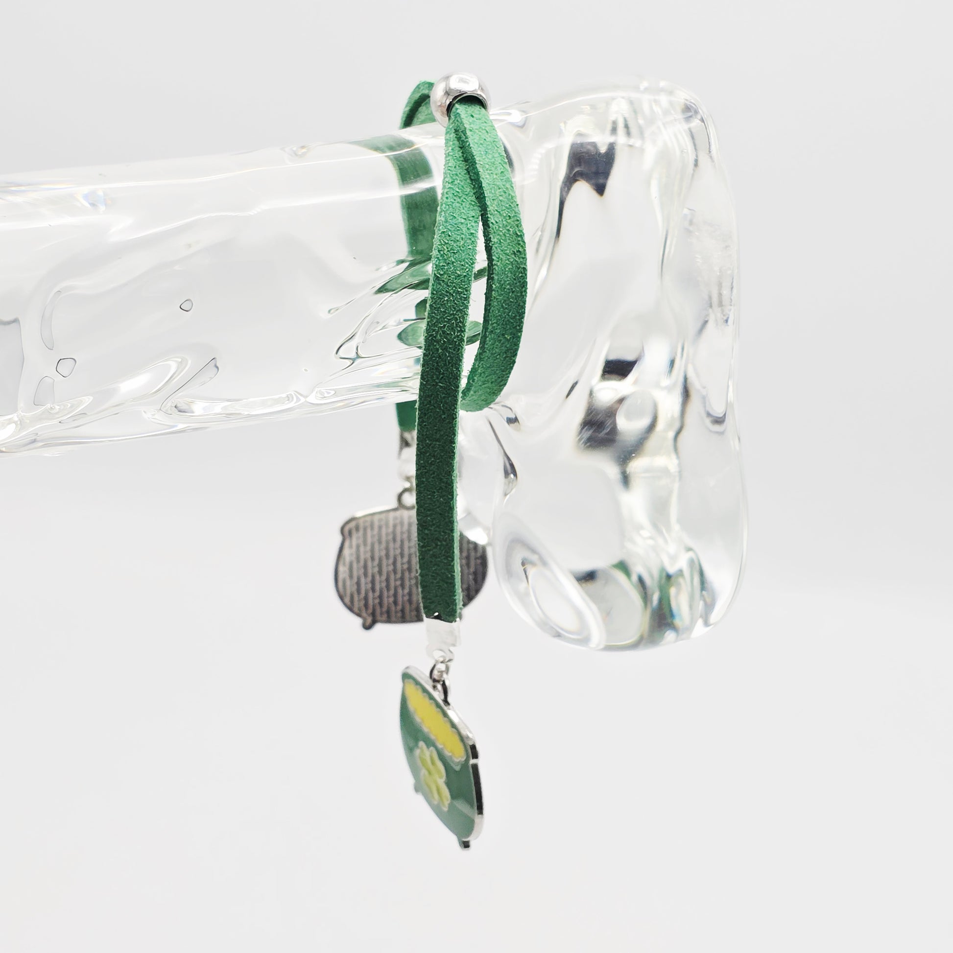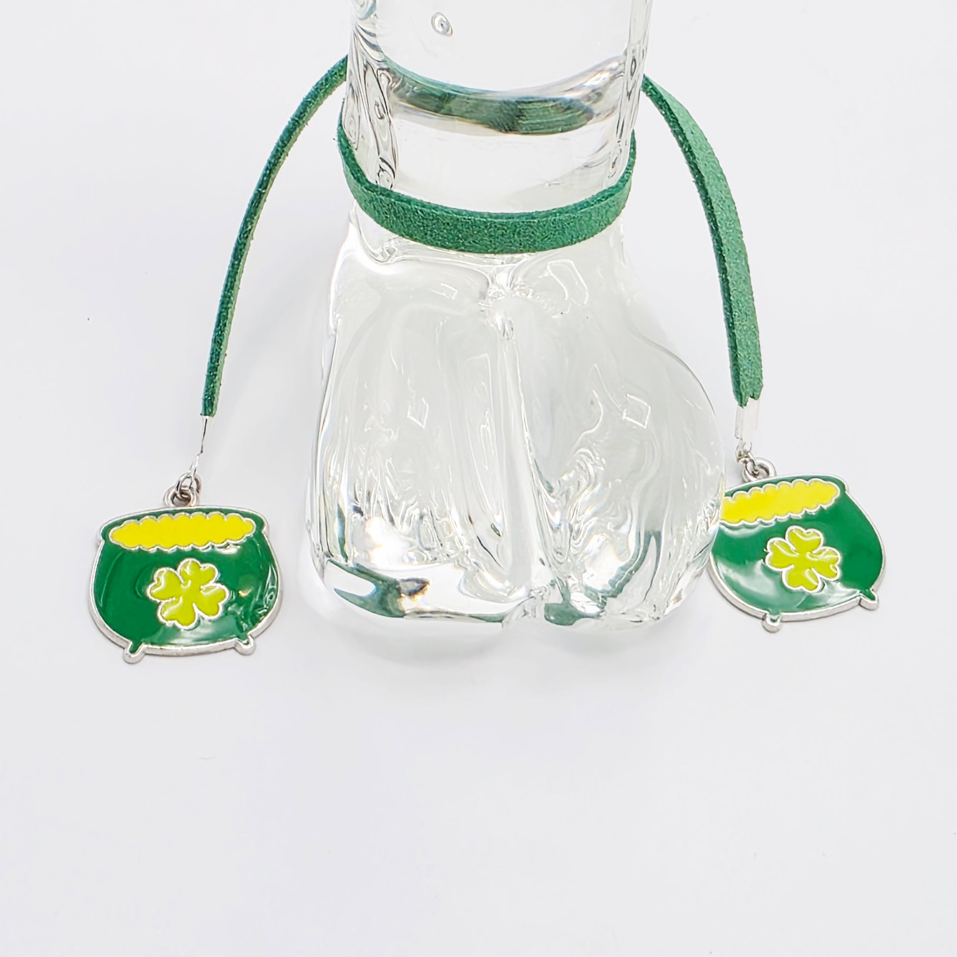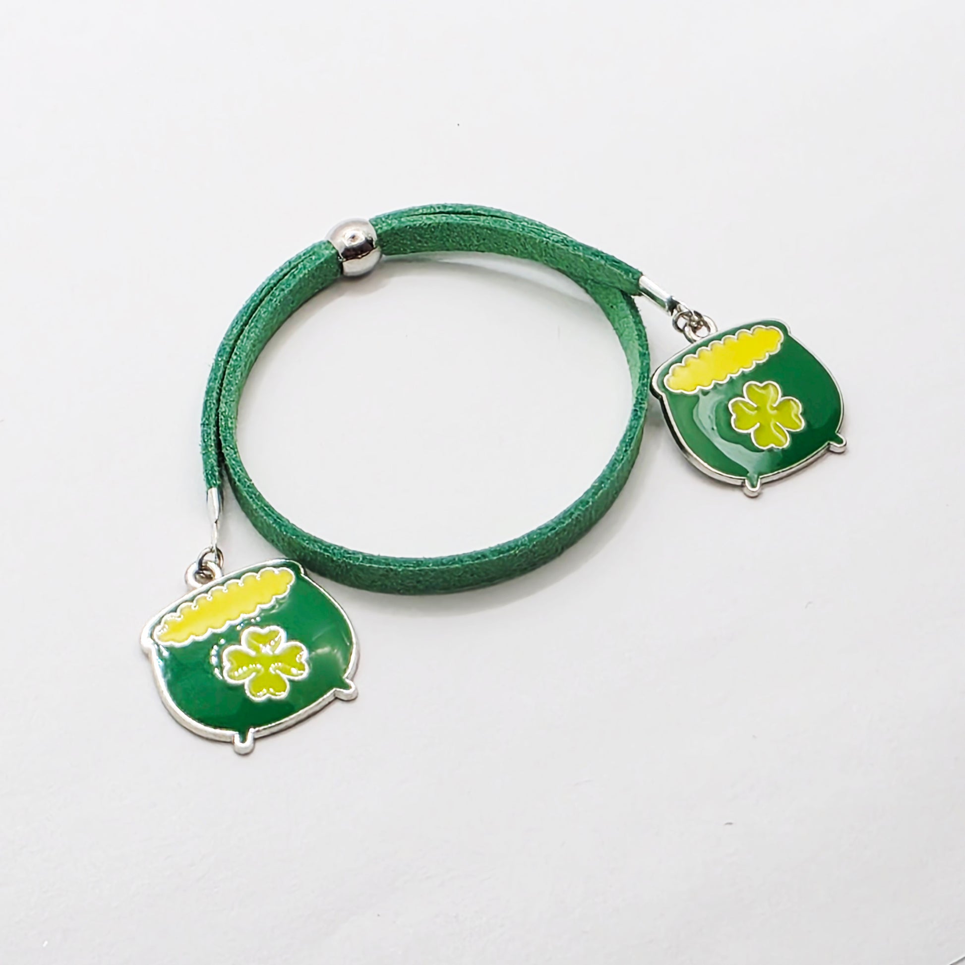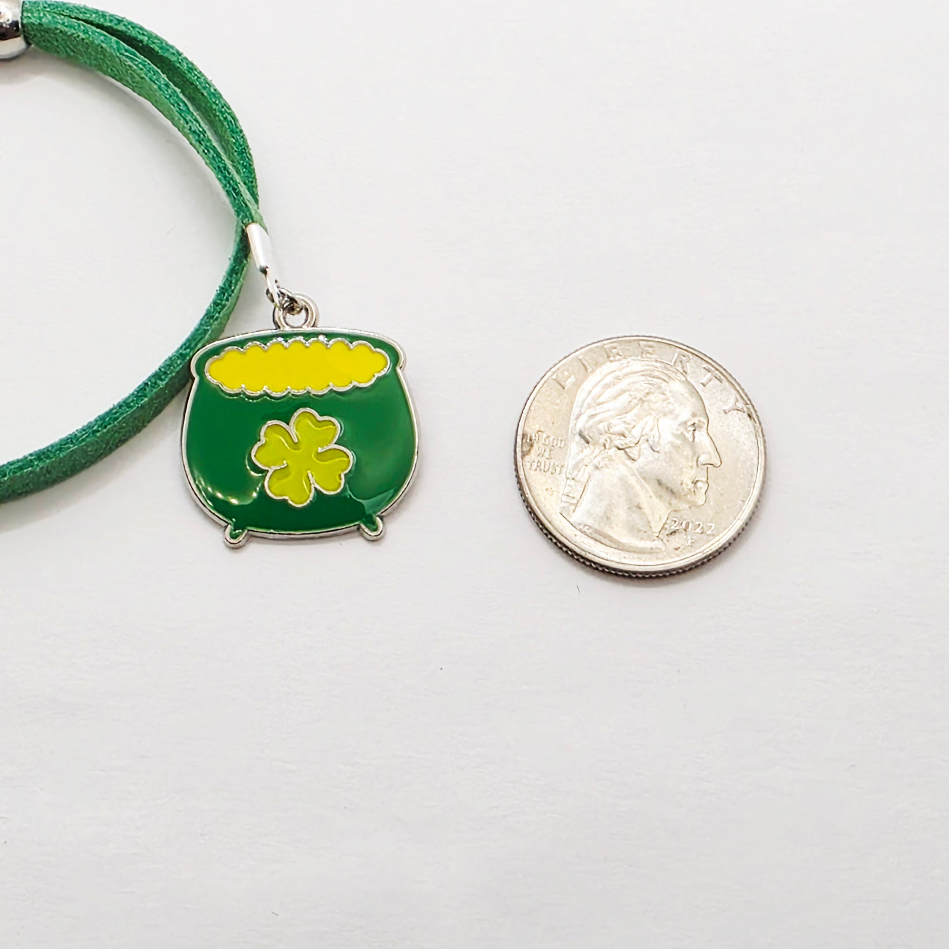 Where is your pot of gold for Saint Patrick's Day? Add some flare to your St Patty's wear! No measuring needed as this festive and fun penis noose is adjustable and fits most. Green faux suade penis noose bracelet with Shamrock Pot of Gold pendants.ย