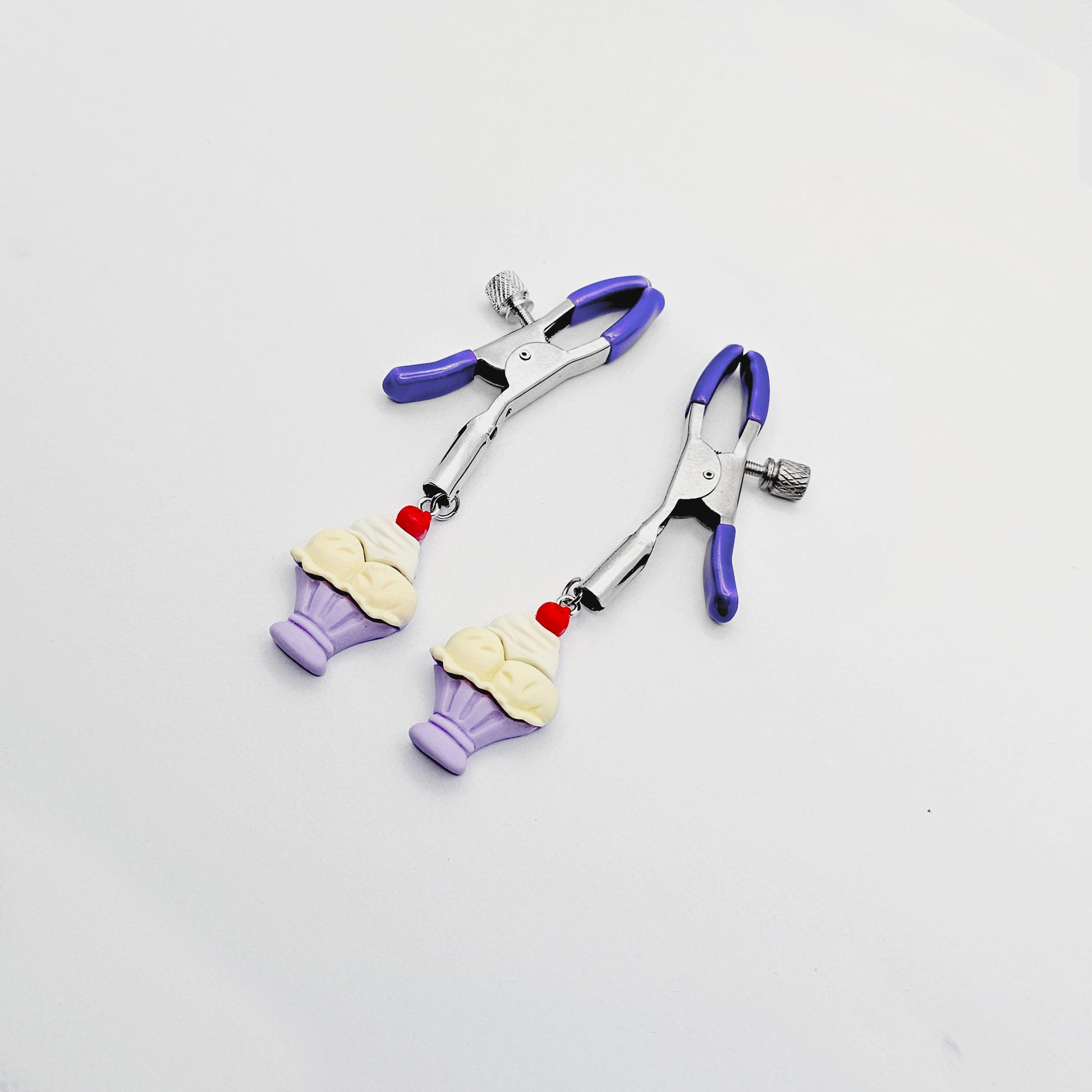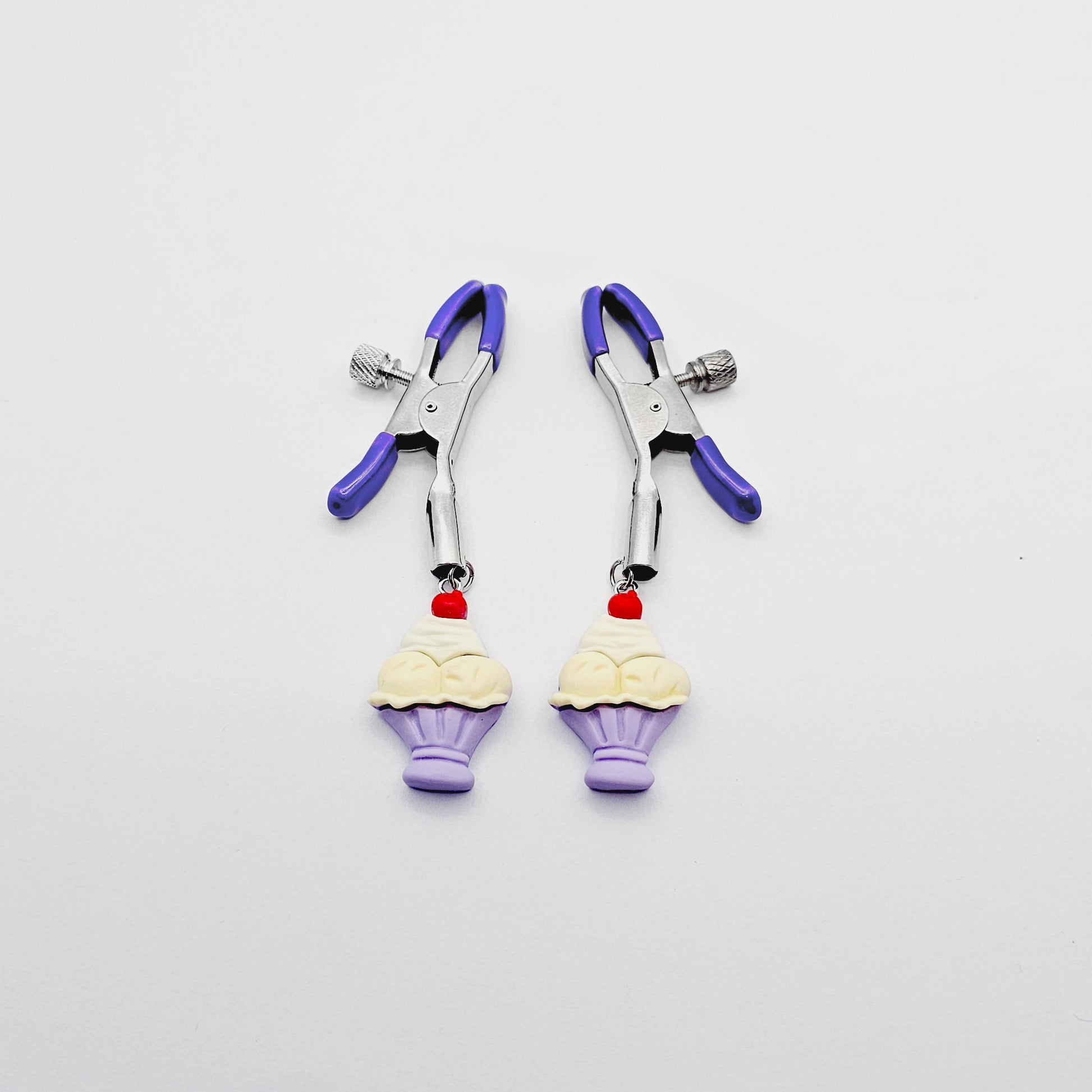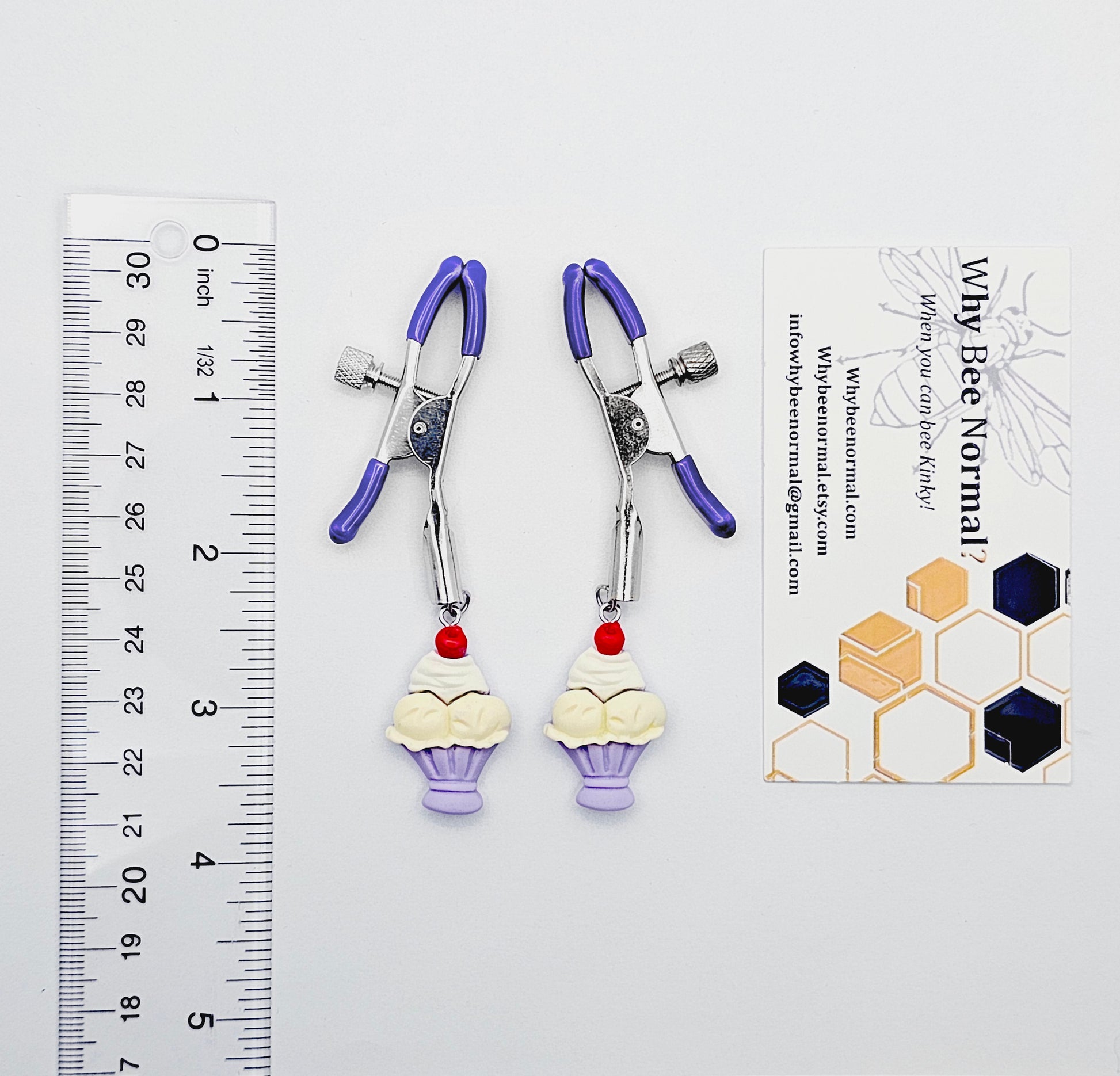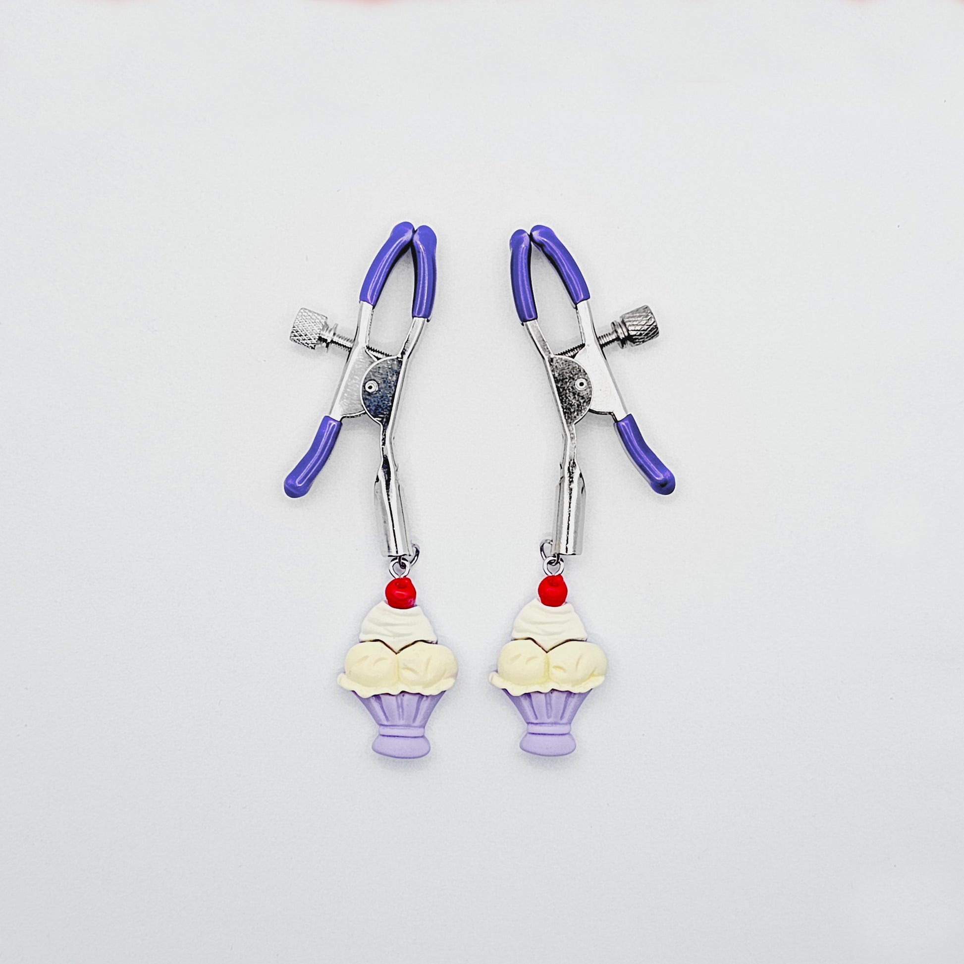 Purple Adjustable Nipple Clamps with Ice Cream Sundae for BDSM DDLG Summertime Fun!