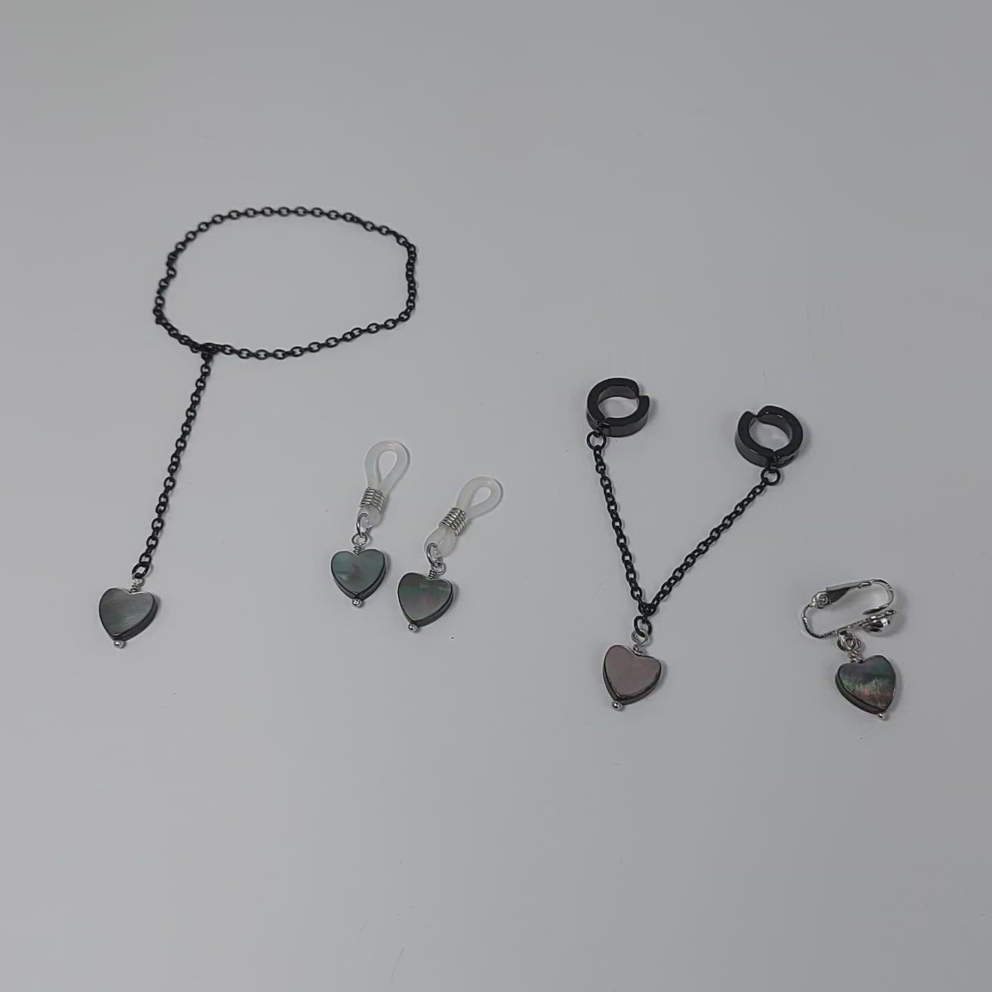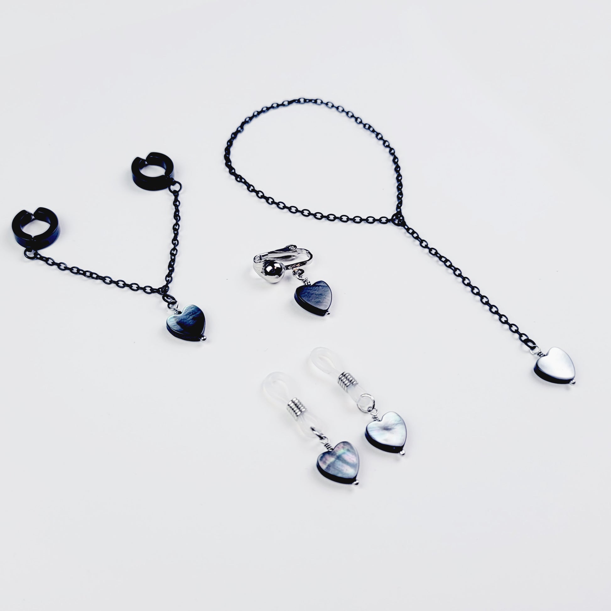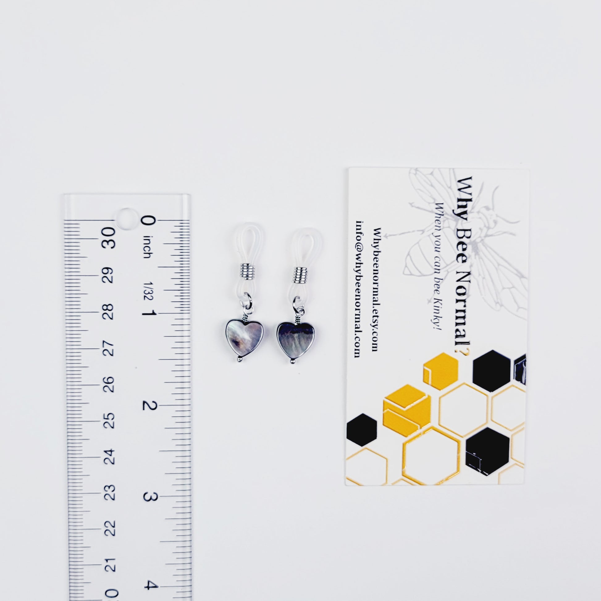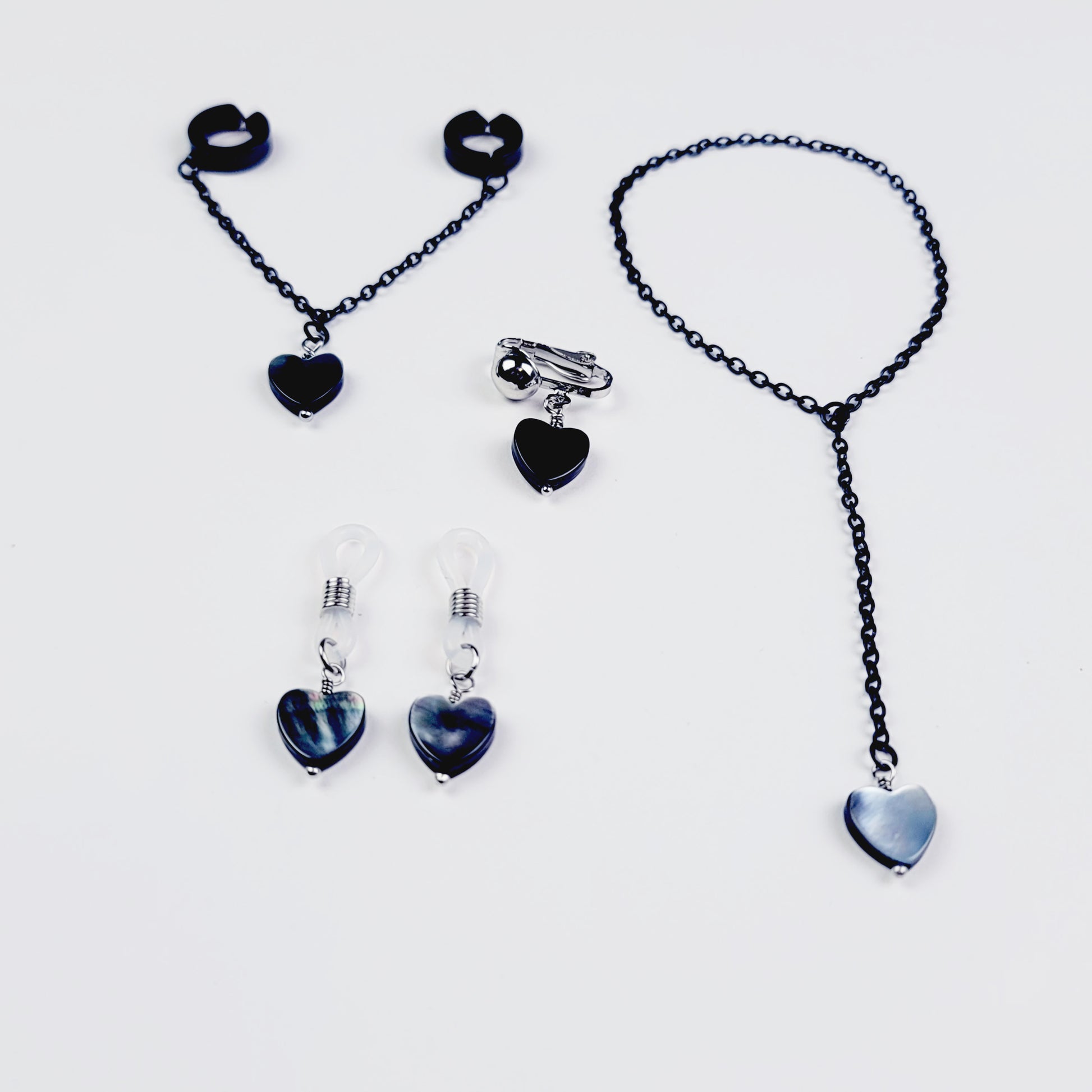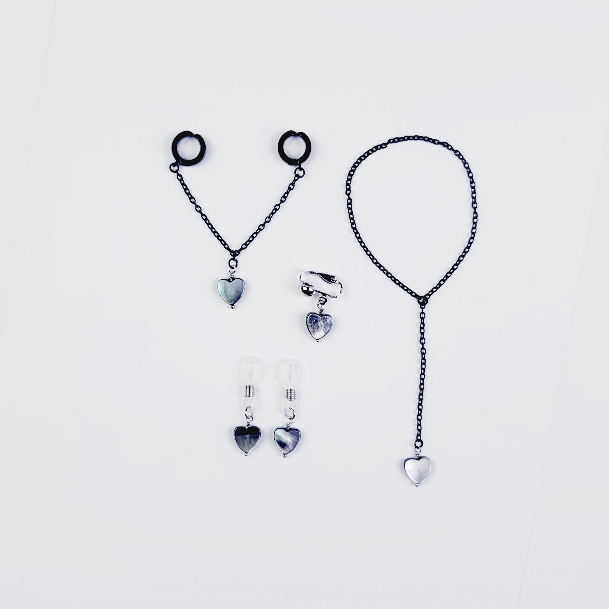 Shell Heart Intimate Jewelry Set for Couples, erotic non-piercing body jewelry for him and her. Penis Noose (one size fits most), VCH (Vaginal Clitoral Hood) Clip, Labia Chain Dangle, and Nipple Nooses (pair of two). *Please note that this style of nipple noose jewelry is NOT for flat, inverted, or large nipples.*