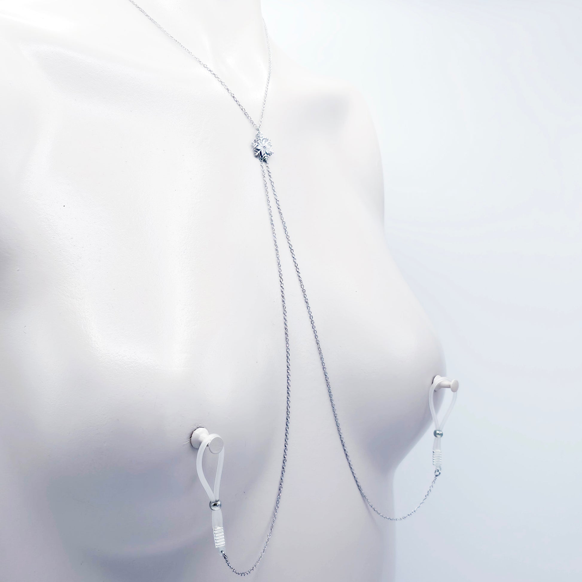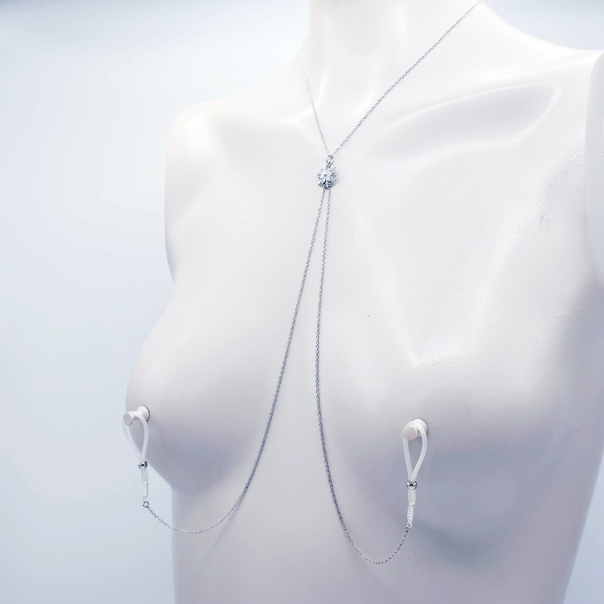 Platinum and Cubic Zirconia Snowflake Necklace to Nipple with Your Choice of Nipple Attachment. Choose 16, 18, 20, or 22-inch stainless steel necklace with non-piercing nipple nooses, horseshoe nipple rings (non-piercing), o-rings (for use with your piercing jewelry), Or if you choose to "feel the sting" with nipple clamps, we have several options to choose from. 🐝 Adjustable, Tweezer, Alligator, C Clamps, and Clover Clamps available.