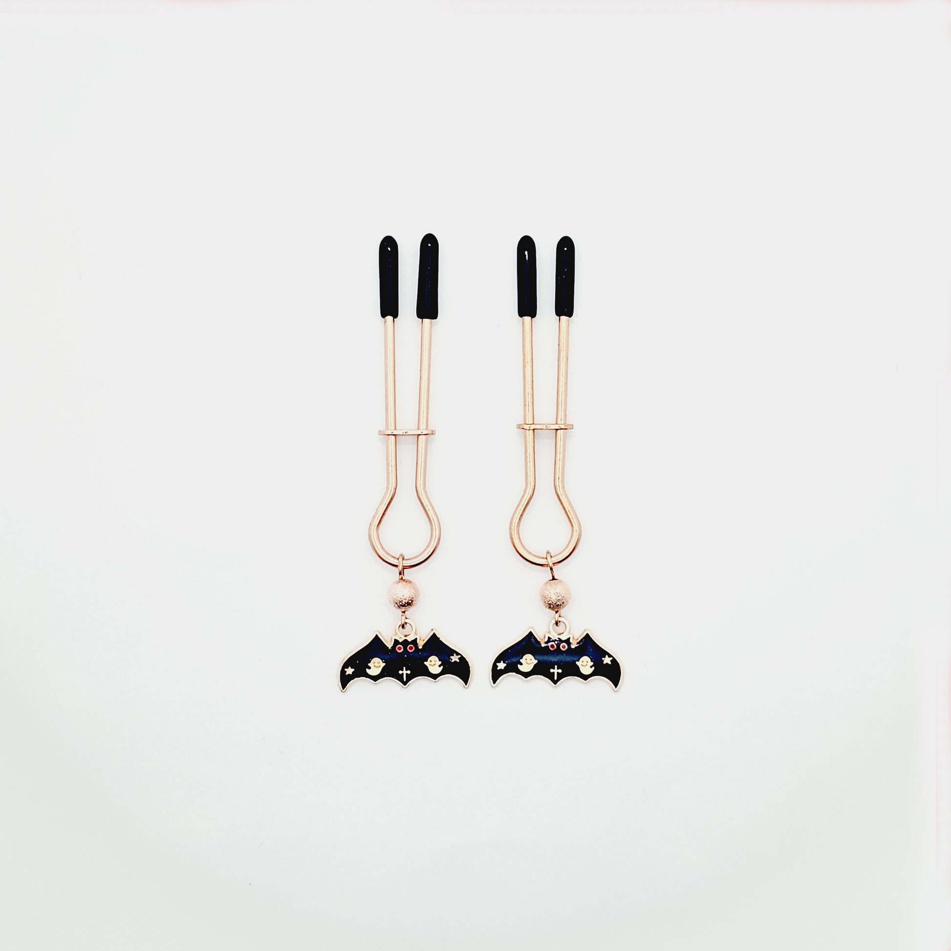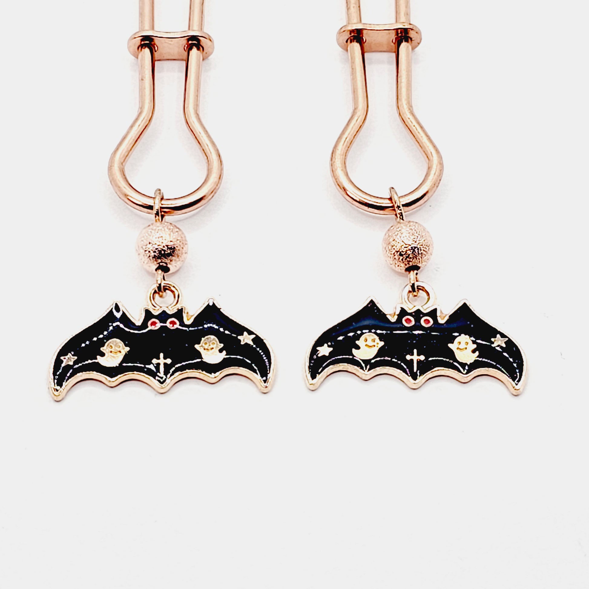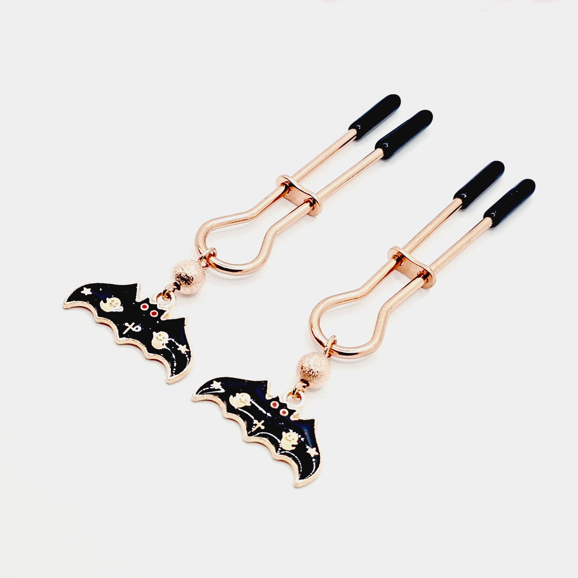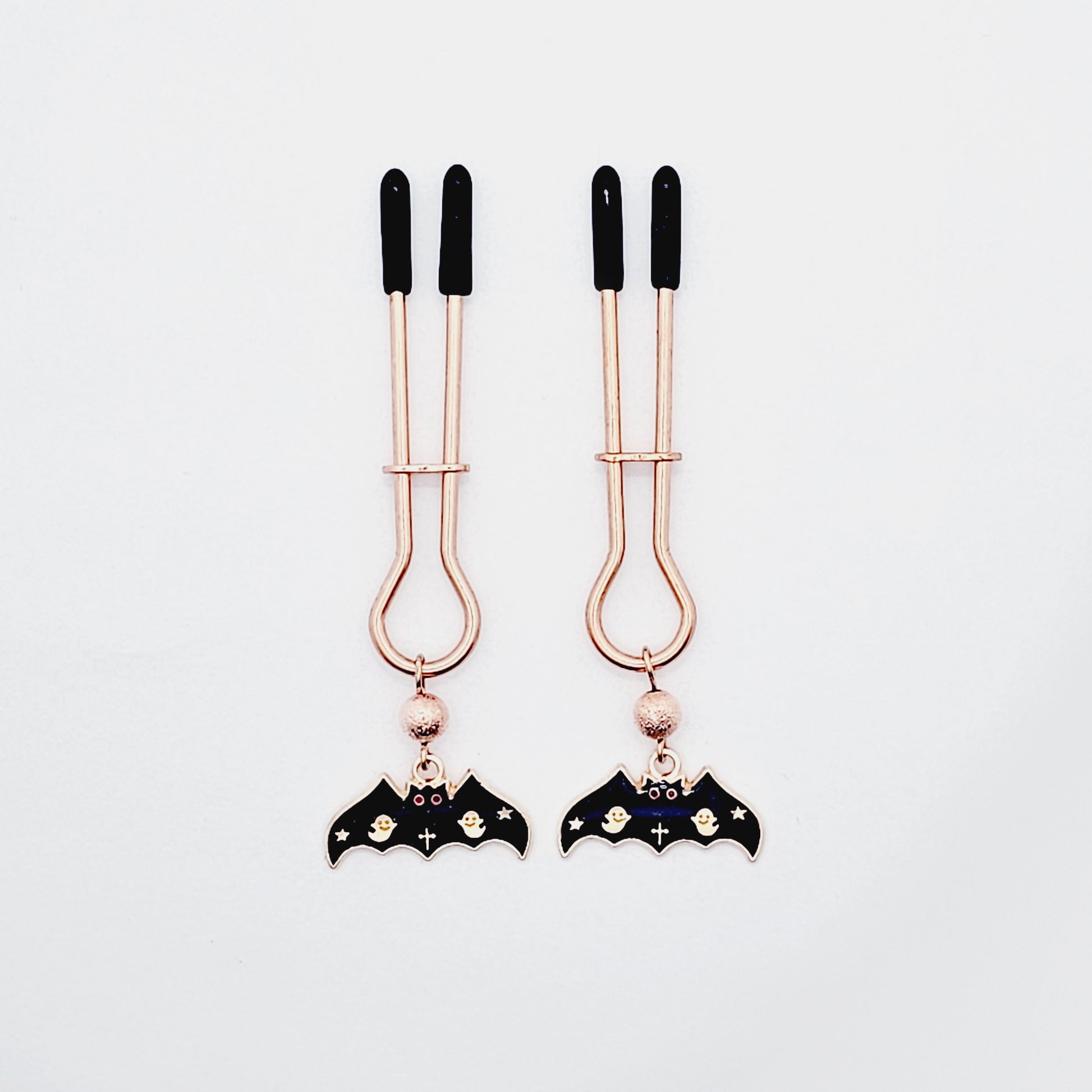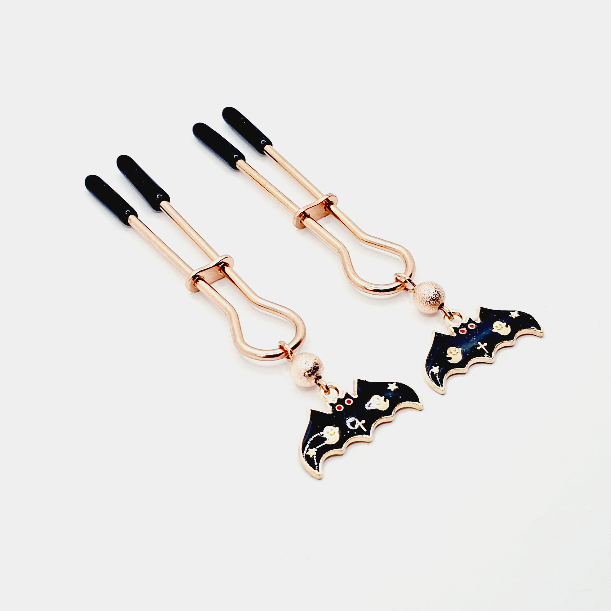 Spooky Nipple Clamps for Halloween. Rose Gold Straight Tweezer Clamps with Bats.