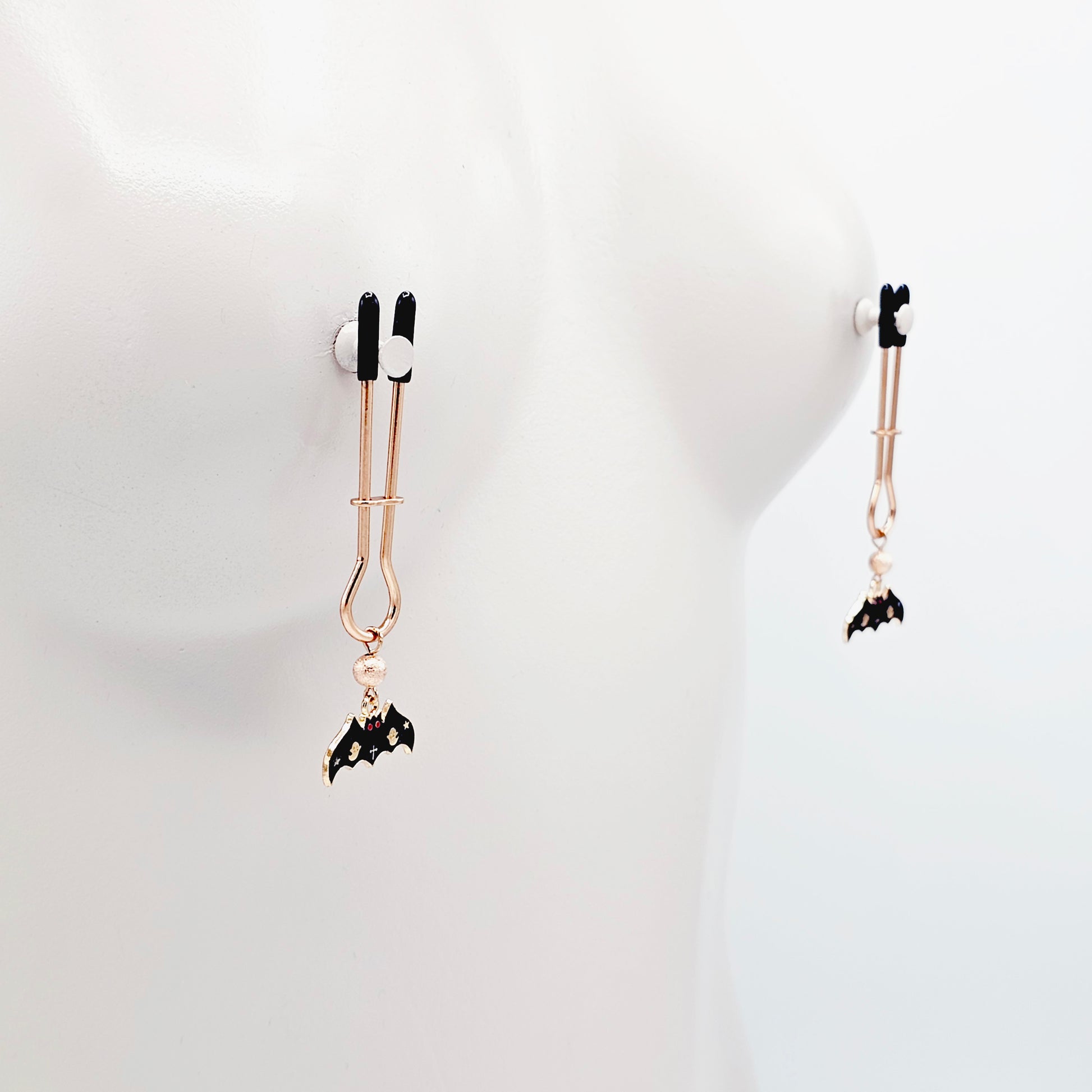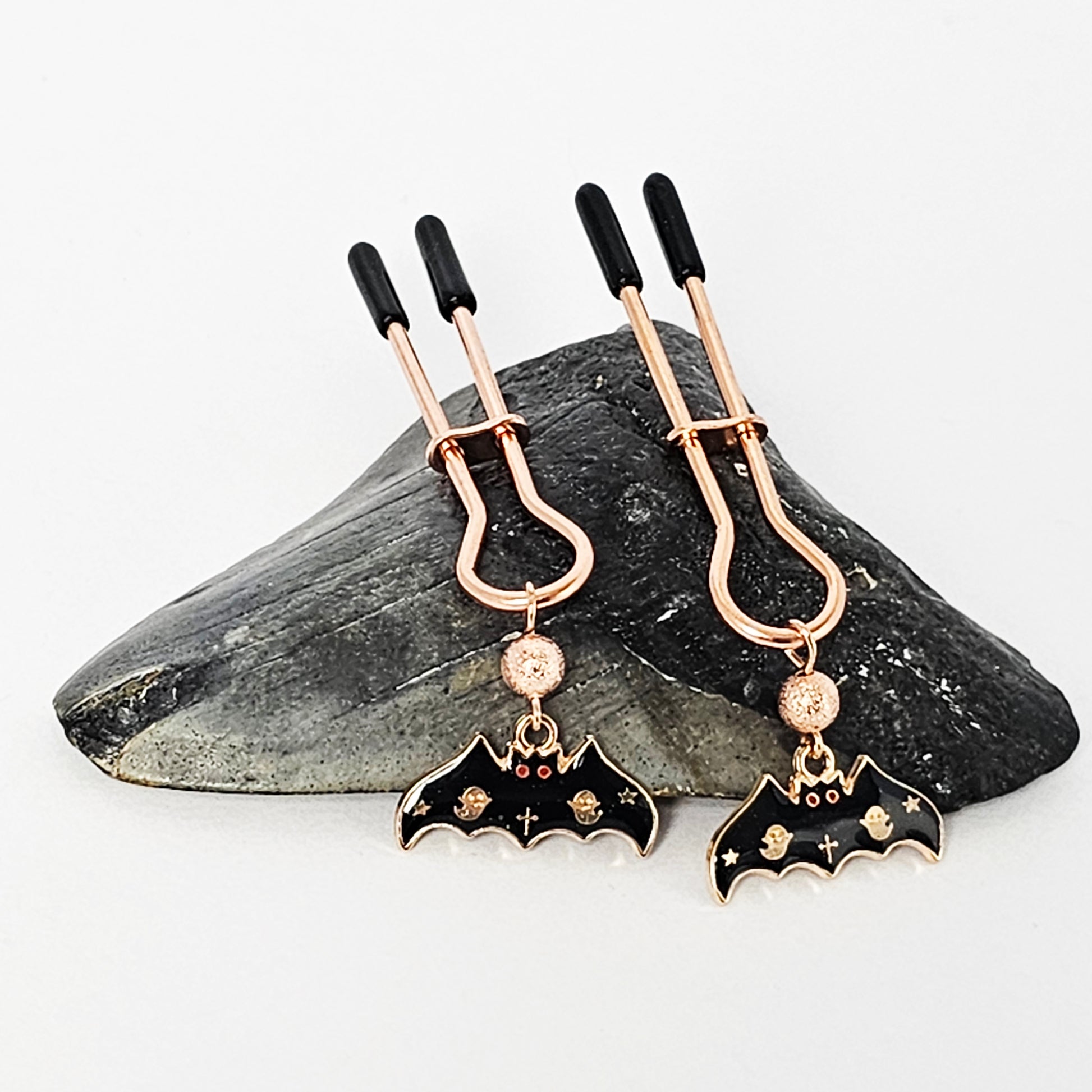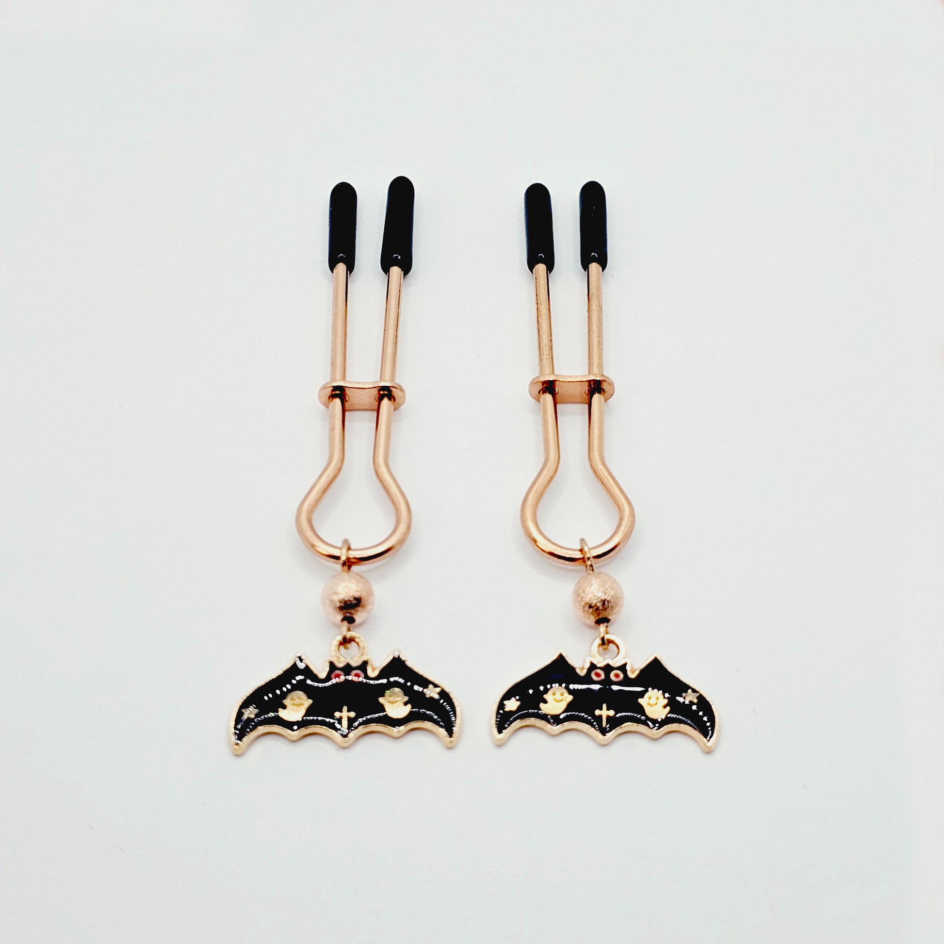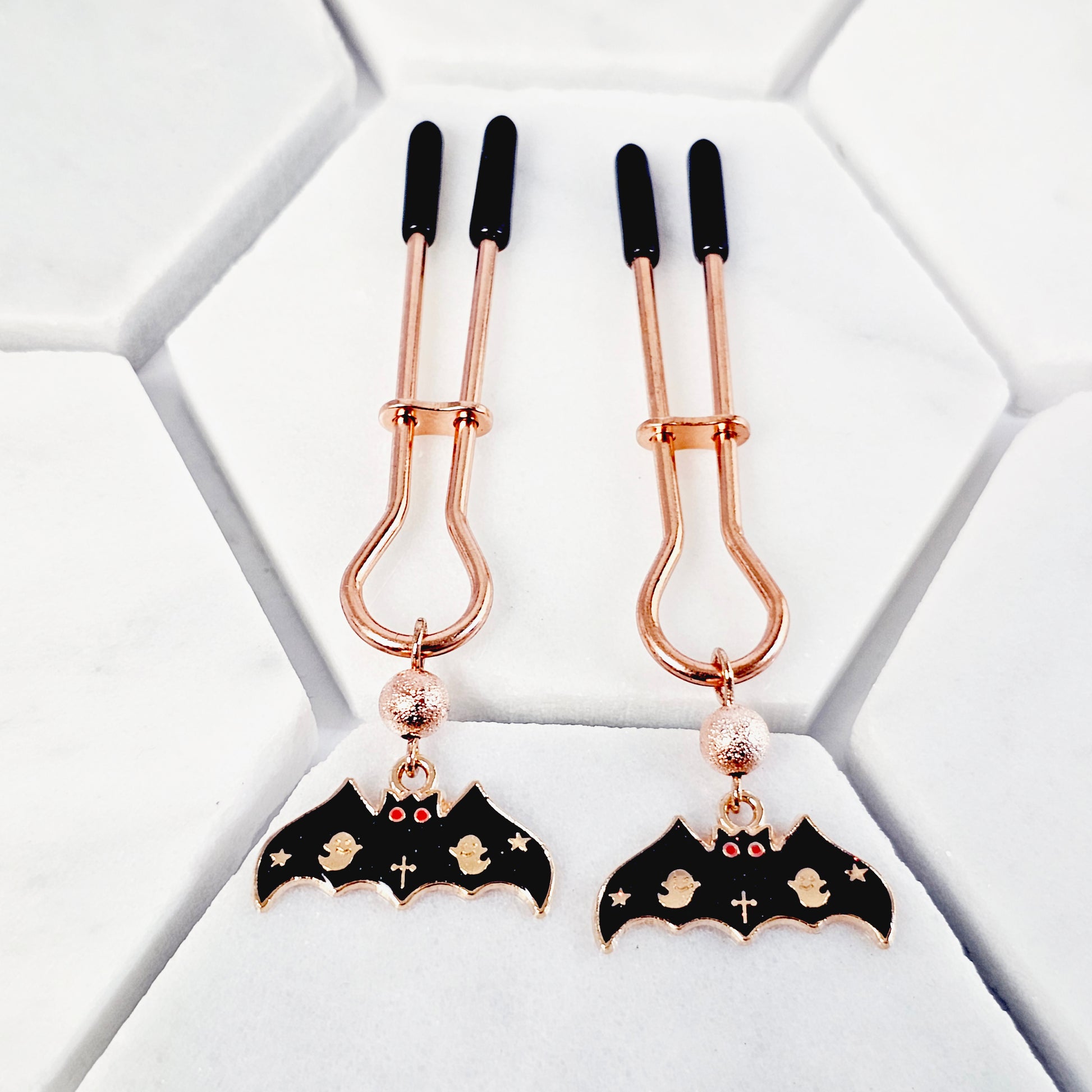 Spooky Nipple Clamps for Halloween. Rose Gold Straight Tweezer Clamps with Bats.