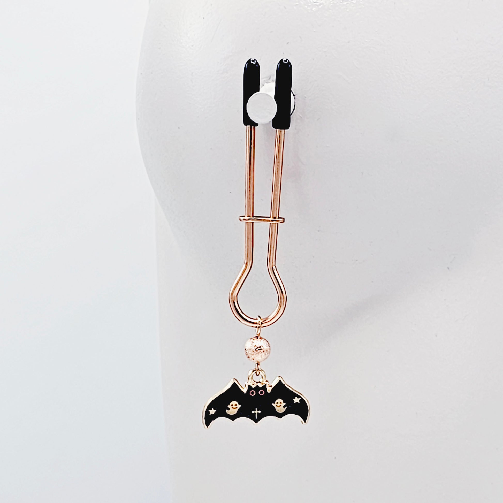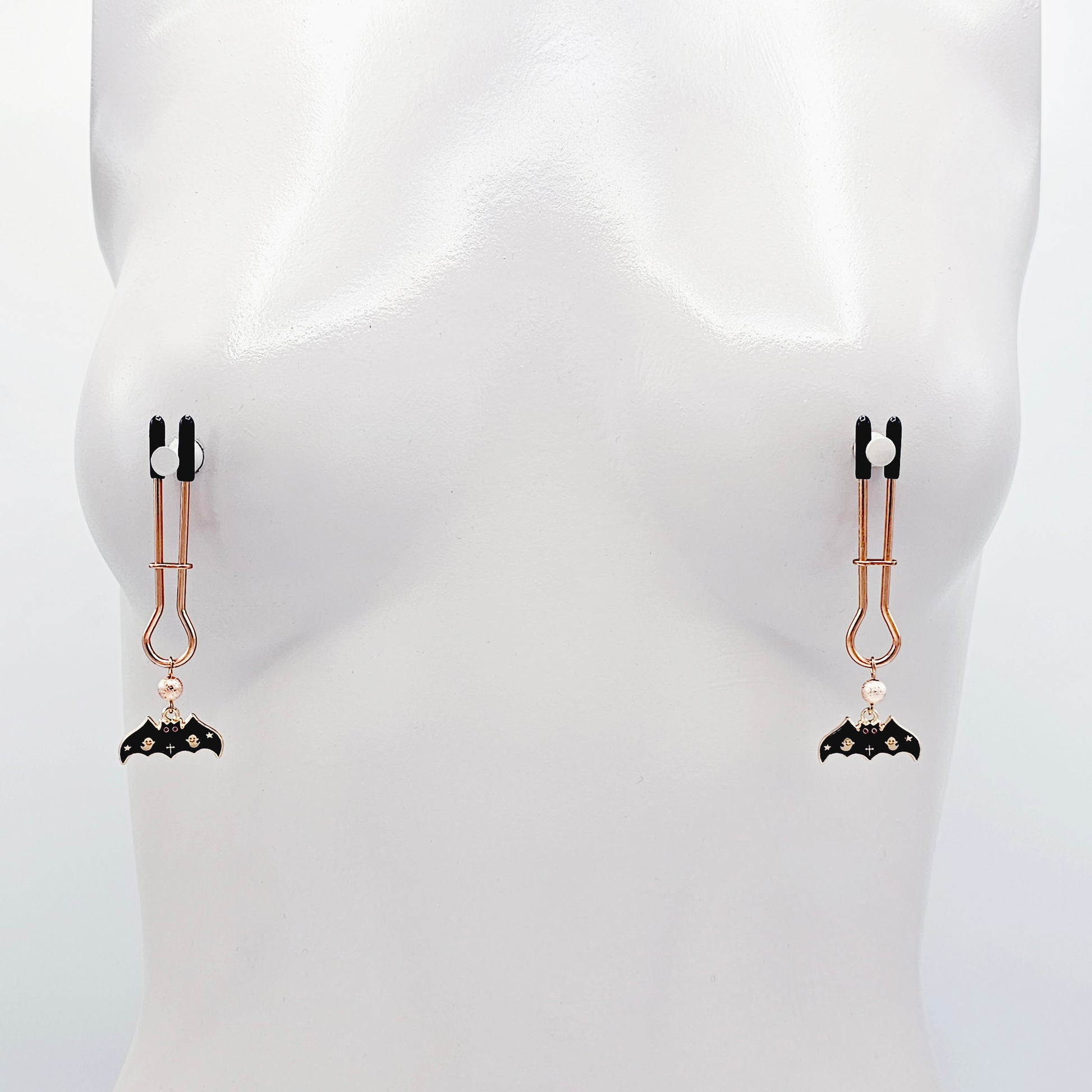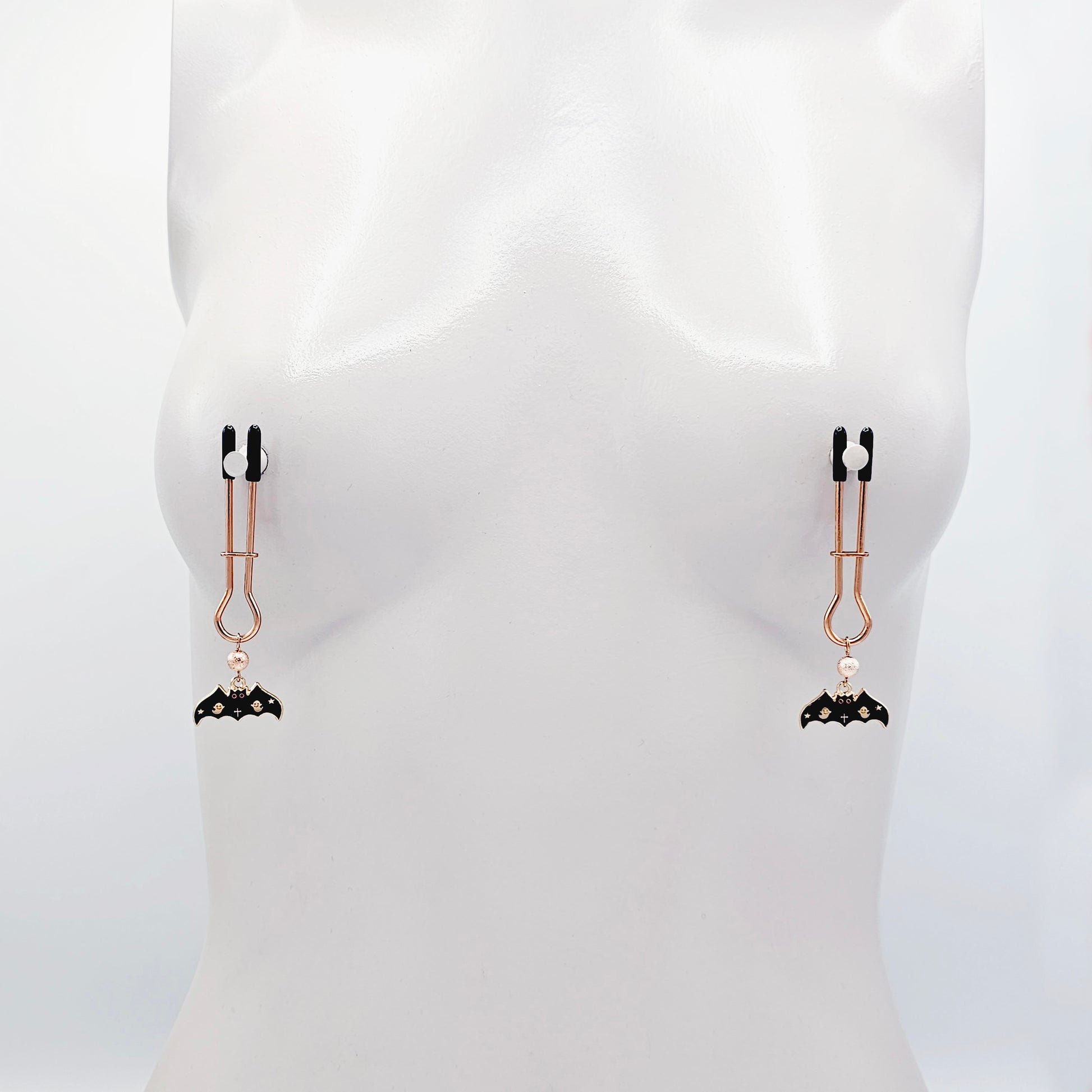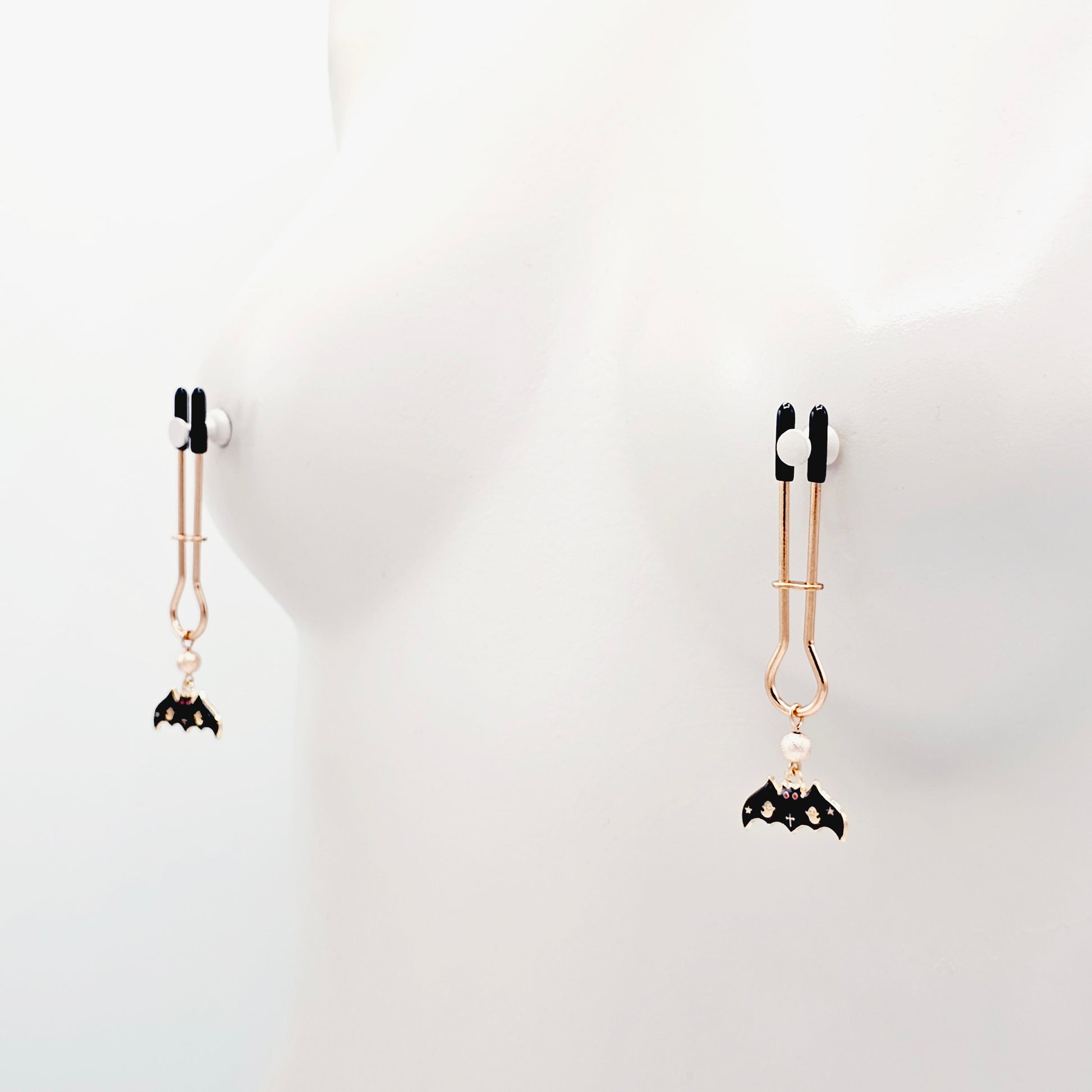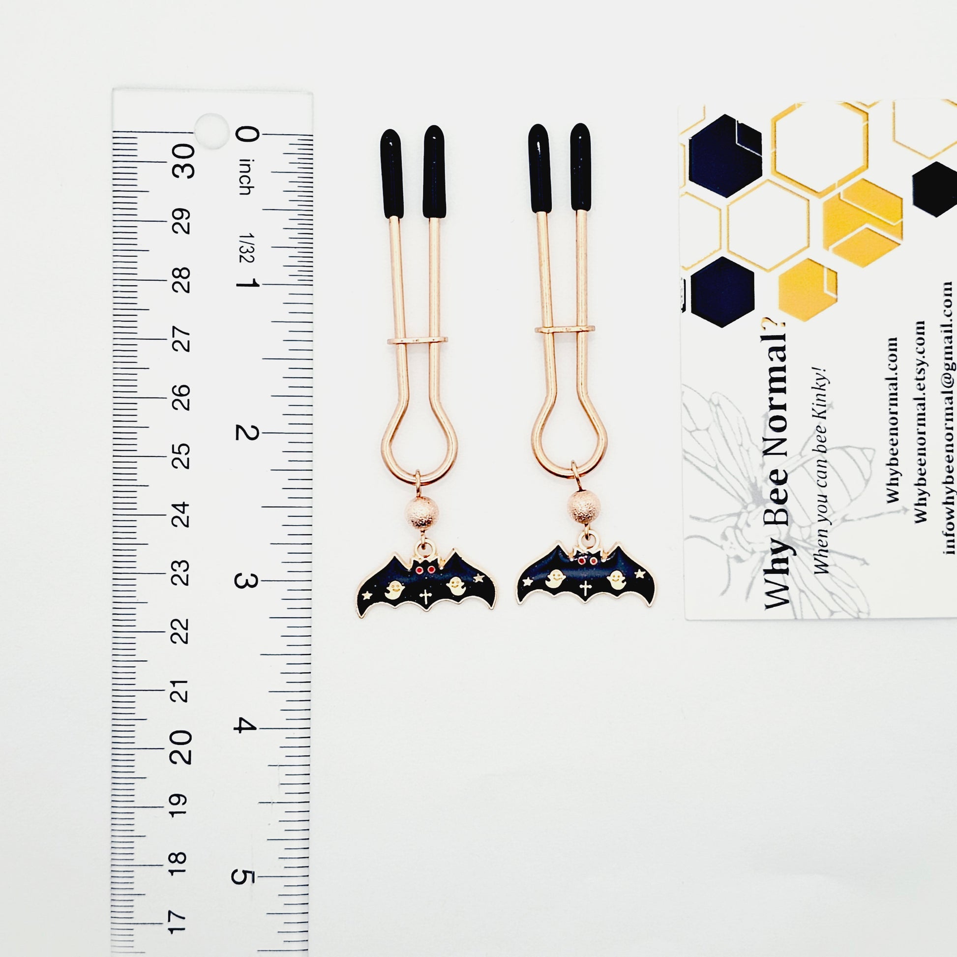 Spooky Nipple Clamps for Halloween. Rose Gold Straight Tweezer Clamps with Bats.