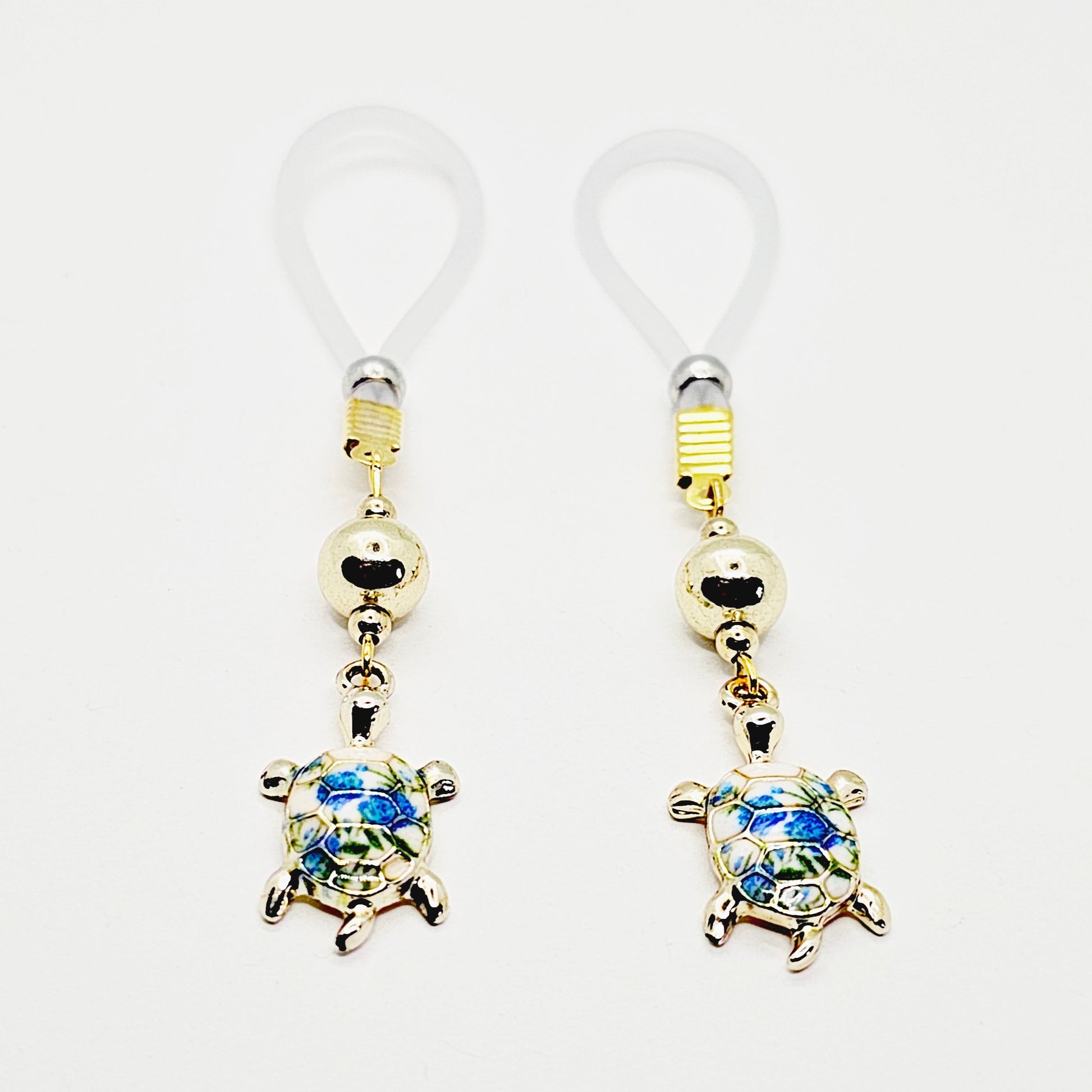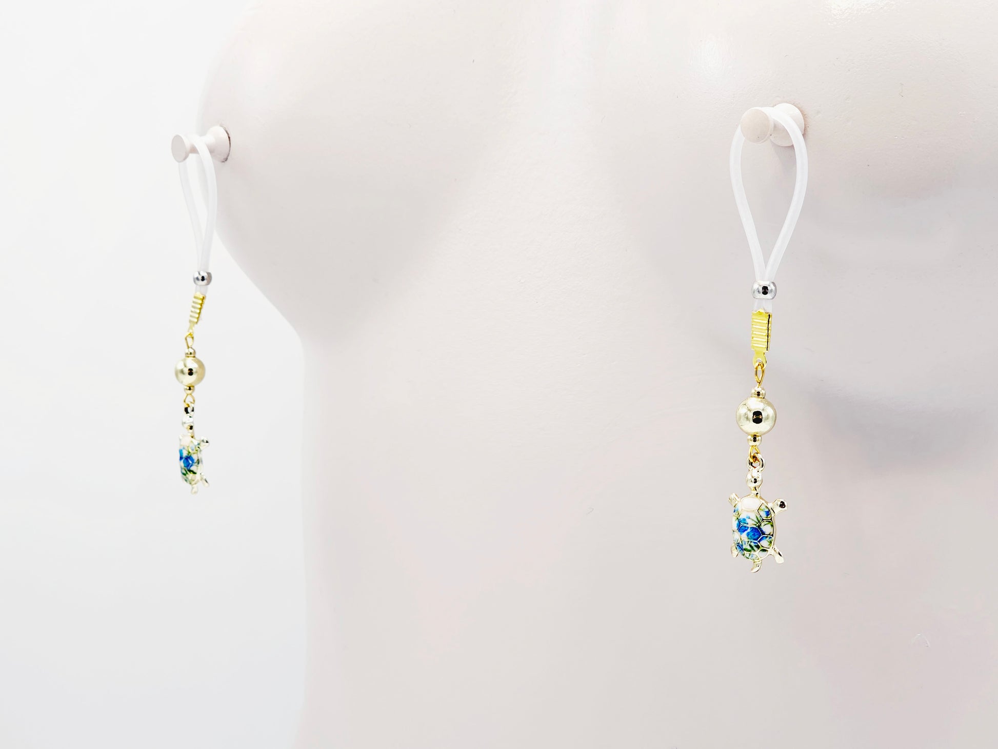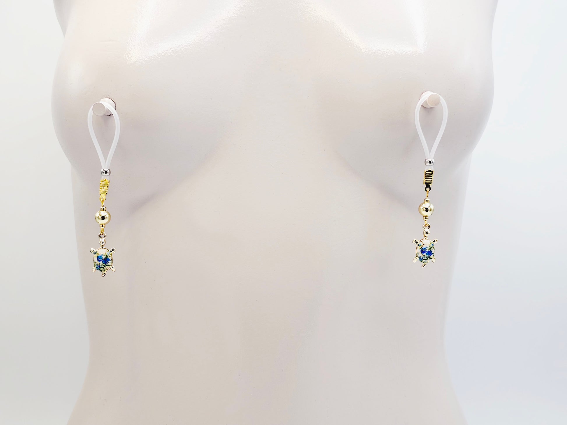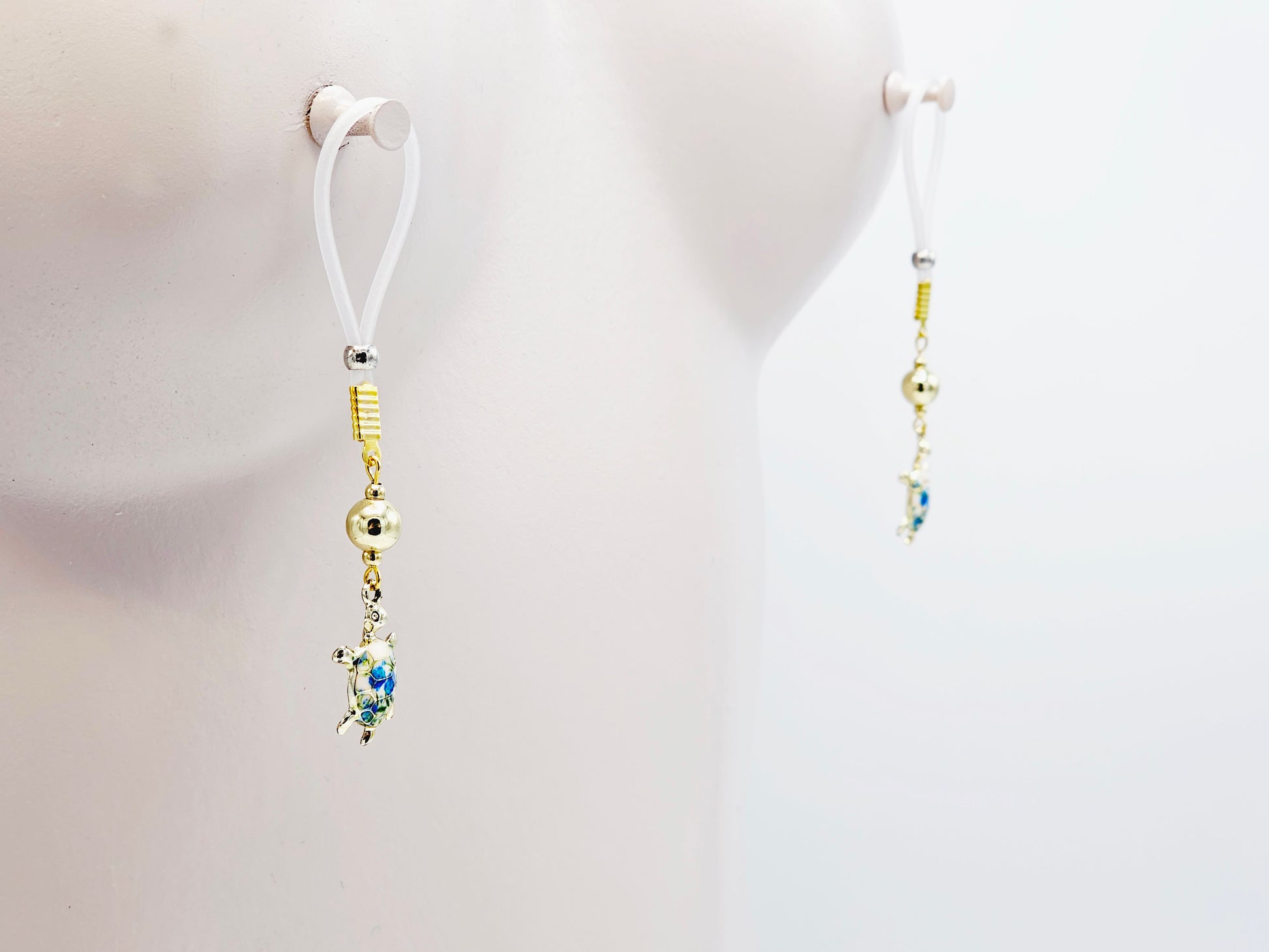 Nautical Non-Piercing Nipple Jewelry or Nipple Clamps! Pretty Painted Gold Sea Turtle Nipple Dangles, Blue or Pink, on Nipple Nooses (as shown) Or if you choose to "๐๐๐๐ ๐๐๐ ๐๐๐๐๐" with nipple clamps, we have several options to choose from. ๐ Adjustable, Tweezer, Alligator, C Clamps, and Clover Clamps available.
