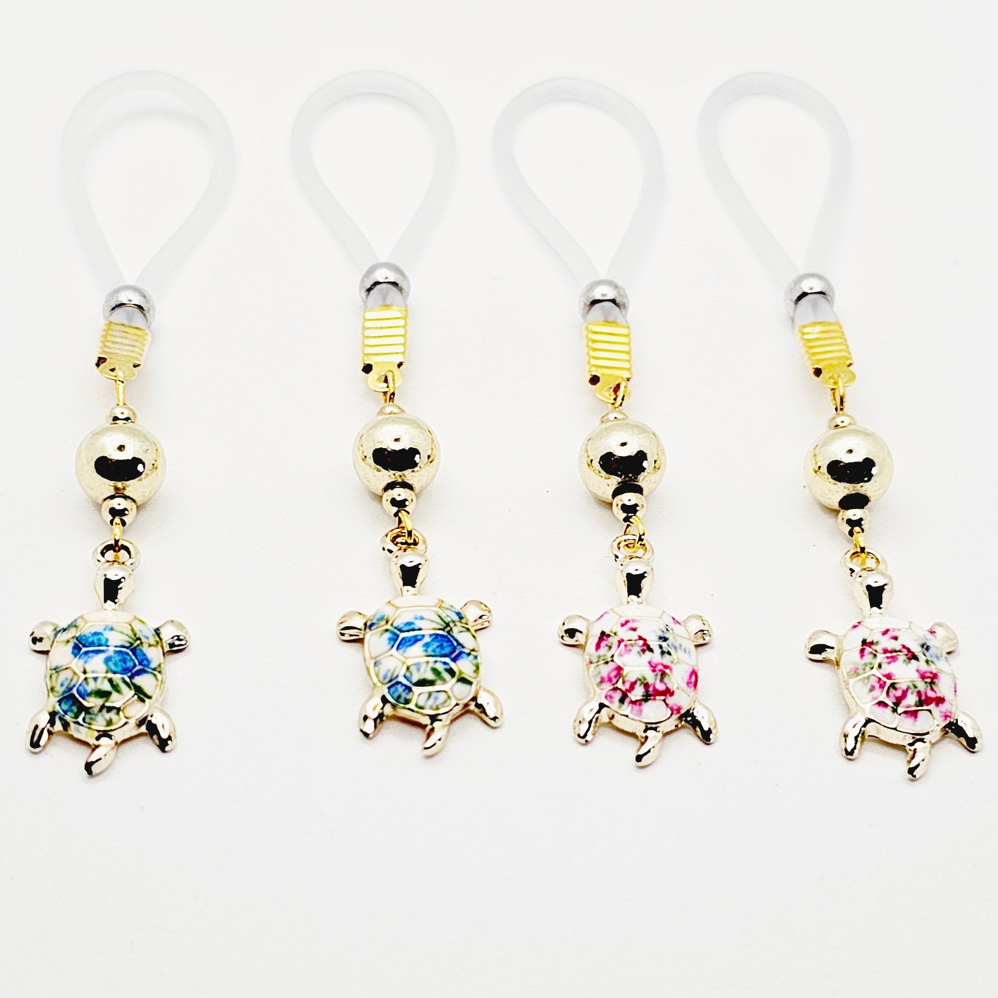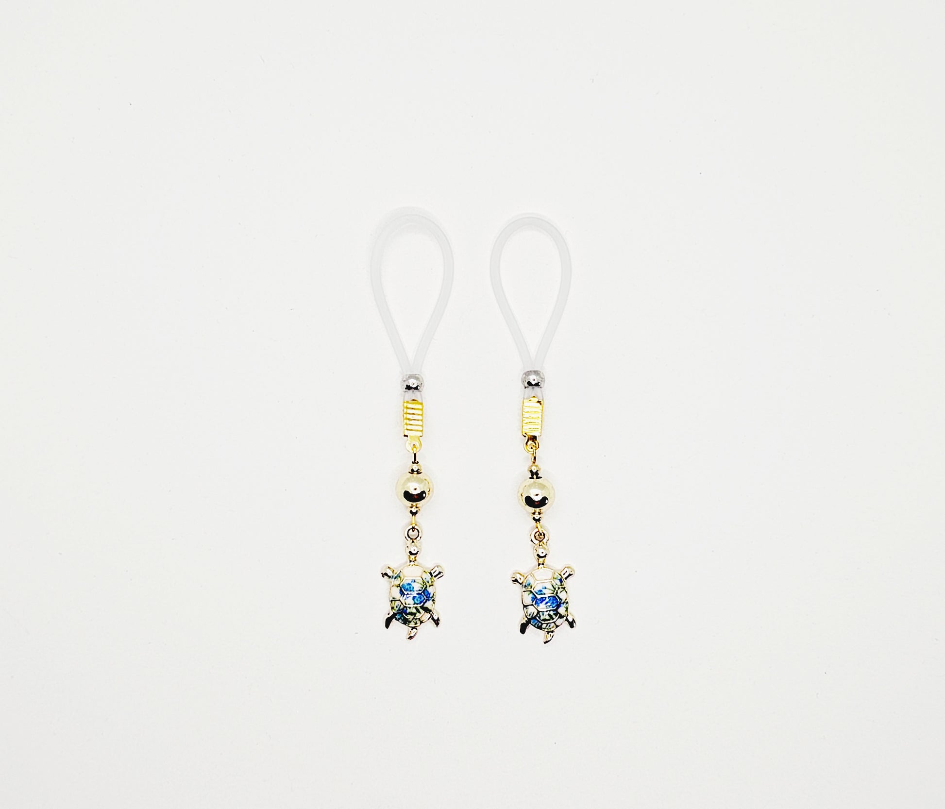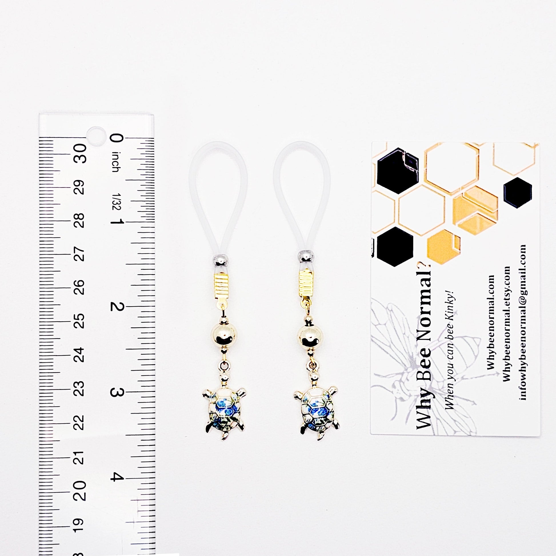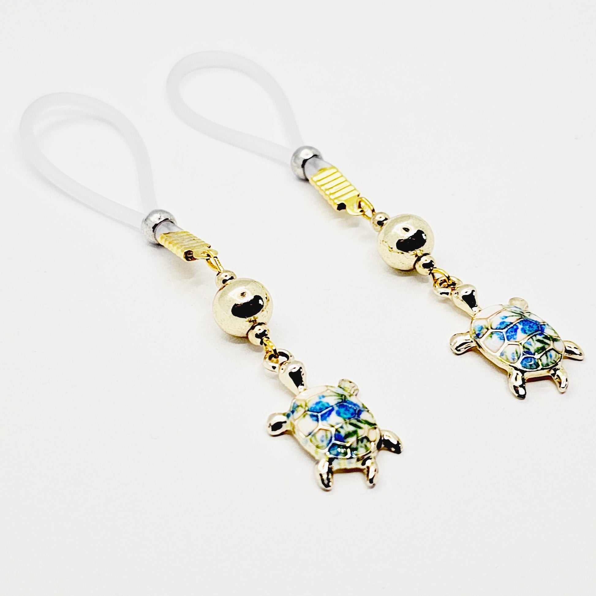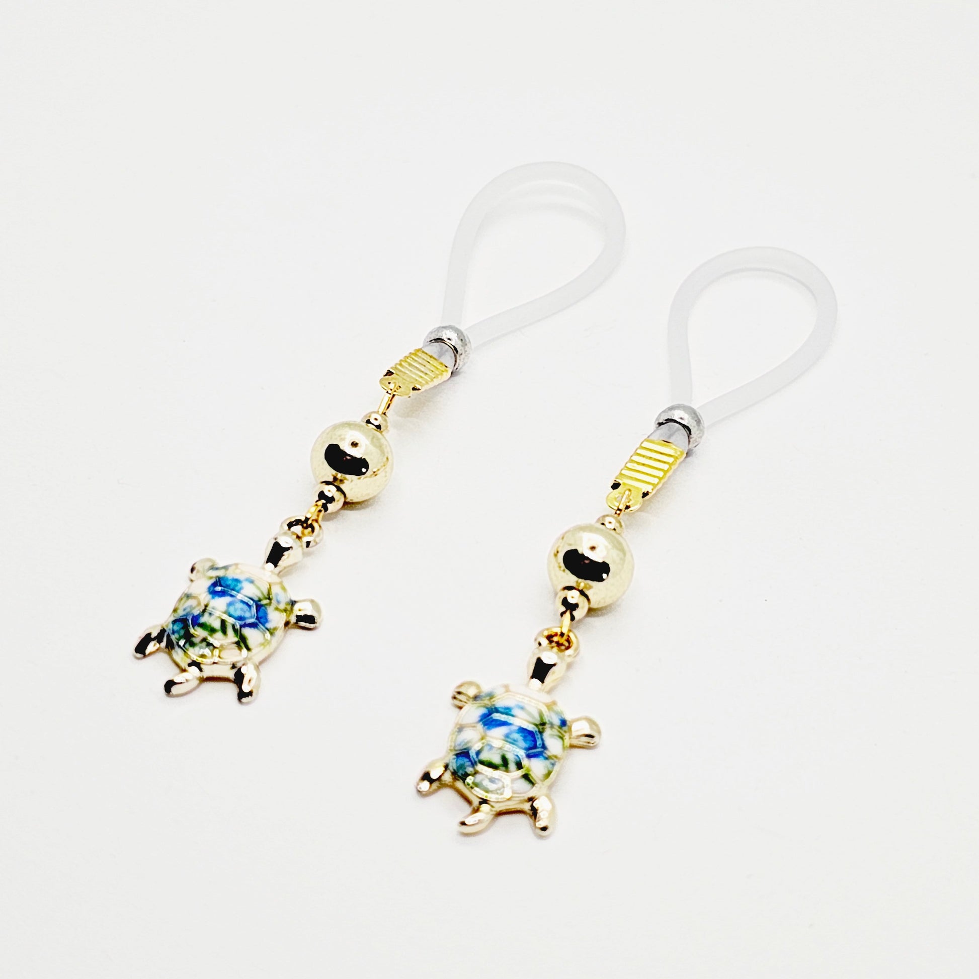 Nautical Non-Piercing Nipple Jewelry or Nipple Clamps! Pretty Painted Gold Sea Turtle Nipple Dangles, Blue or Pink, on Nipple Nooses (as shown) Or if you choose to "๐๐๐๐ ๐๐๐ ๐๐๐๐๐" with nipple clamps, we have several options to choose from. ๐ Adjustable, Tweezer, Alligator, C Clamps, and Clover Clamps available.
