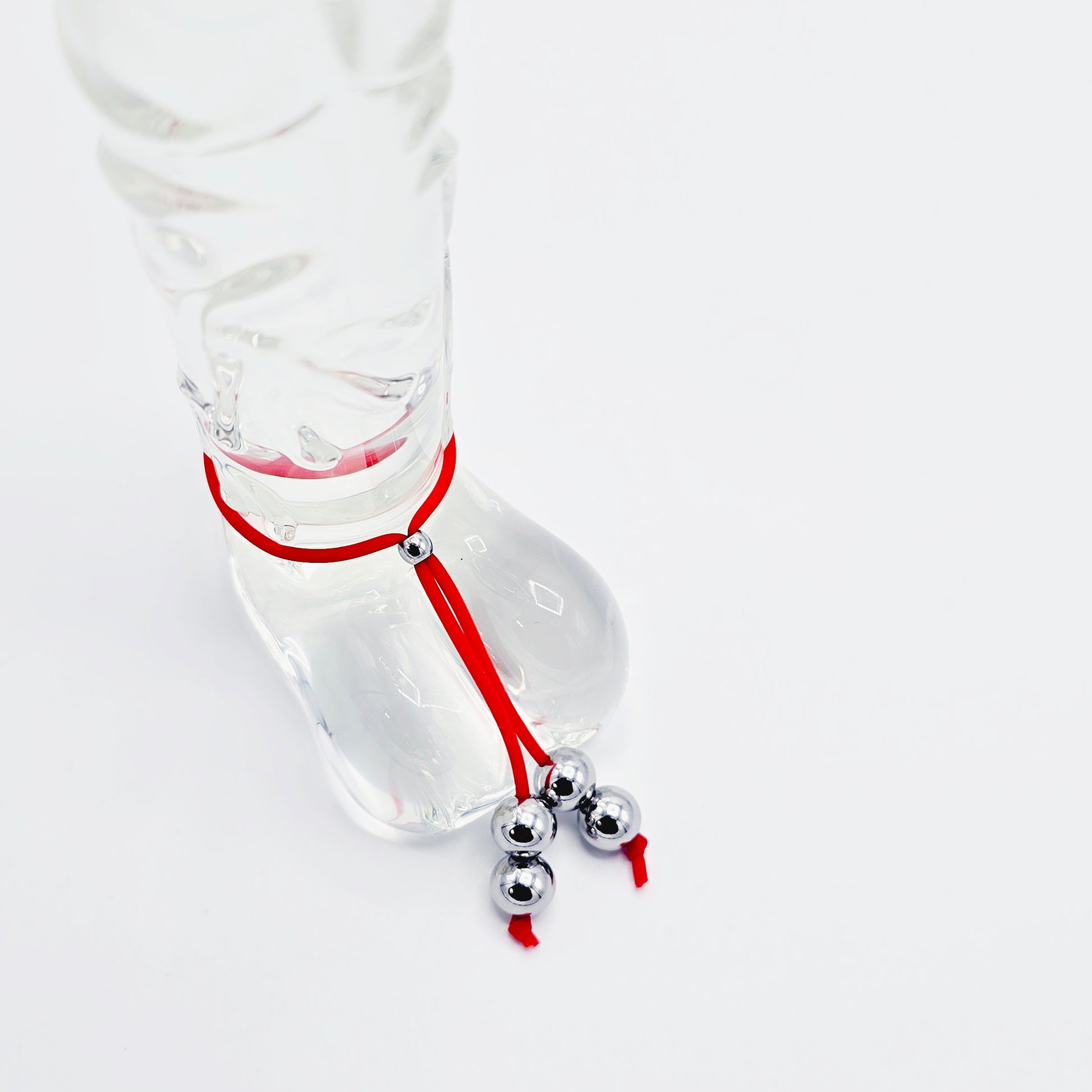 Red or Black Silicone Penis Noose with Stainless Steel Bead Weights. It is slightly stretchy, and the weights are not heavy. They are just there to give it enough weight so that you can feel it there, and click together lightly ;)